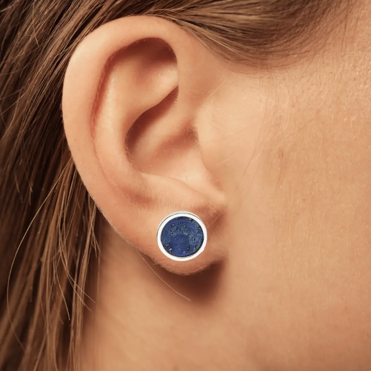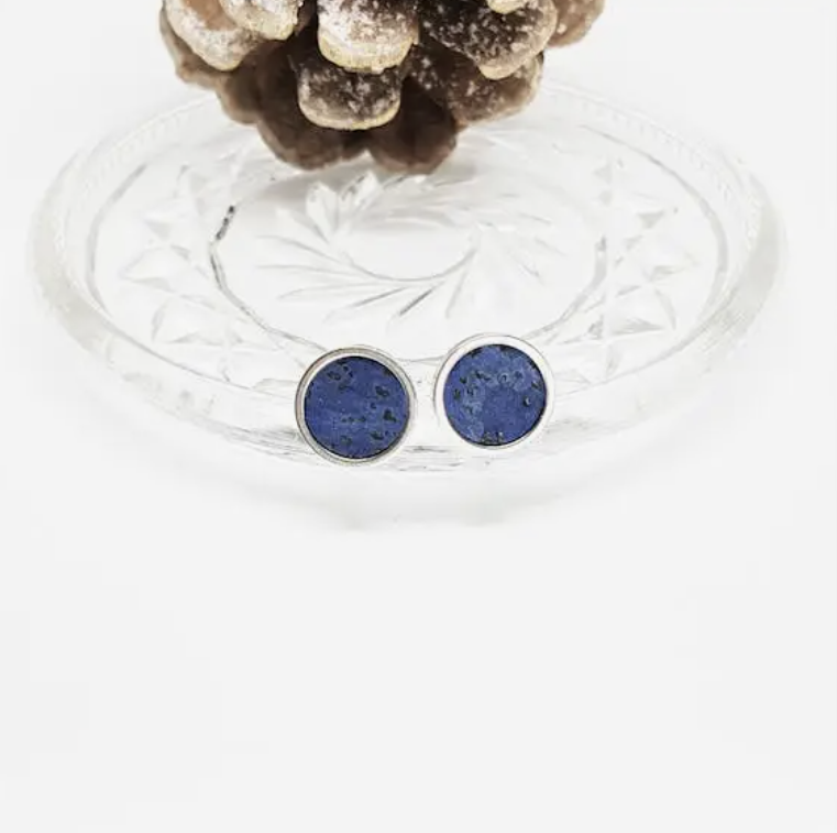 Disse fine øreringe er som små dryp af ro og nærvær i en travl hverdag. I midten sidder et smukt stykke blåt kork fra Portugal – omgivet af rustfrit stål, der holder til hverdagsbrug, fest og alt det midt imellem. Korken gør hver ørering blød og levende i udtrykket, og det blå spiller flot sammen med både varme og kolde nuancer i garderoben.
