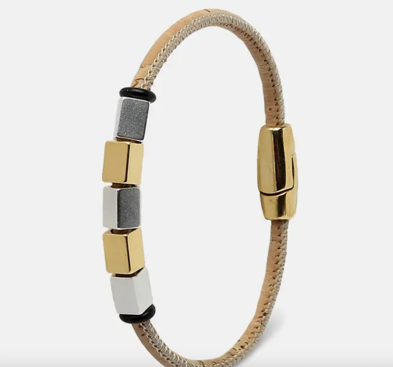 Armbåndet er lavet af kork, som høstes fra de fredede korkegetræer i Portugal. Disse træer spiller en vigtig rolle i at reducere CO2 i atmosfæren, og korkhøsten er en skånsom proces, der ikke skader træerne. Faktisk er korkegetræer beskyttede, hvilket betyder, at de fortsætter med at vokse og trives, mens de bidrager til et sundt og stabilt miljø.