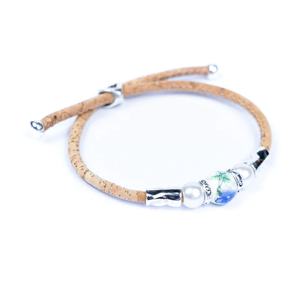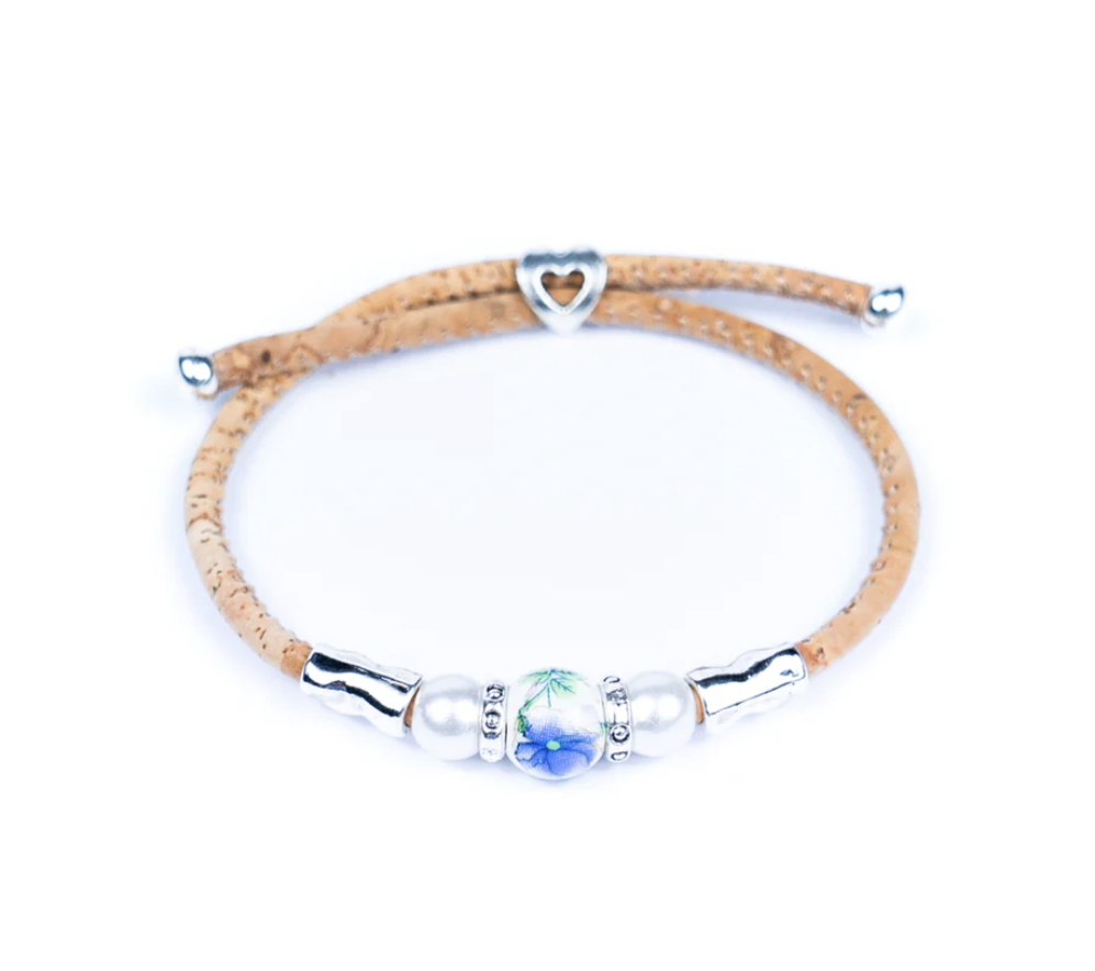 Dette smukke armbånd er skabt til dig, der elsker de små detaljer, der gør en forskel. Remmen er lavet af blød, naturlig kork og prydet med en fin keramikperle i blå og grønne blomstermønstre – som en lille forårshilsen, du kan bære hele året.