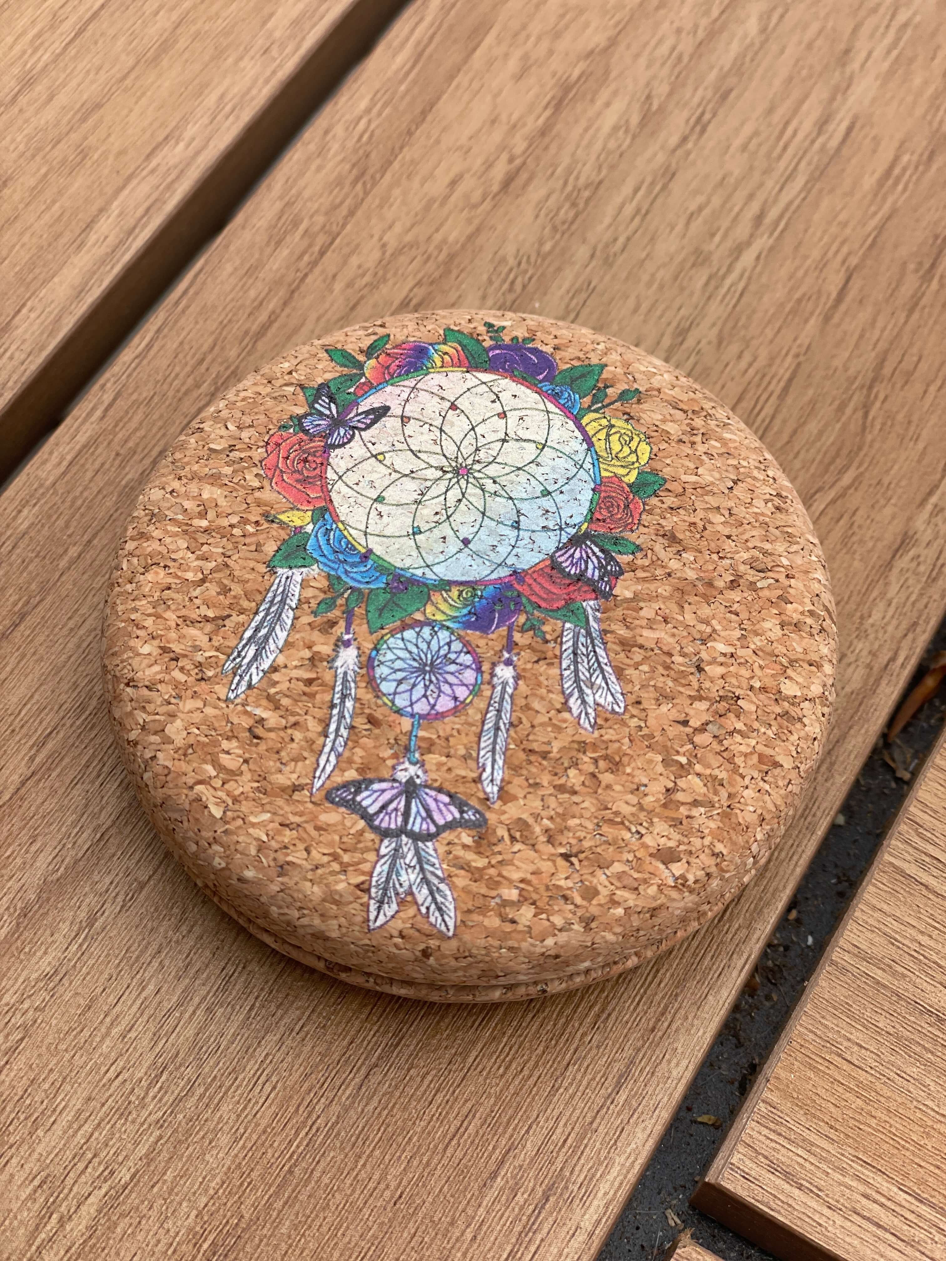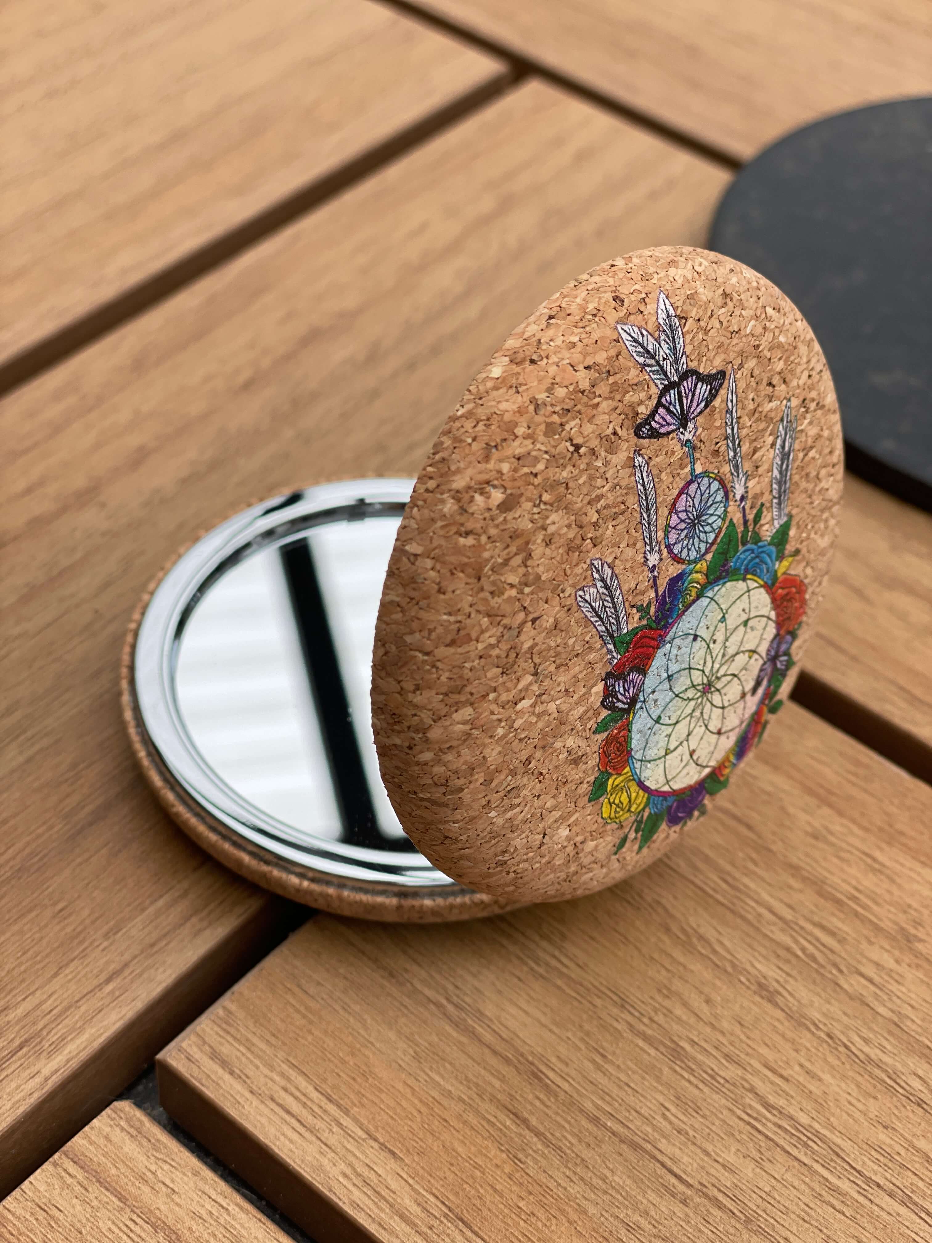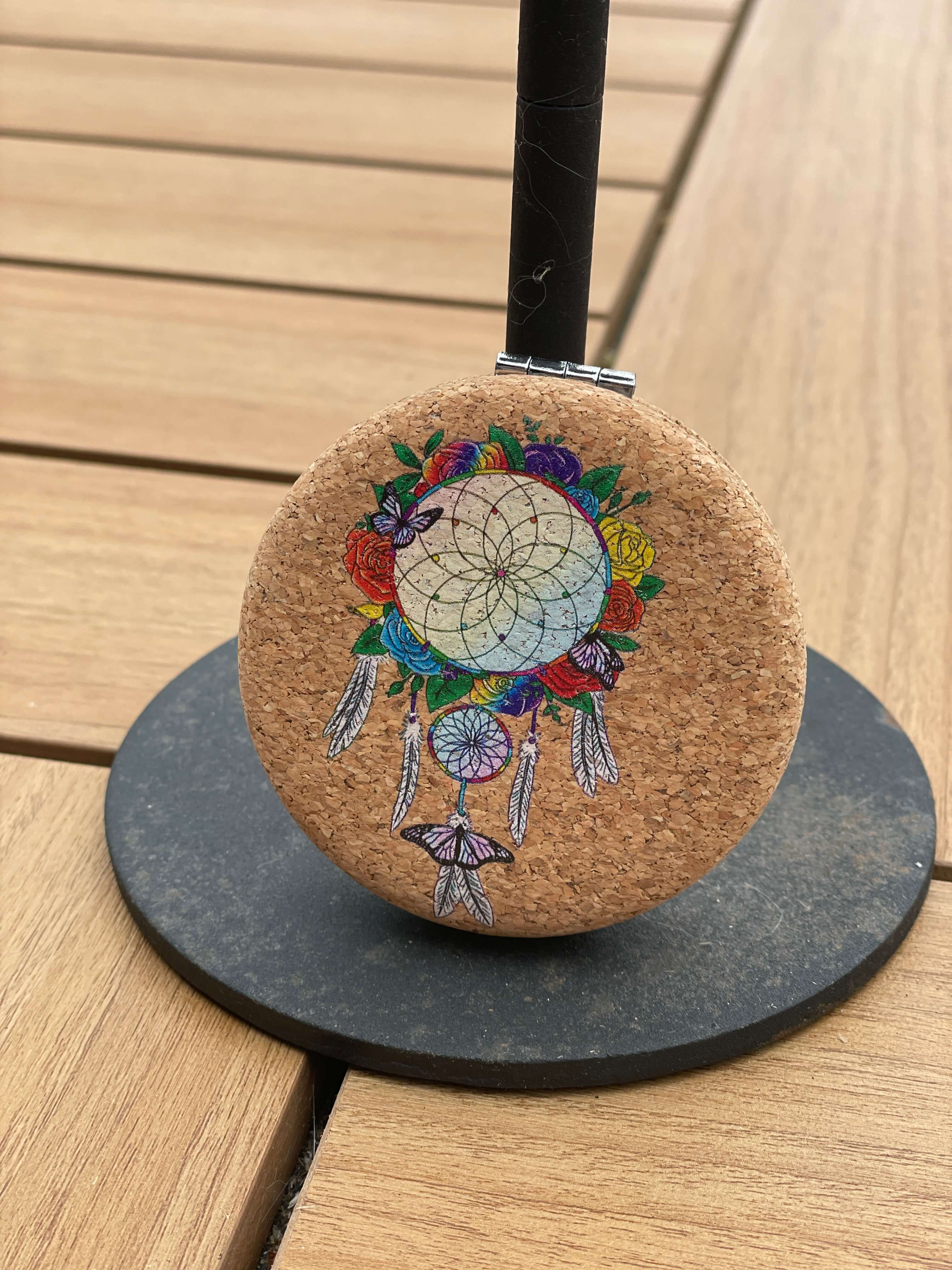 Nogle ting gør bare hverdagen lidt smukkere – og dette håndspejl er én af dem. Spejlet har et drømmefanger-mønster, hvilket giver det et legende, kærligt og poetisk udtryk. Den farverige dekoration på den naturlige korkoverflade gør spejlet til et lille kunstværk, som både er funktionelt og dekorativt.