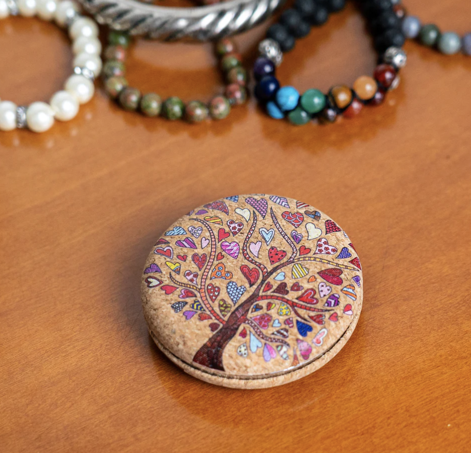 Håndspejl i kork med mønster af et træ med hjerter – funktionalitet med et kærligt touch