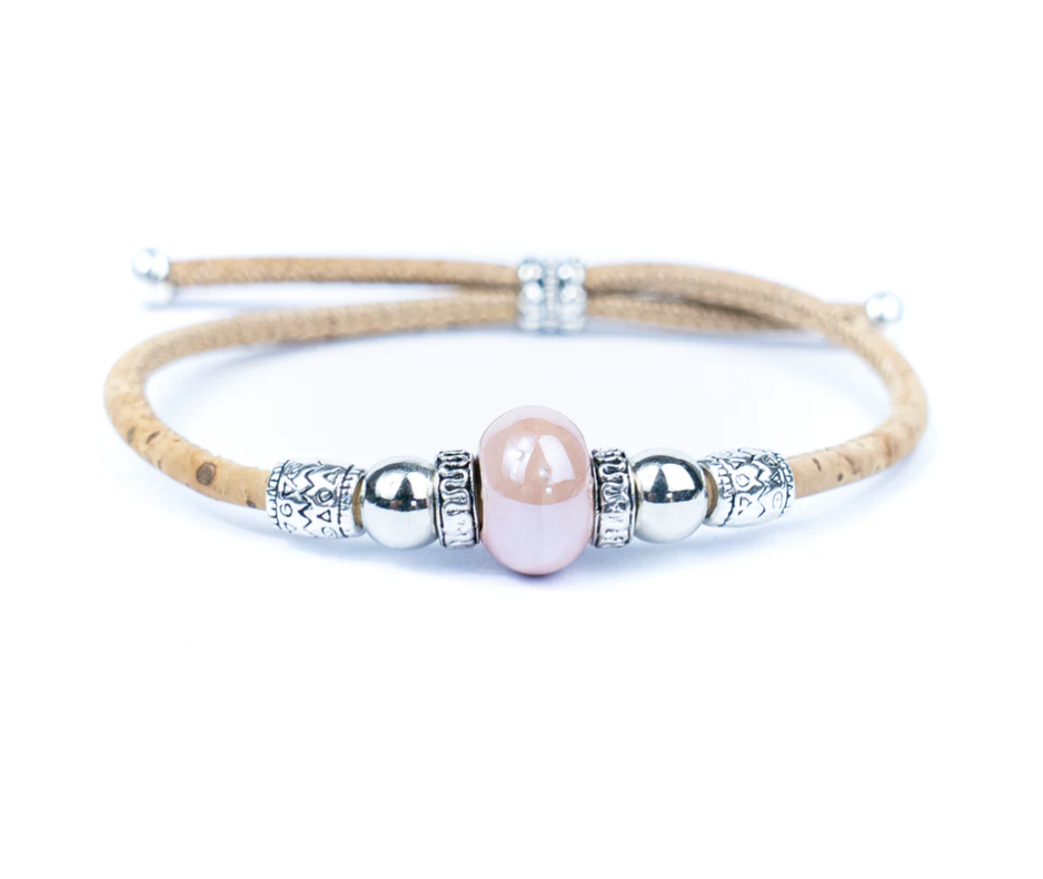 Dette armbånd er som en kærlig hilsen, du kan bære med dig hver dag. Remmen er lavet i blødt, naturligt kork, og midtpunktet er en fin skinnende lyserød keramikperle, der tilføjer et strejf af varme og personlighed.
