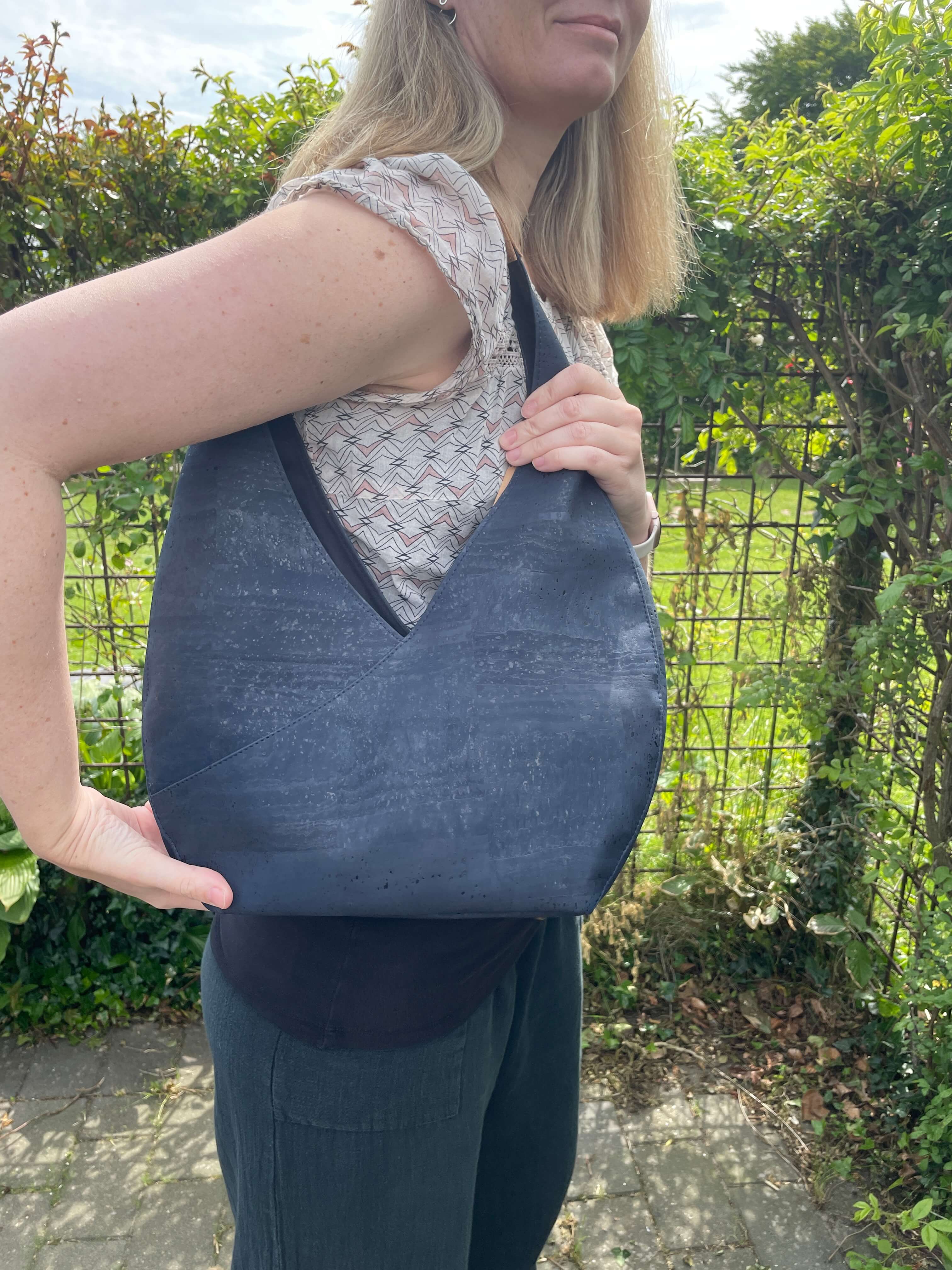 Mørkeblå korktaske med naturfarvet rem – rummelig, blød og klar til hverdagen
