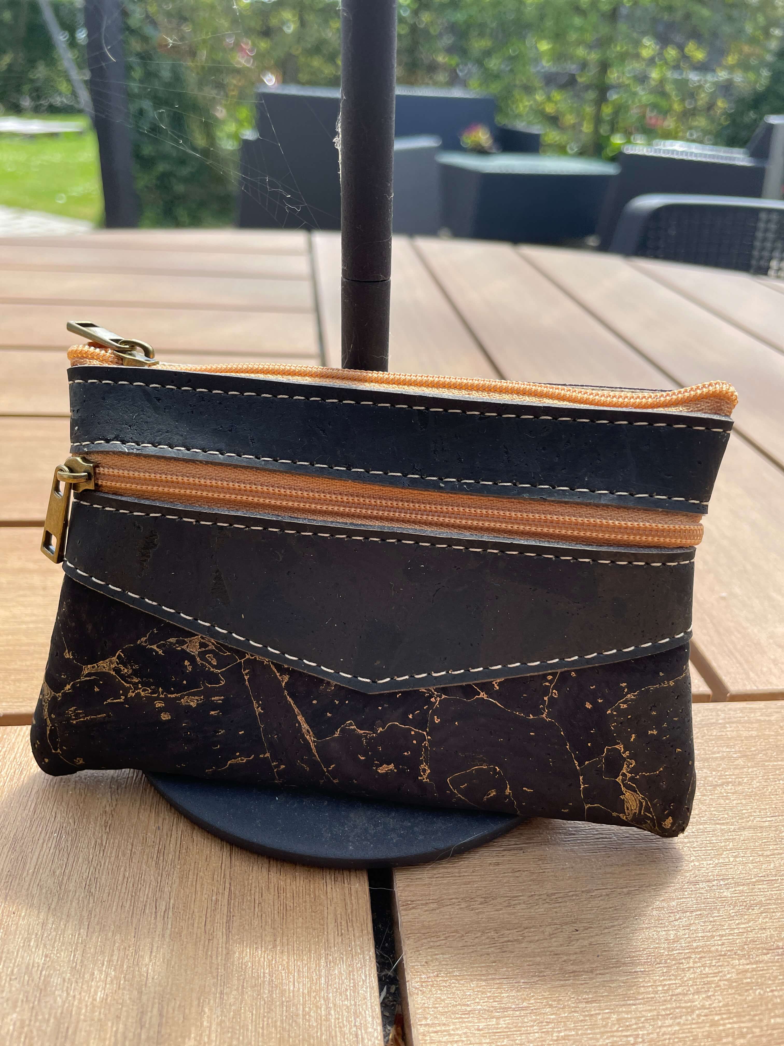 Lille møntpung i mørkeblå kork med et strejf af guld – når enkelthed får lidt ekstra glans