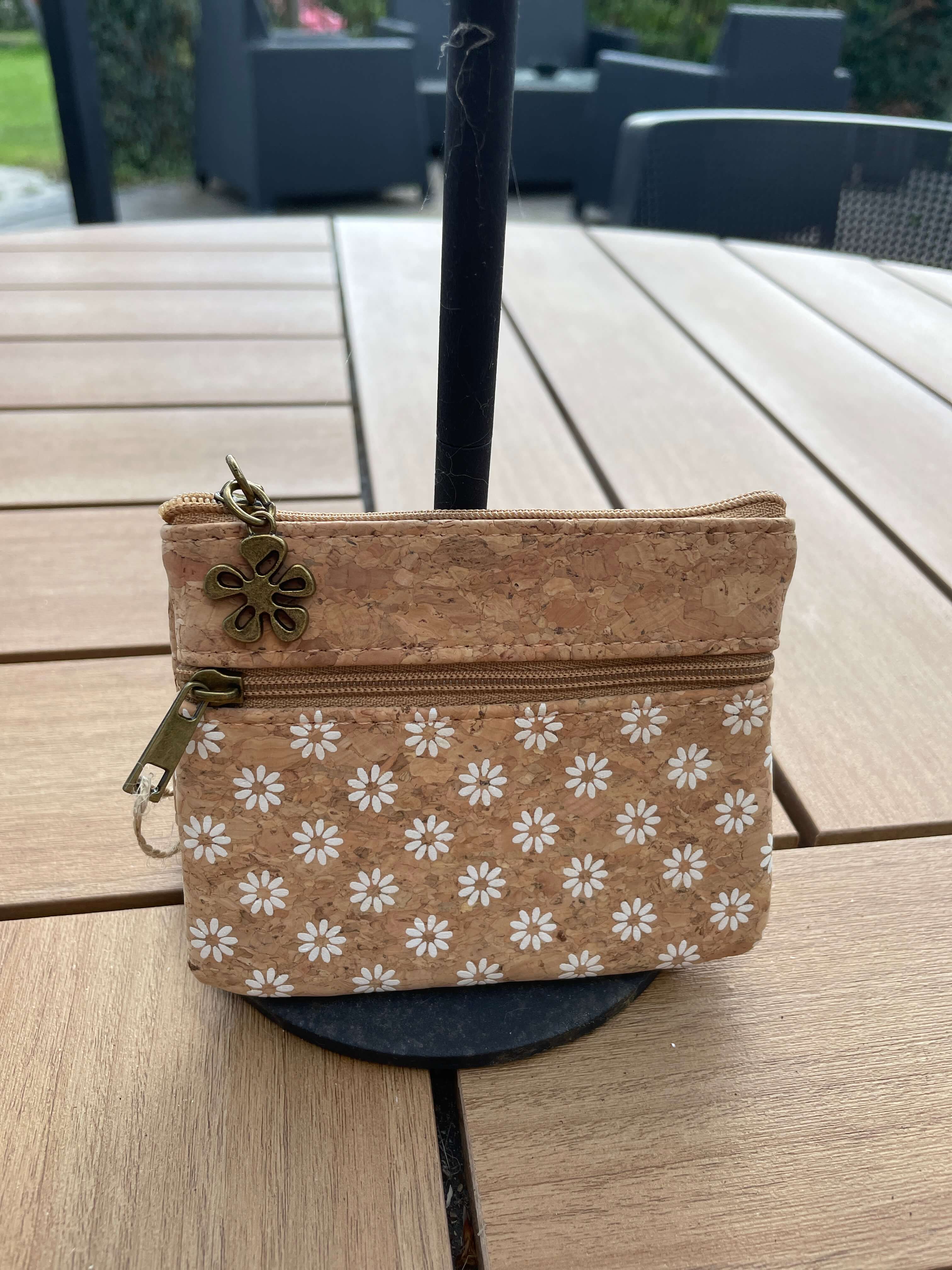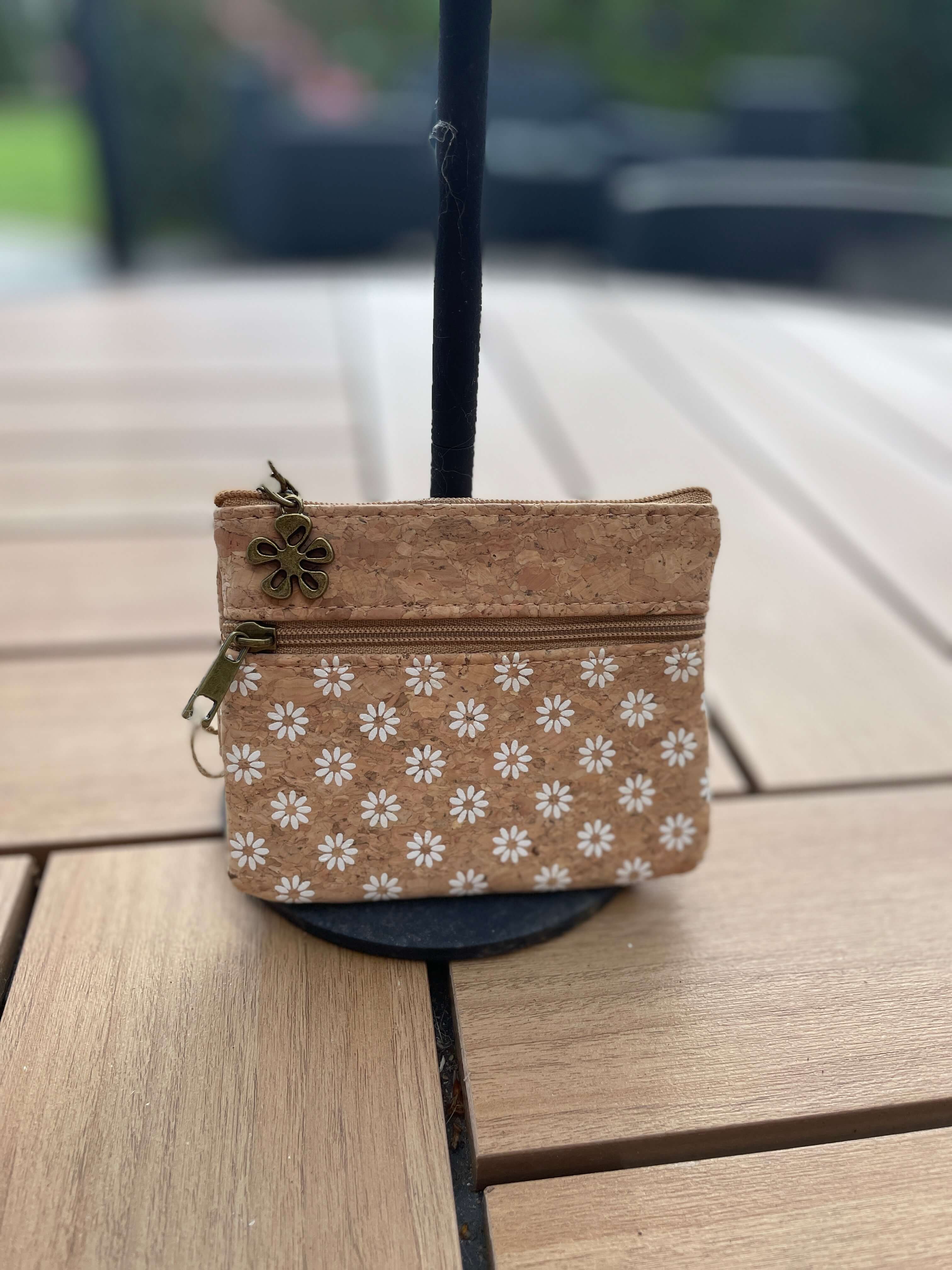 Denne fine pung i naturkork med hvidt blomstermønster er en skøn løsning til dig, der vil have styr på mønter, kort og småting – uden at slæbe for meget med.