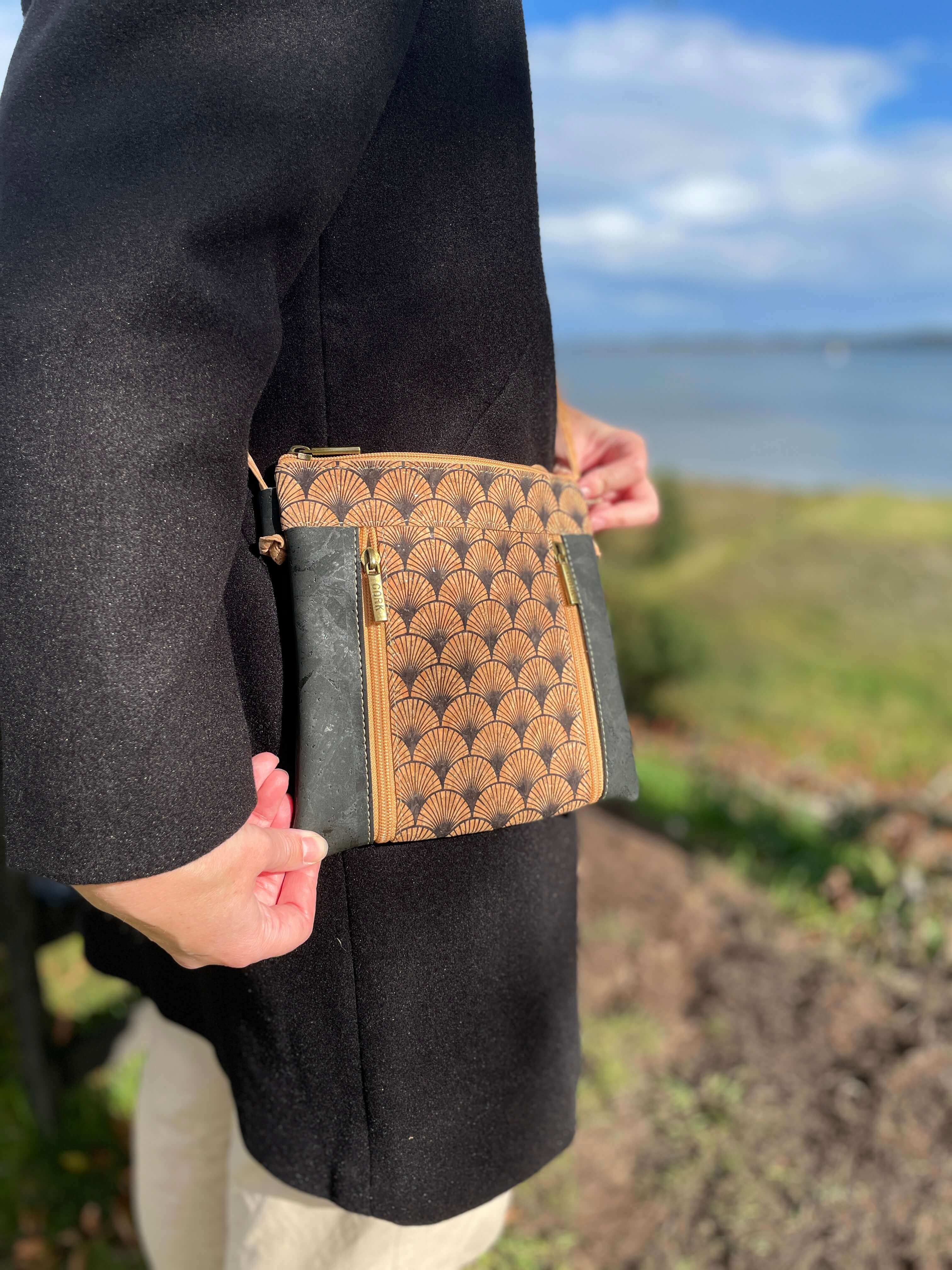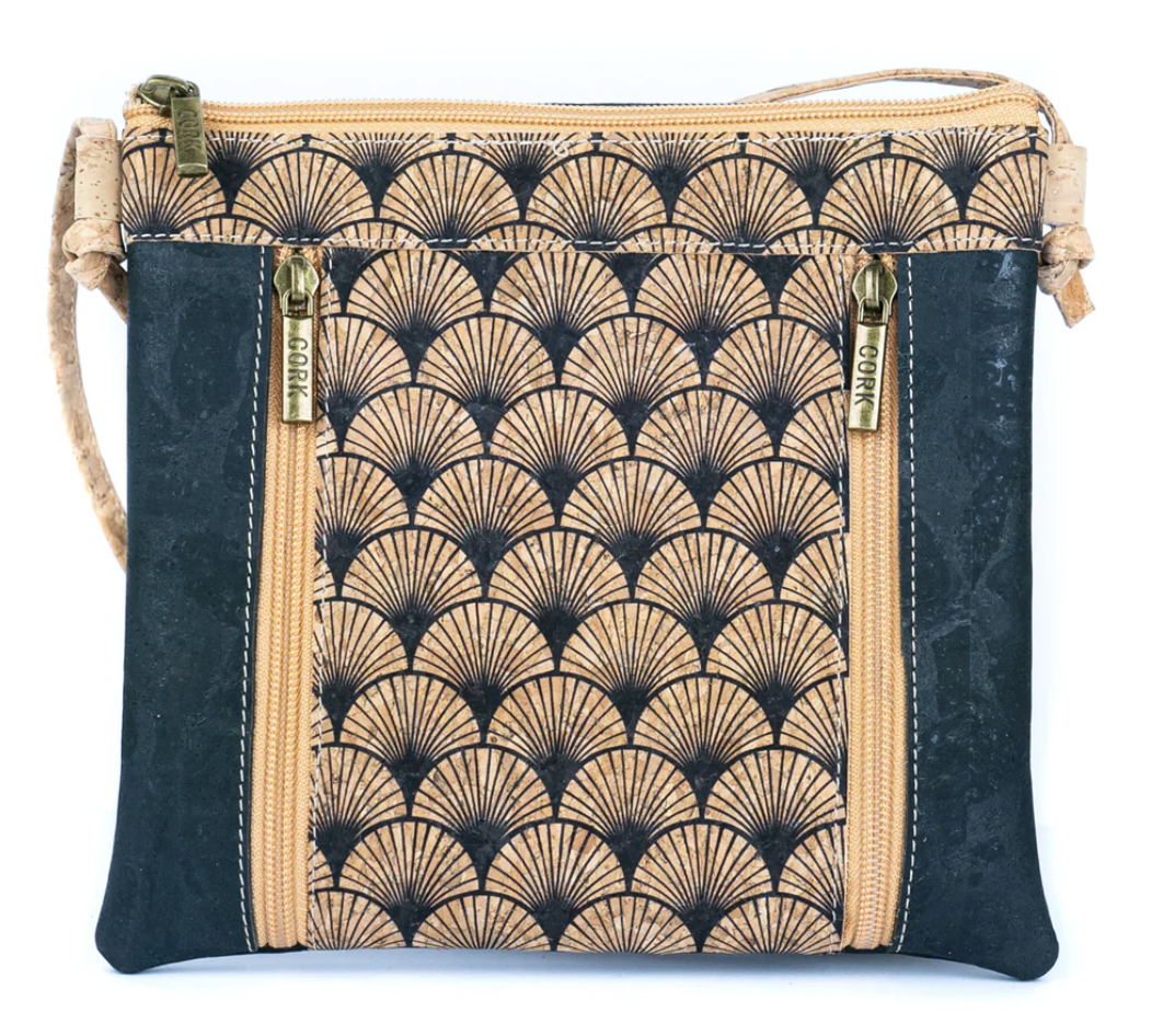 Denne smukke korktaske i mørkeblå kombinerer stil, funktion og personlighed i ét. Midt på tasken løber et flot, detaljeret mønster, der giver et unikt udtryk og masser af charme – perfekt til dig, der elsker de små detaljer.