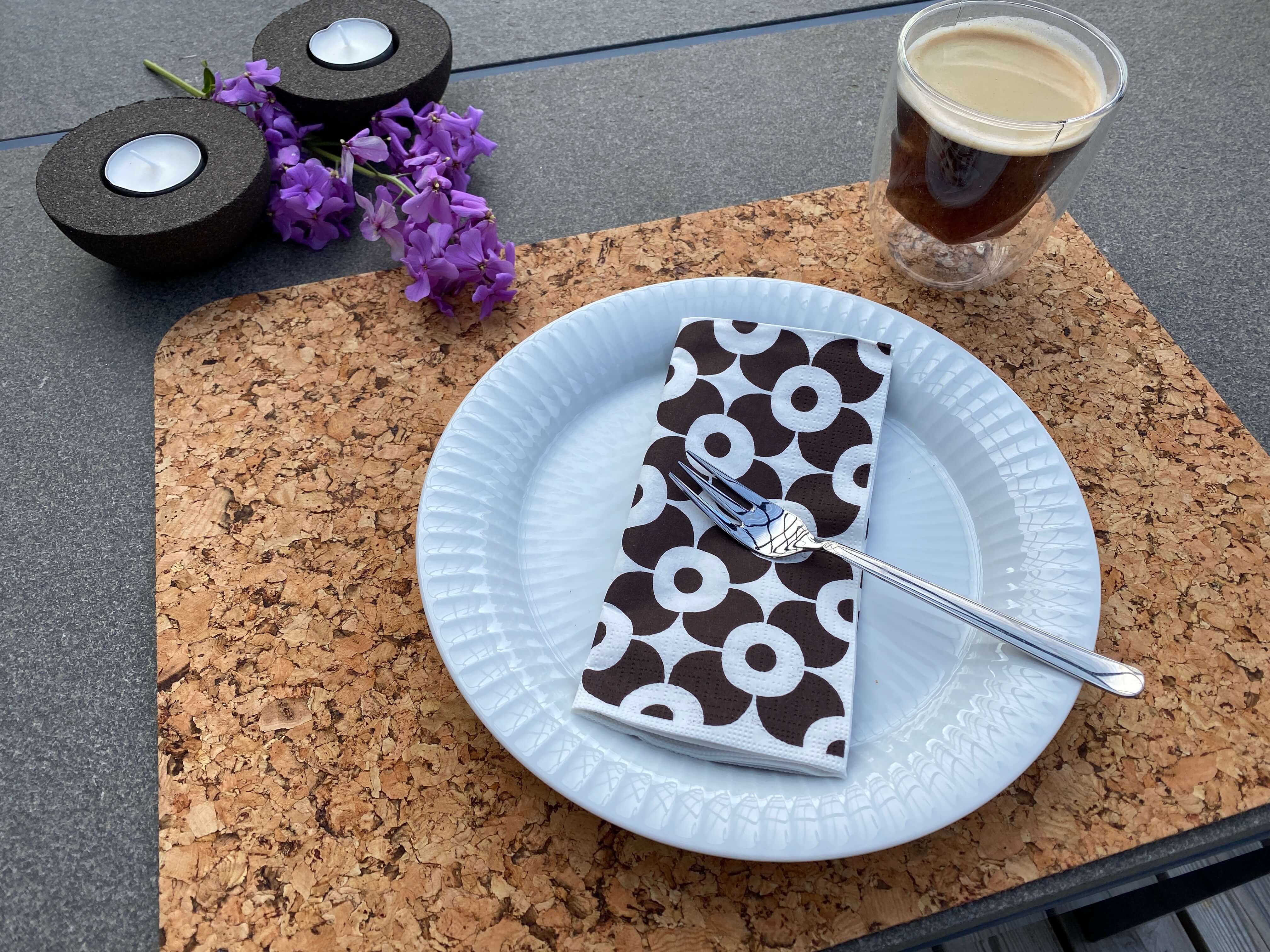 Dækkeservietten er produceret i Portugal, hvor korken høstes nænsomt fra korkegen – uden at træet fældes. Faktisk kan træet høstes igen og igen, og i hele sit liv optager det CO₂ fra luften. Det gør kork til et materiale med god energi og lang levetid.