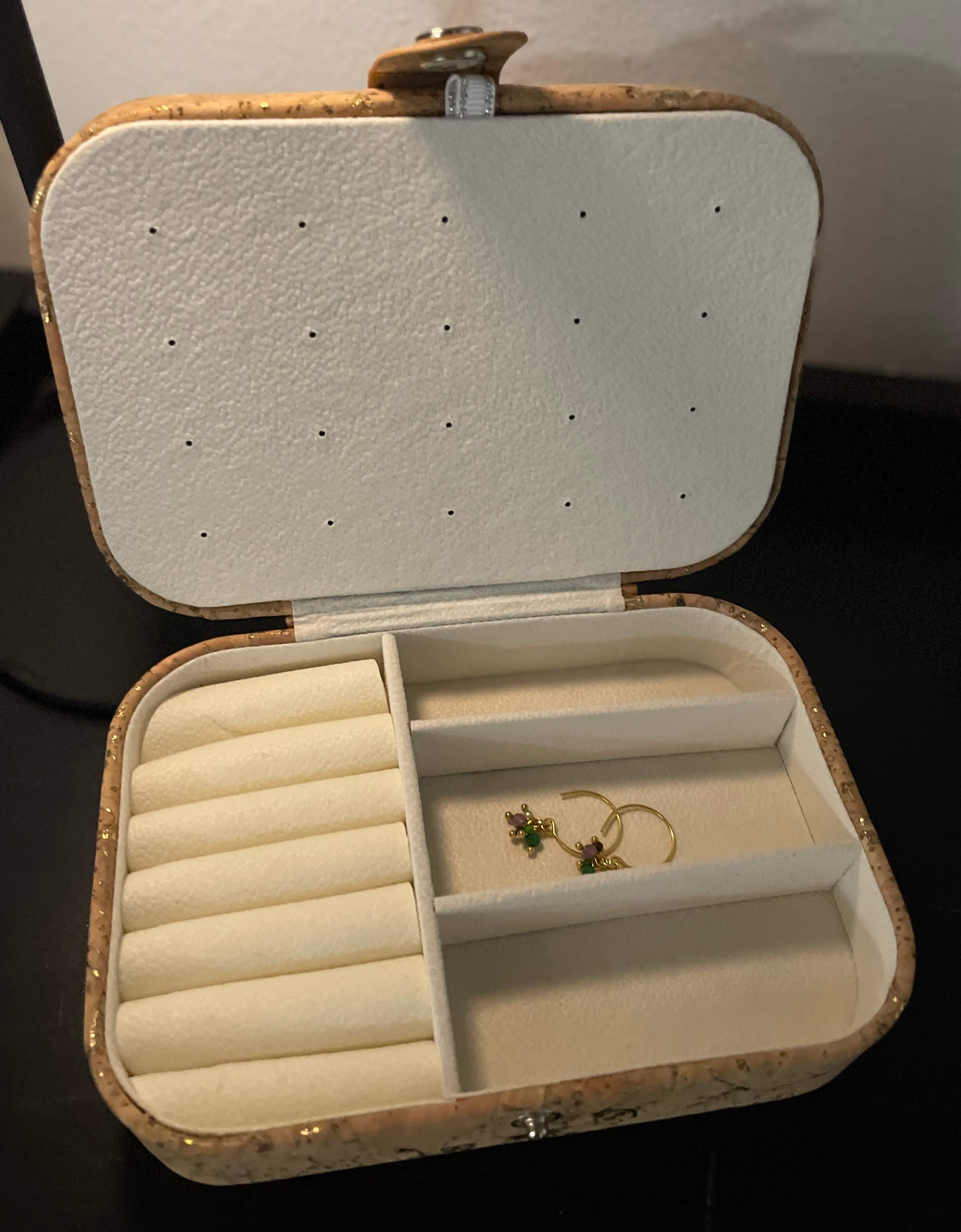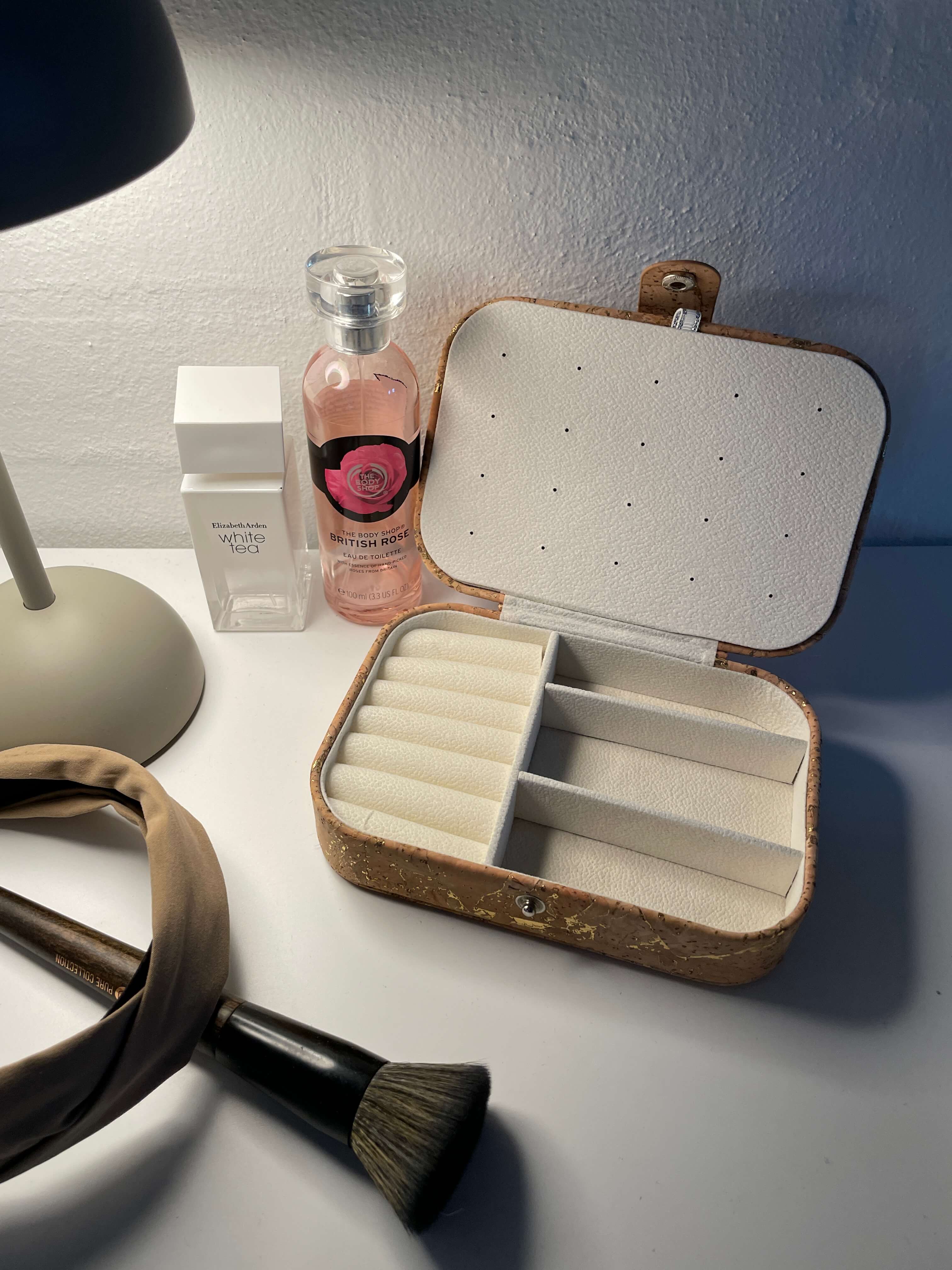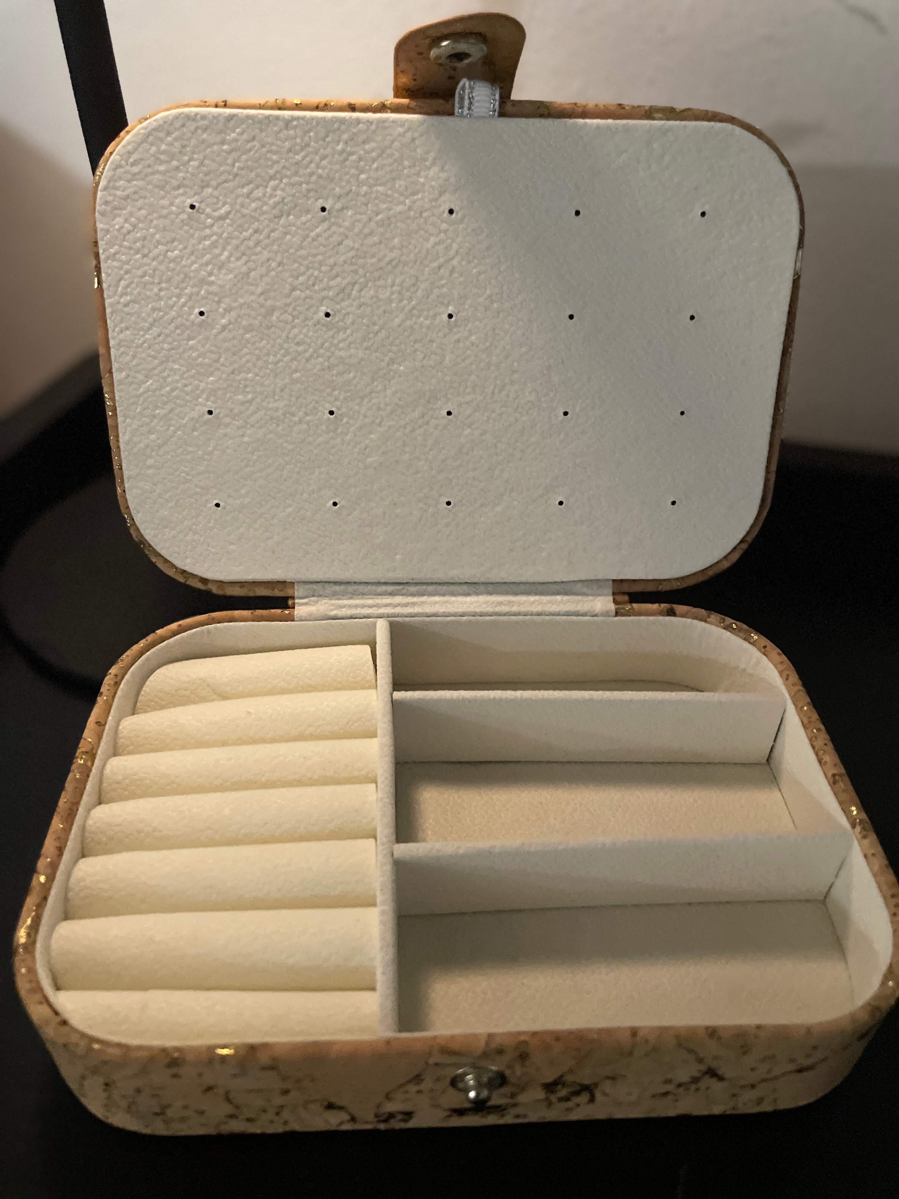 Dette elegante smykkeskrin i naturfarvet kork med fine guldnister er både stilfuldt og praktisk. Det giver dine smykker den opbevaring, de fortjener, samtidig med at det pynter smukt på sminkebordet, natbordet eller badeværelset.
