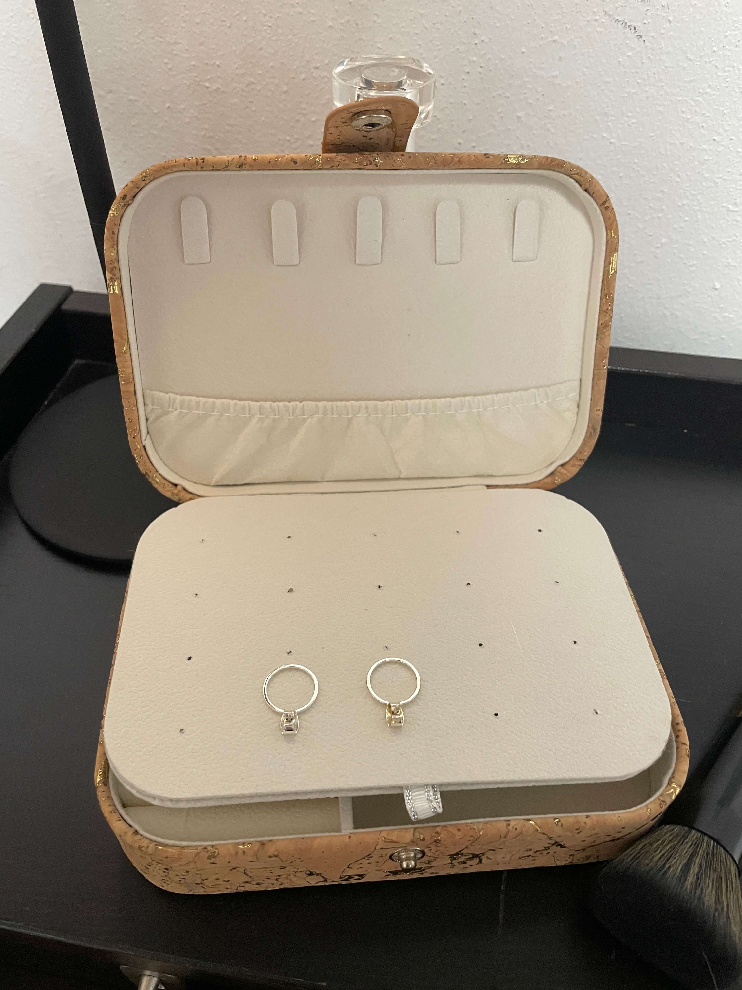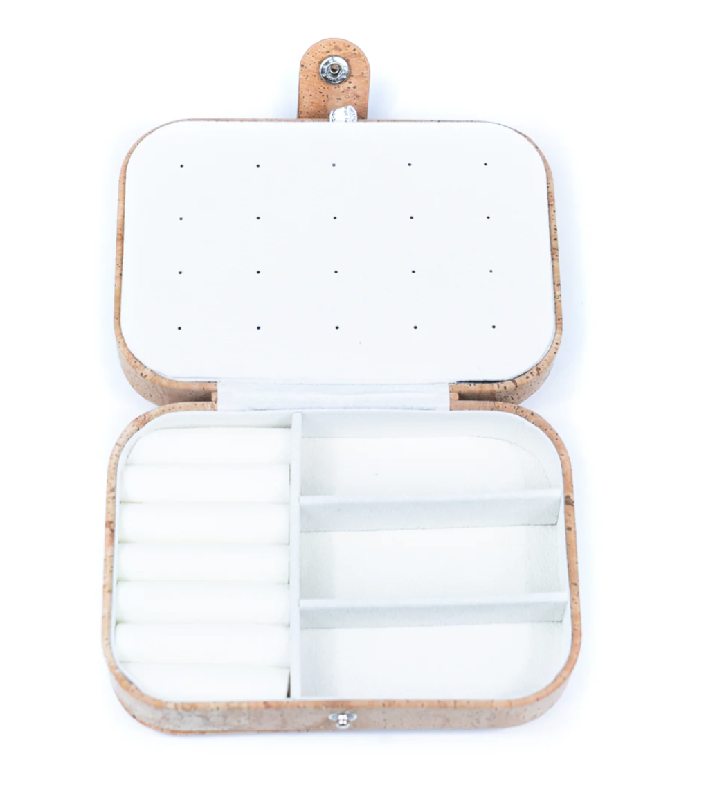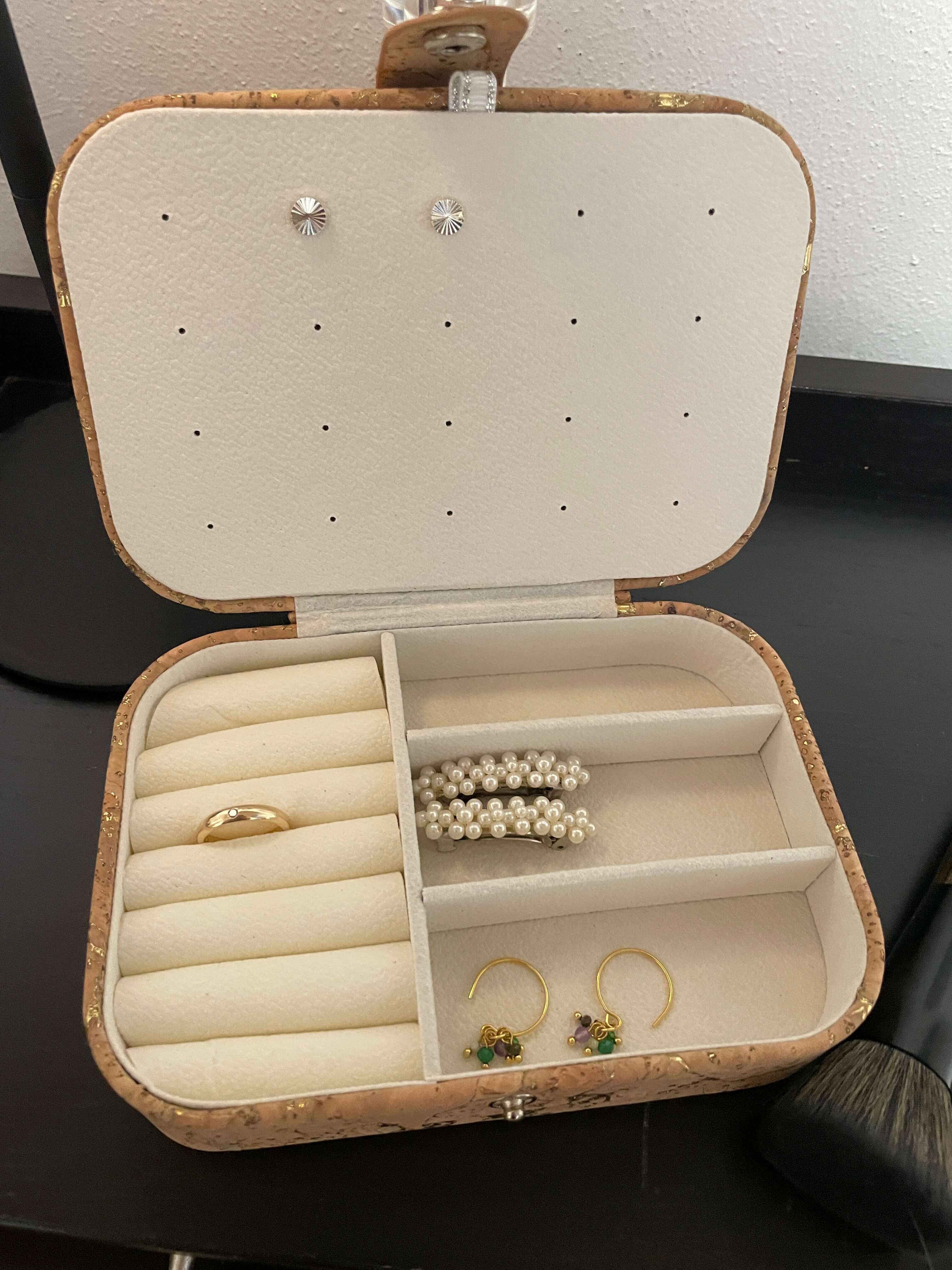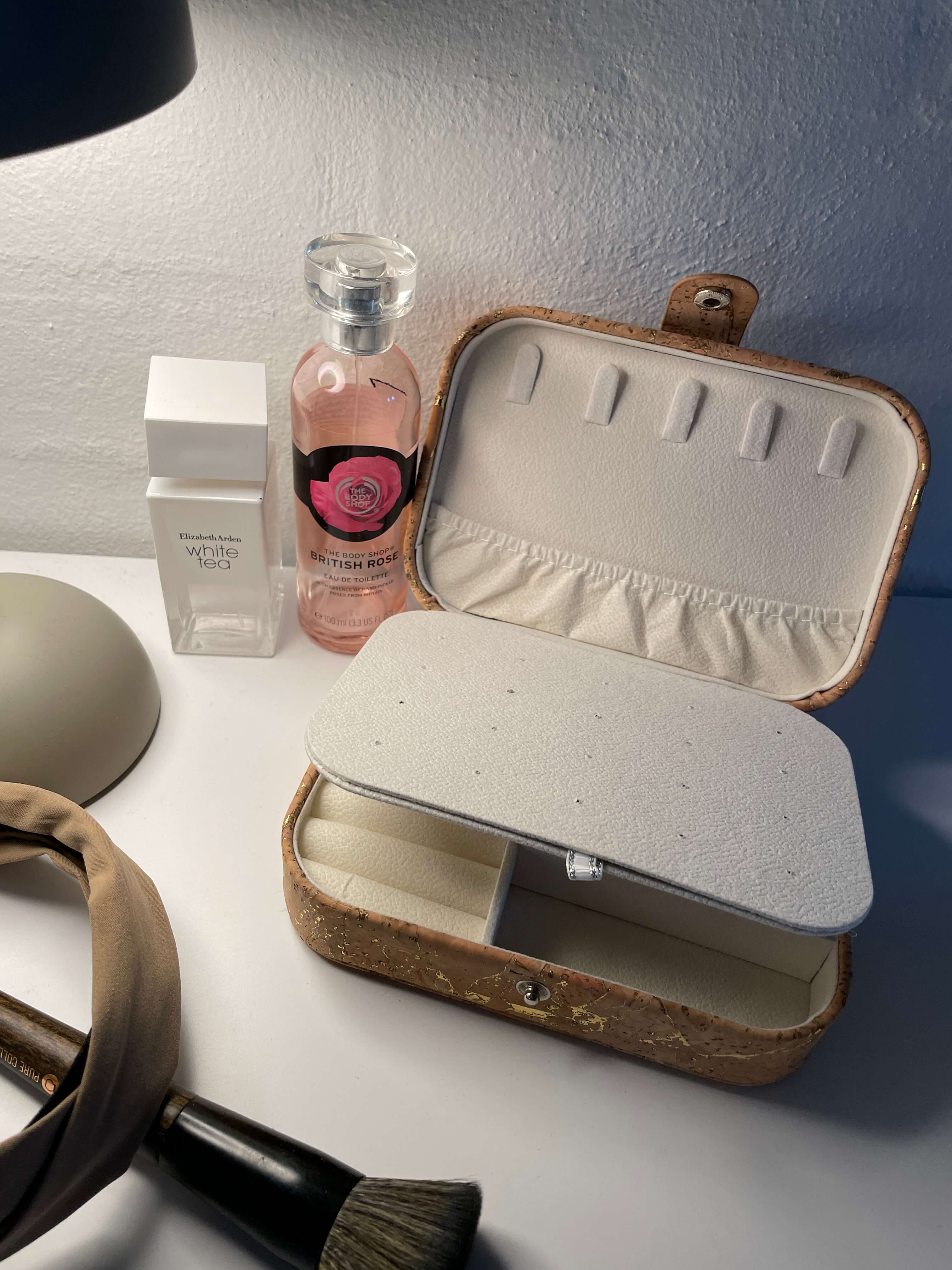 Dette elegante smykkeskrin i naturfarvet kork med fine guldnister er både stilfuldt og praktisk. Det giver dine smykker den opbevaring, de fortjener, samtidig med at det pynter smukt på sminkebordet, natbordet eller badeværelset.