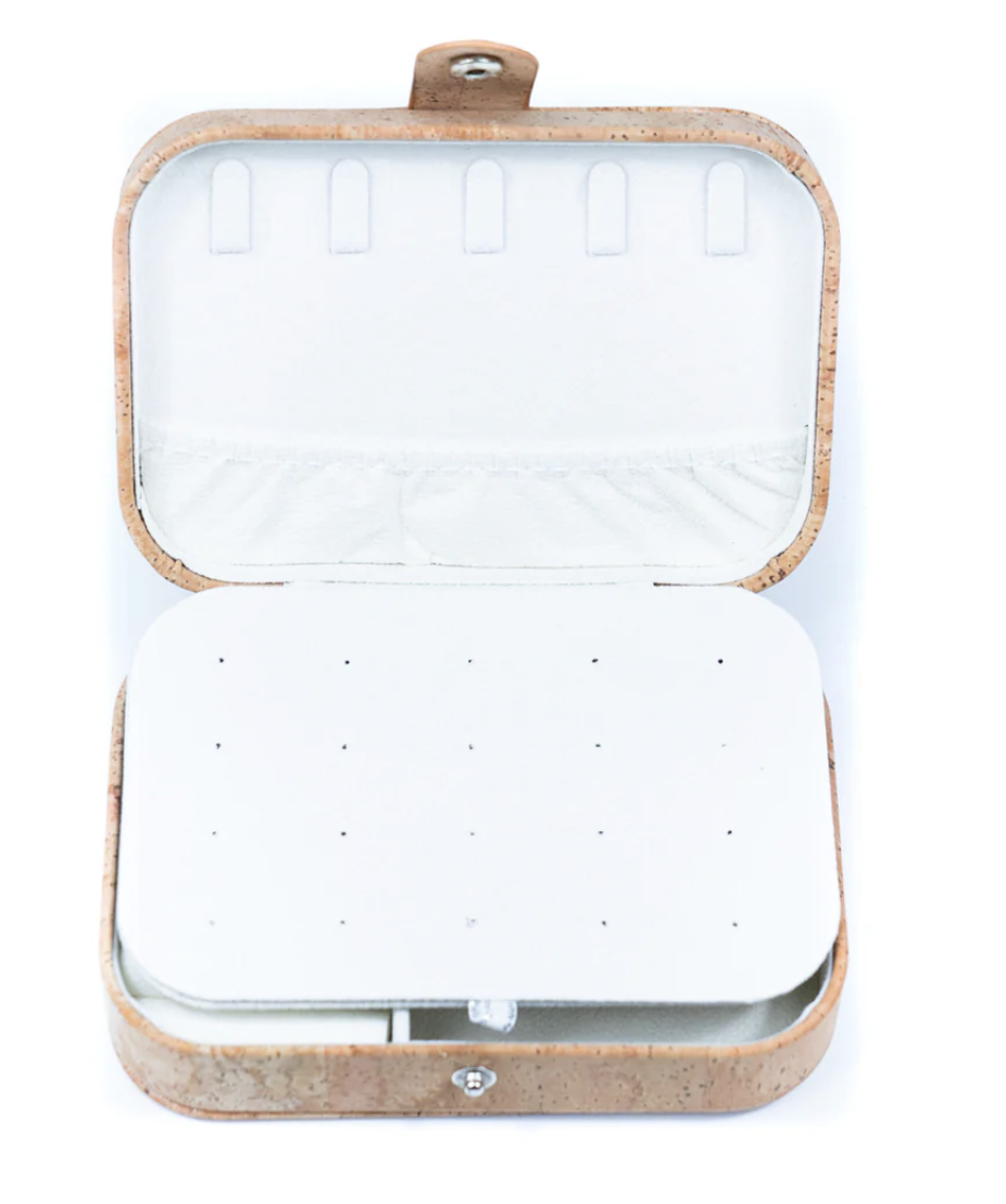 Skrinet har en rummelig og gennemtænkt indretning med to lag, der gør det nemt at organisere dine ringe, halskæder, armbånd og øreringe. Den bløde korkoverflade føles lækker at røre ved, mens den smudsafvisende egenskab sikrer, at smykkeskrinet forbliver pænt. Knaplåsen giver en elegant afslutning og holder dine smykker sikkert på plads – perfekt både hjemme og på farten.