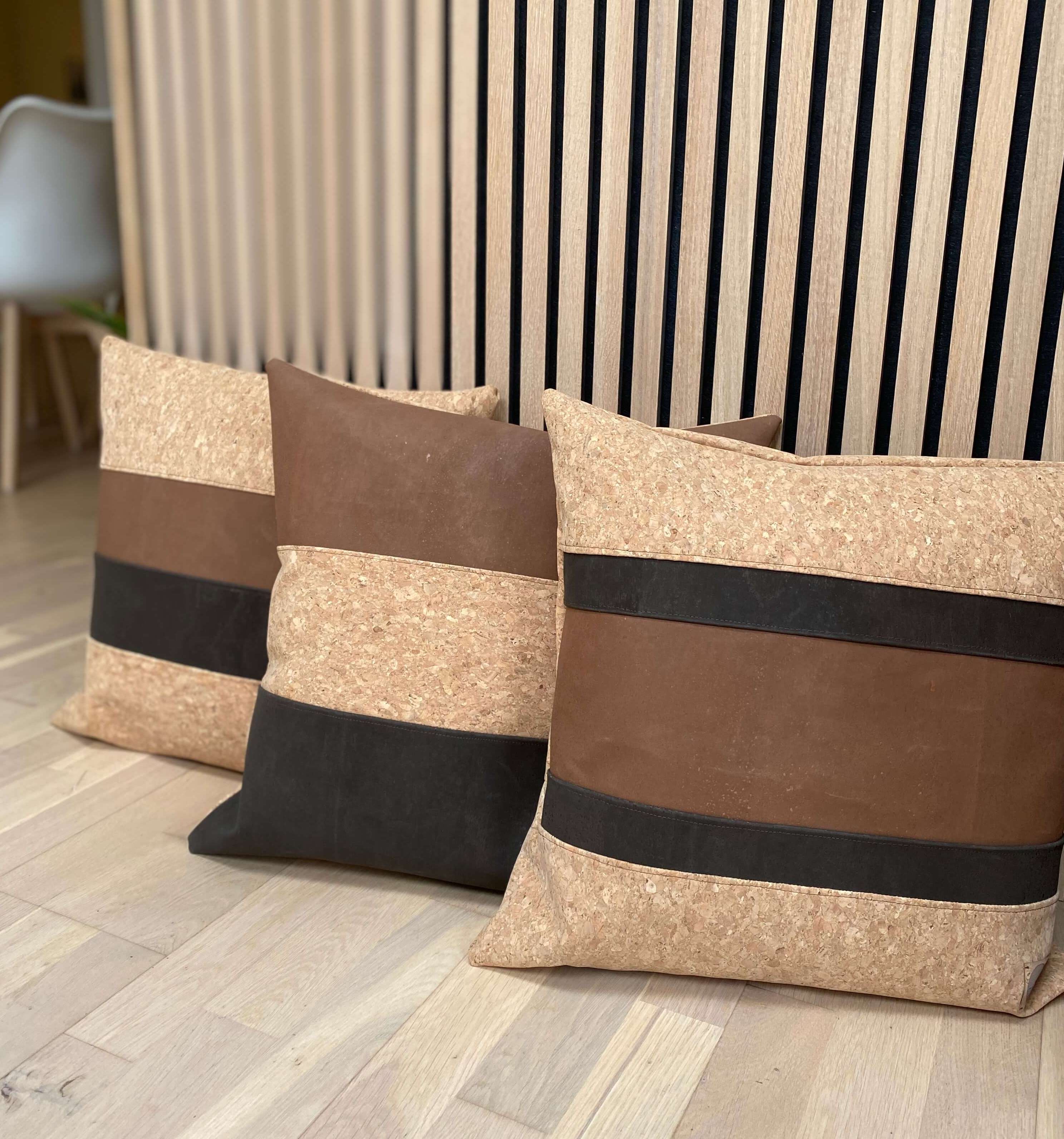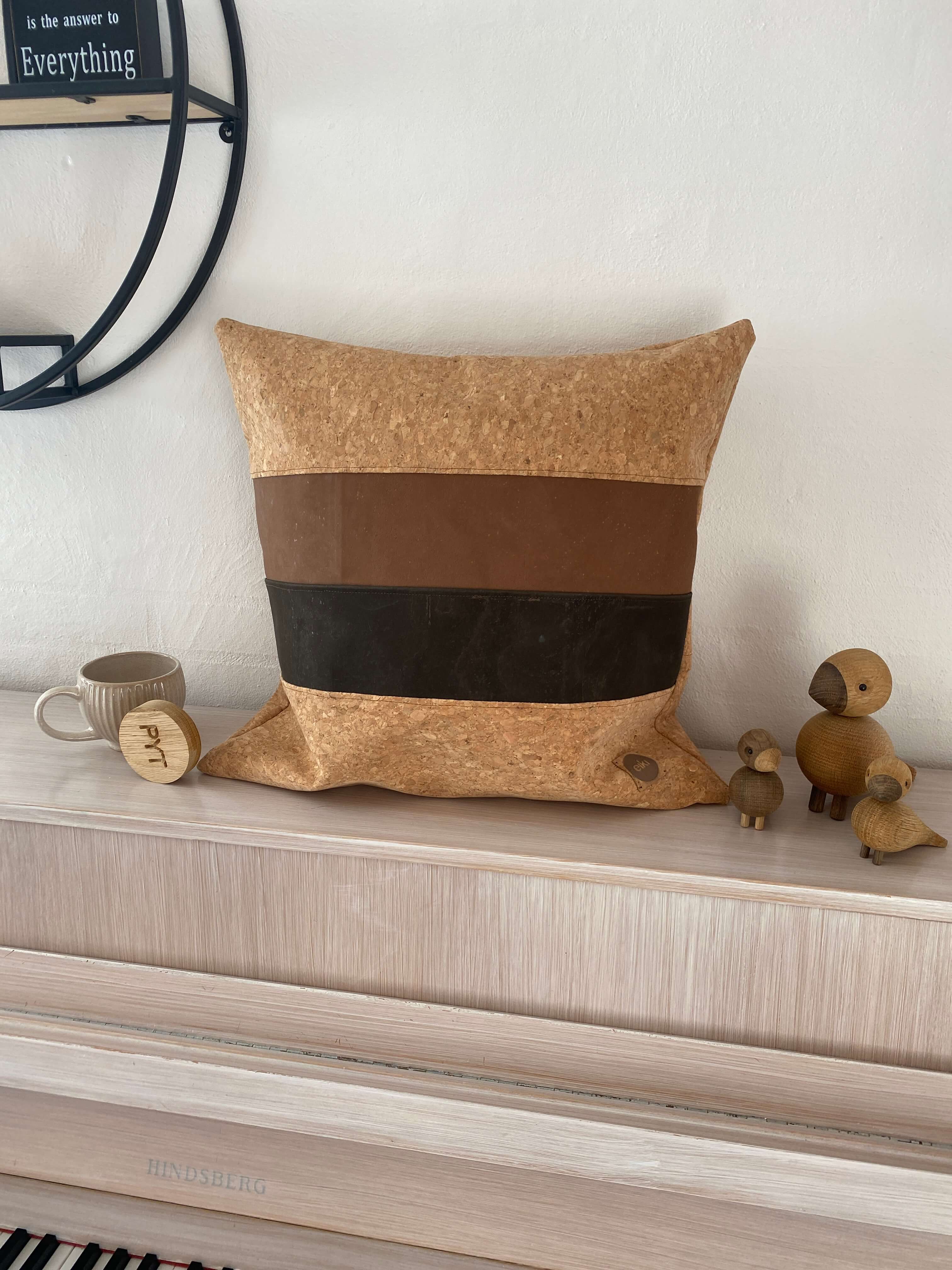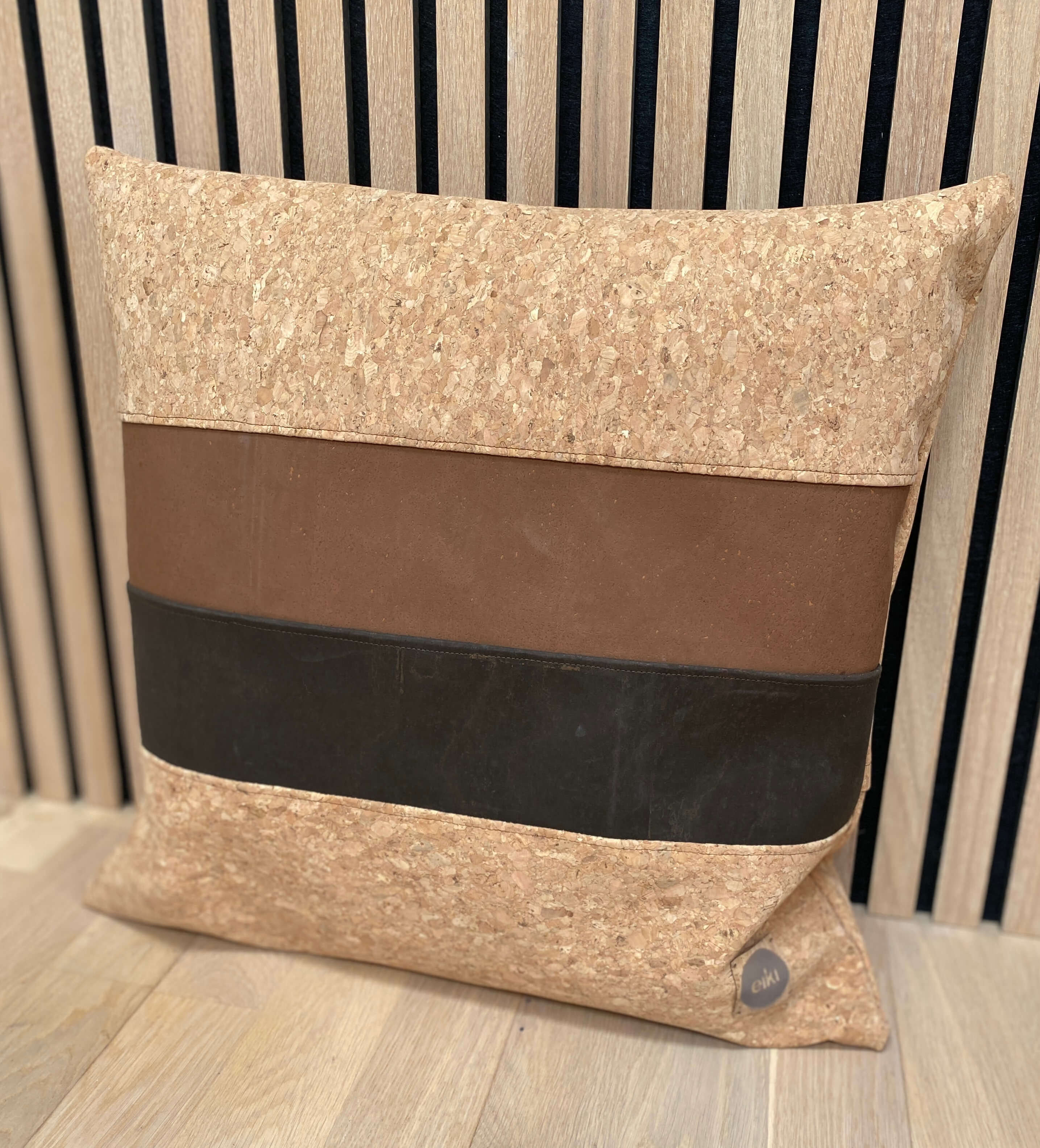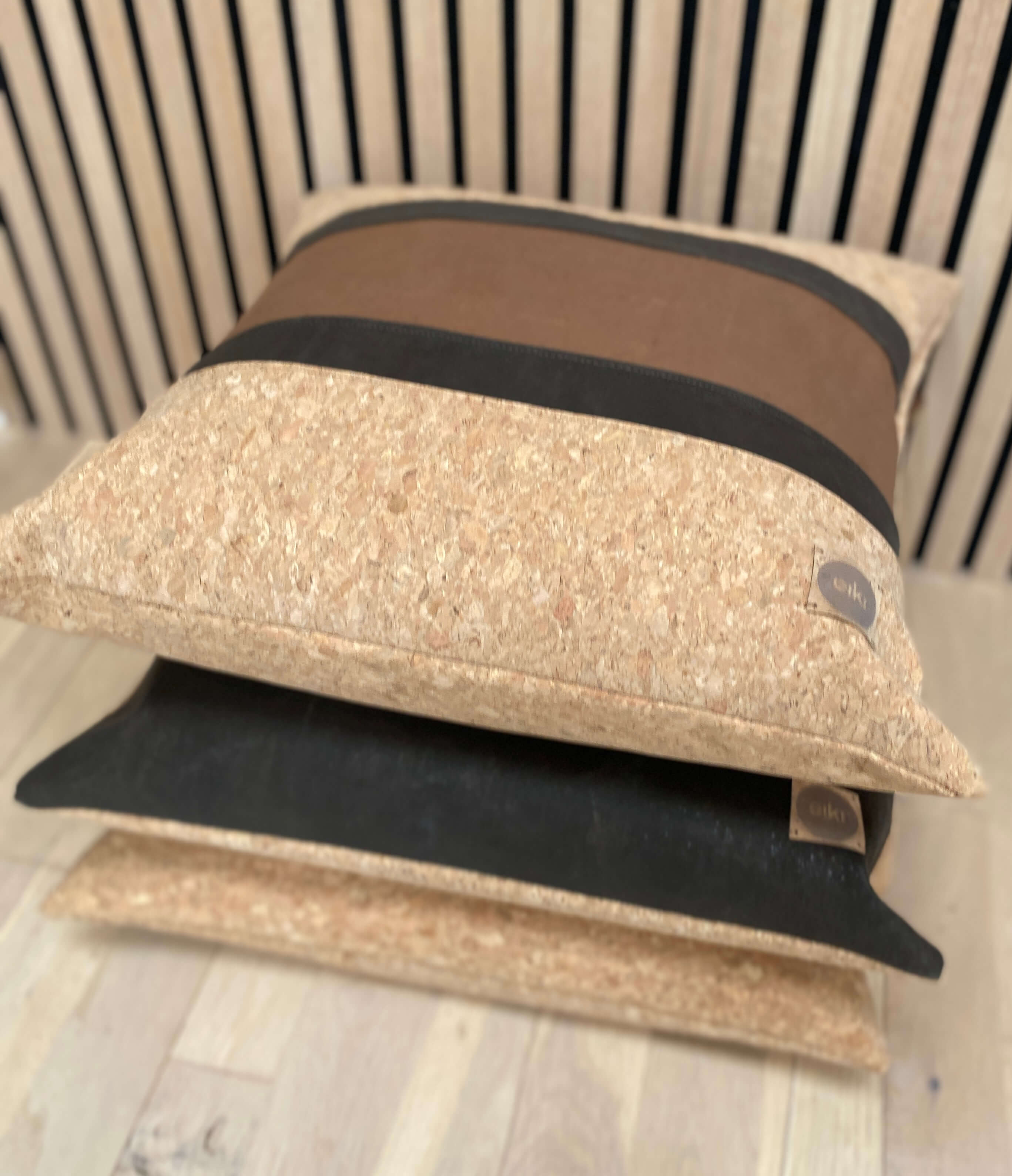 Korklæderet, som puden er syet i, stammer fra korkegens bark, der nænsomt høstes i Portugal. Træerne fældes ikke – de får lov at stå og vokse videre, mens de fortsat binder CO₂. Det er et materiale, der emmer af omsorg og omtanke – og som samtidig føles rart, varmt og blødt mod huden.