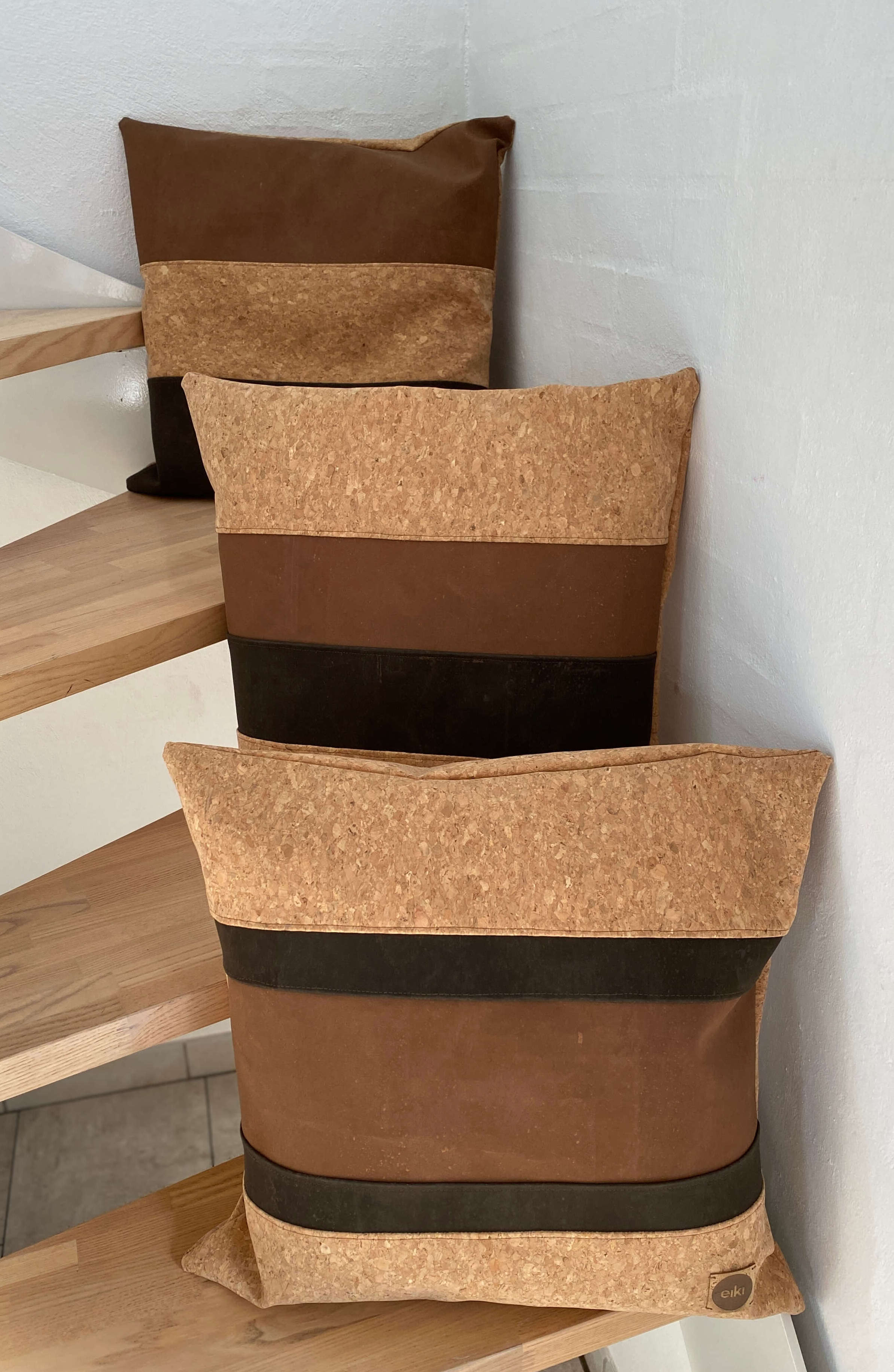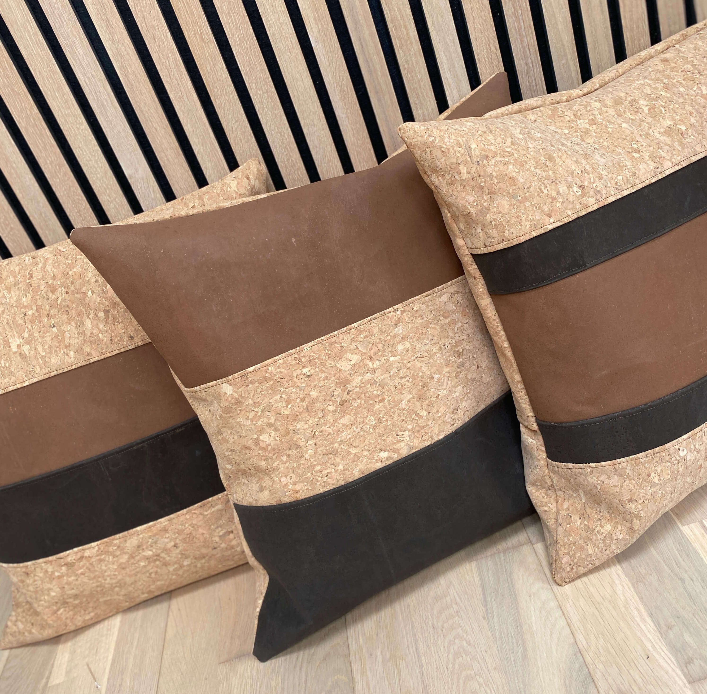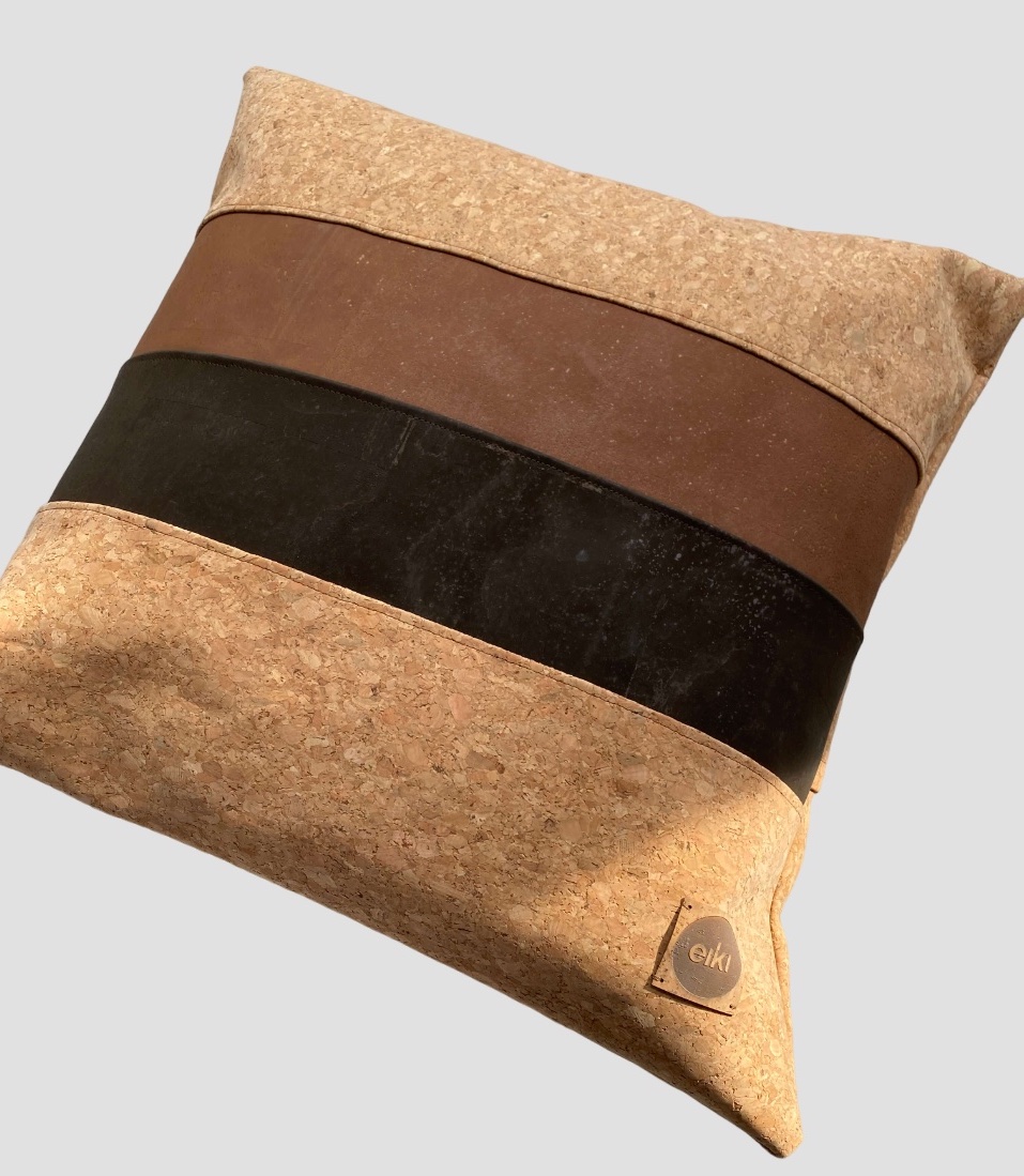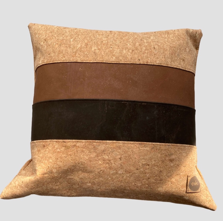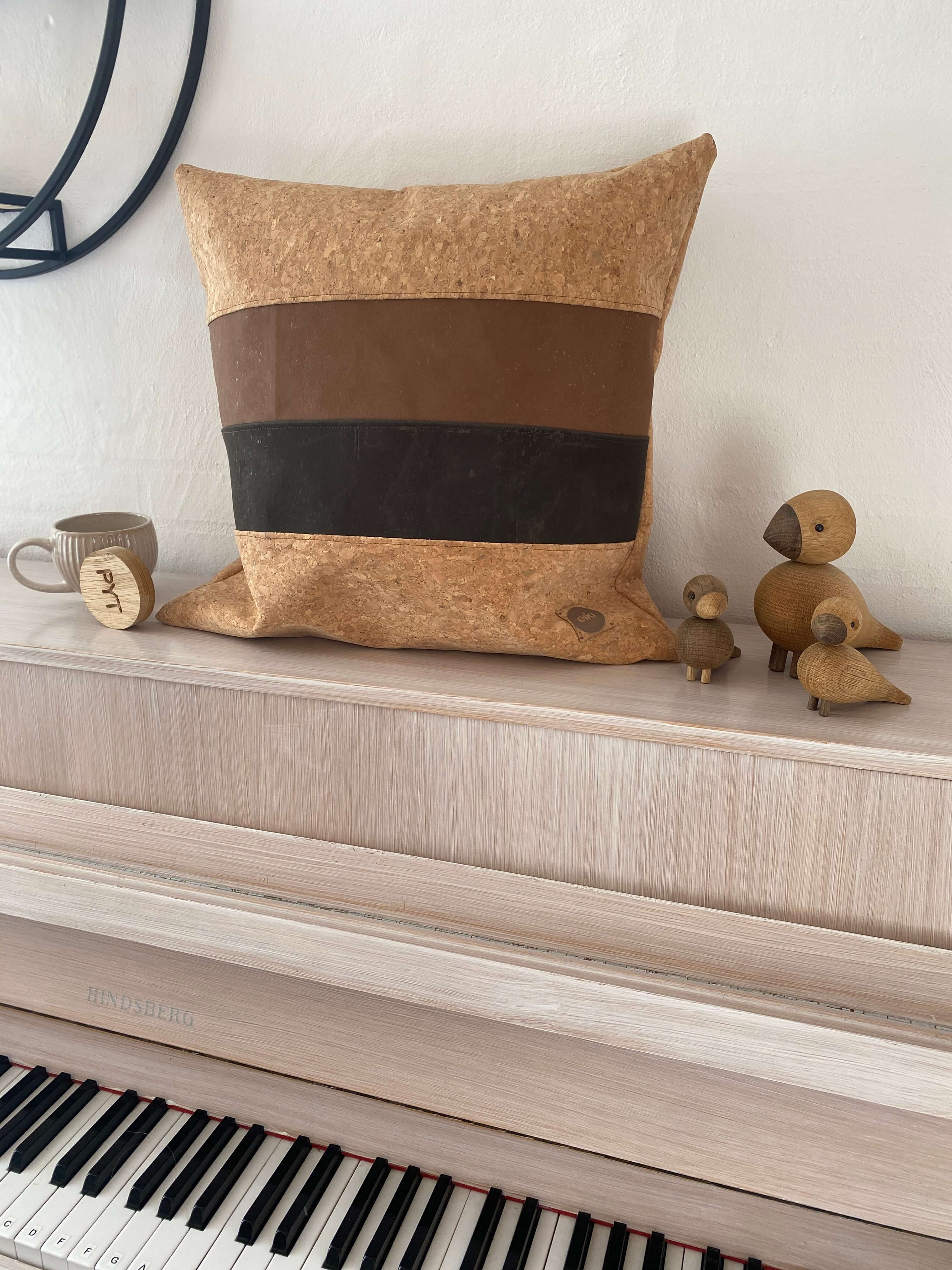 Korklæderet, som puden er syet i, stammer fra korkegens bark, der nænsomt høstes i Portugal. Træerne fældes ikke – de får lov at stå og vokse videre, mens de fortsat binder CO₂. Det er et materiale, der emmer af omsorg og omtanke – og som samtidig føles rart, varmt og blødt mod huden.