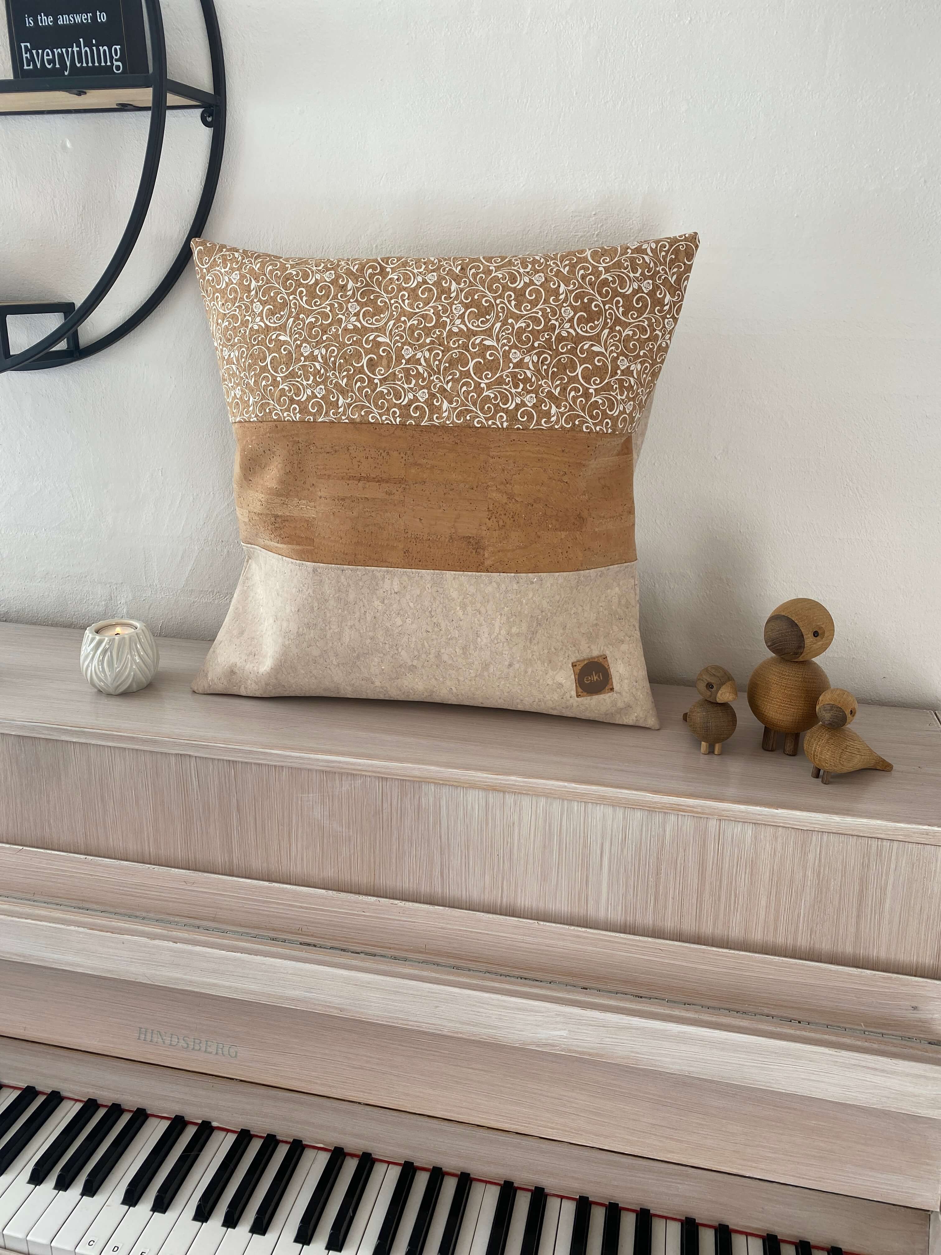 Korkens naturlige egenskaber gør puden smuds- og vandafvisende. Kommer der en plet, kan den let tørres væk med en fugtig klud og lidt mildt opvaskemiddel. Pudebetrækket er lavet med overlap på bagsiden og uden lynlås, så det er nemt at tage af og på. Og selvom den ikke tåler maskinvask, holder den sig pæn med lidt nænsom pleje.