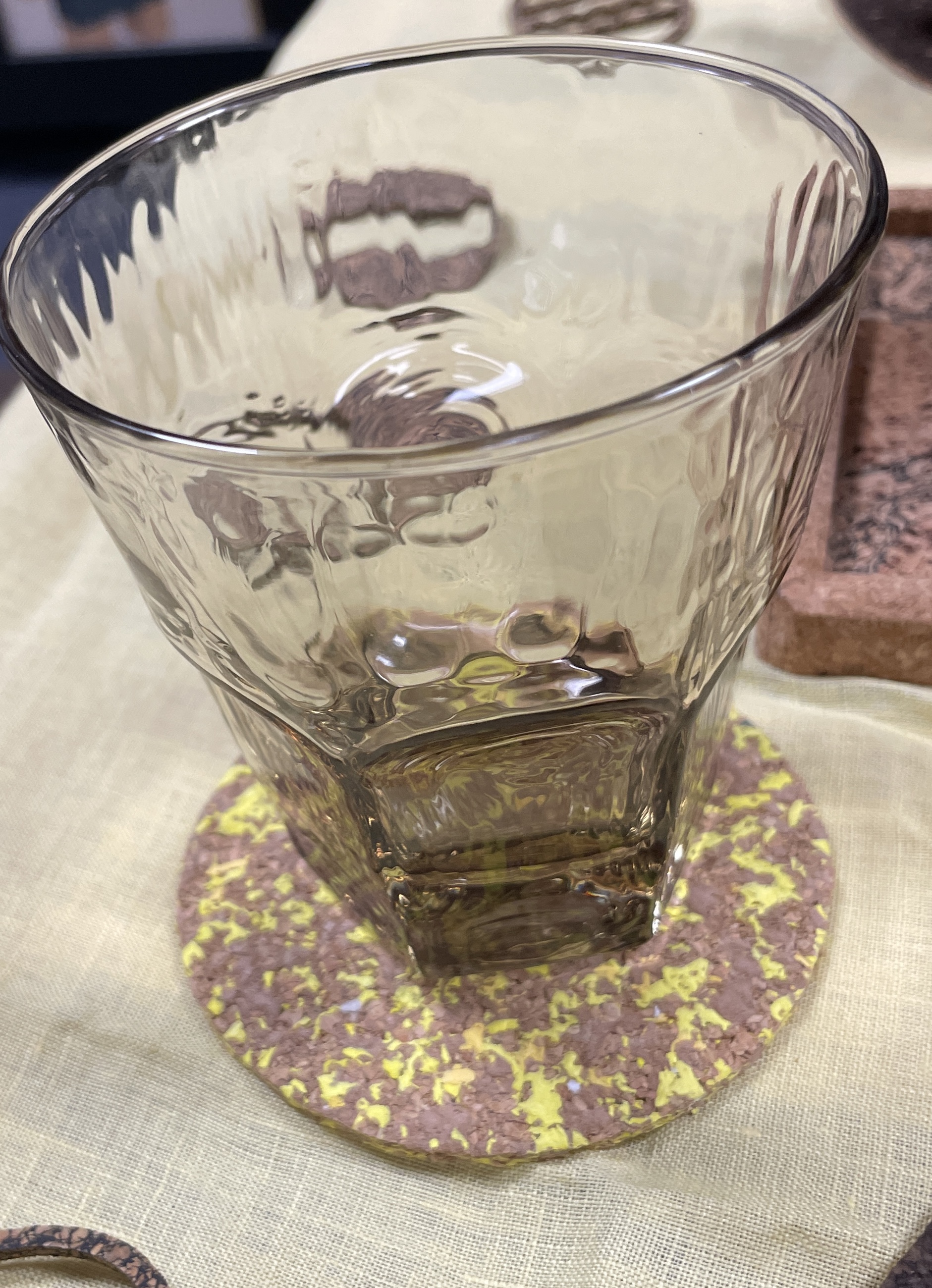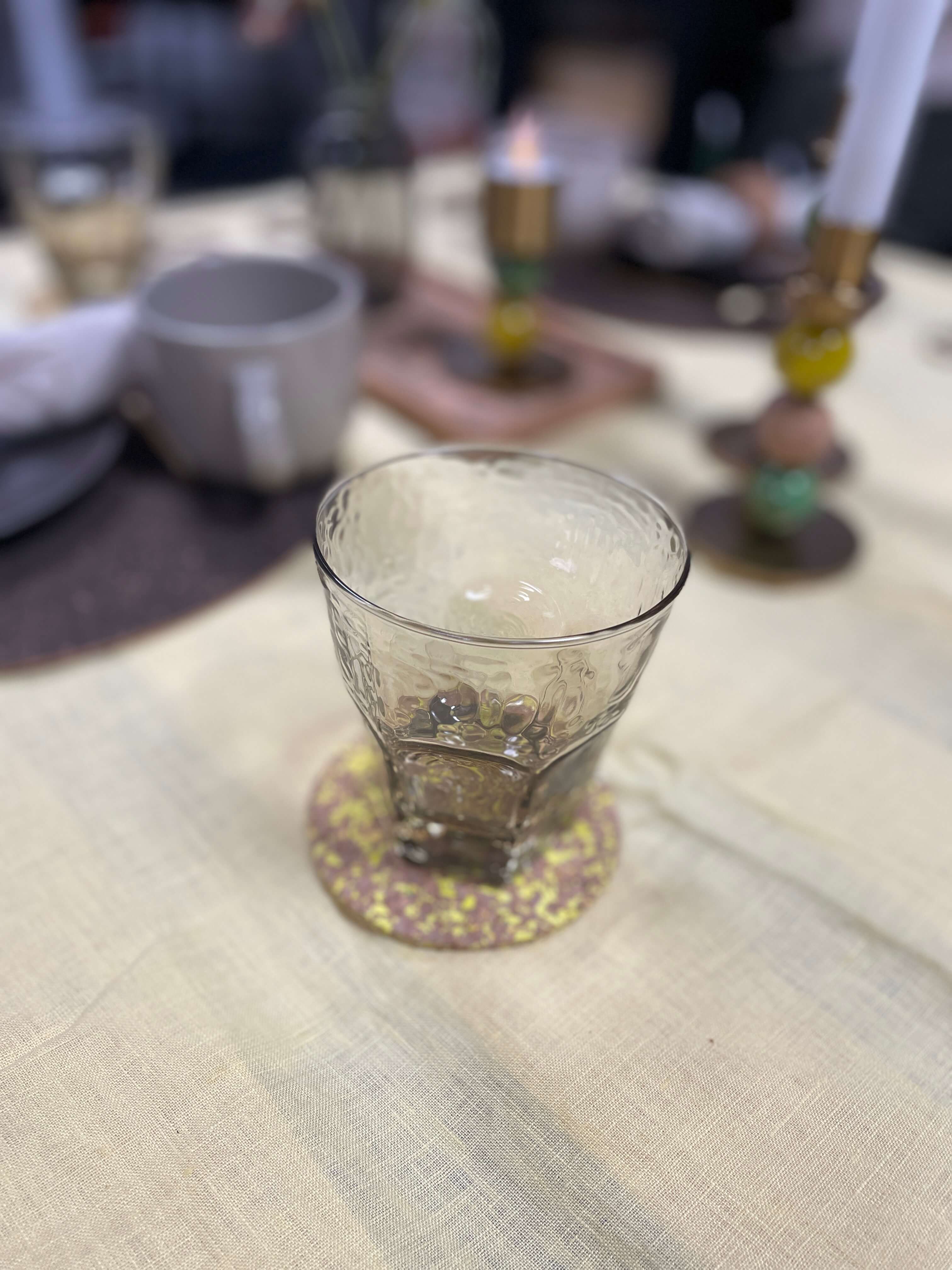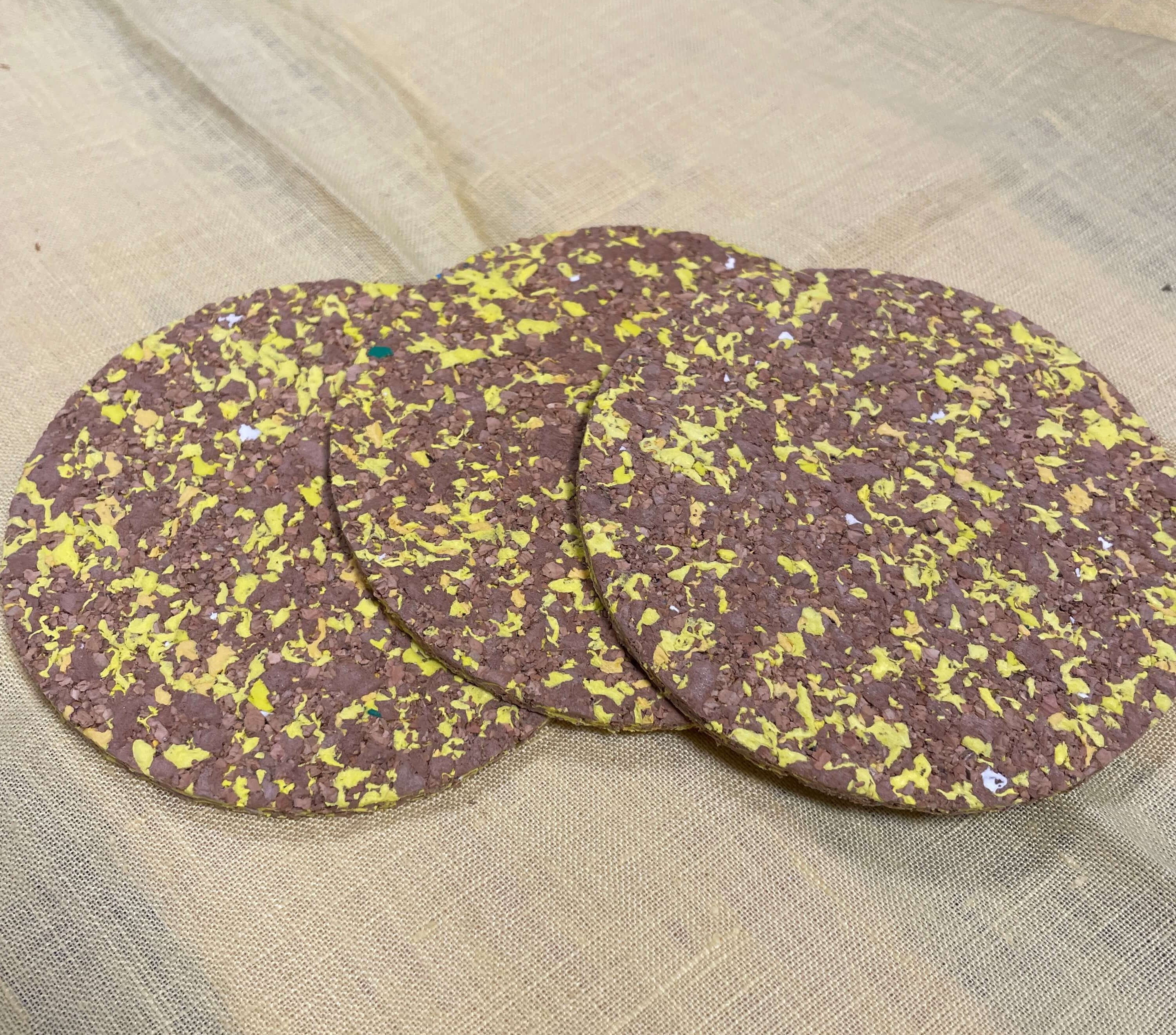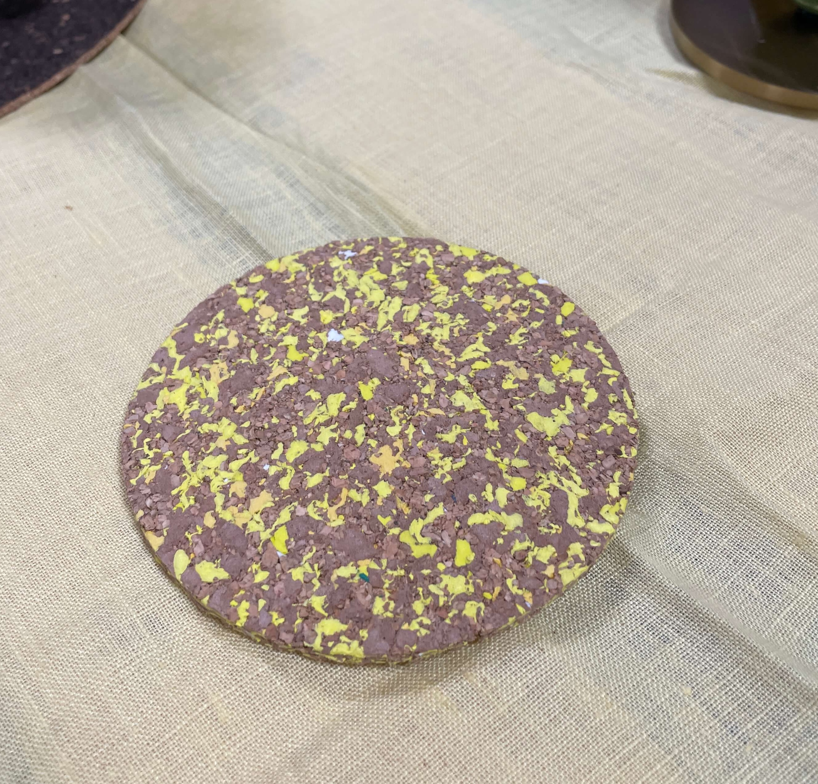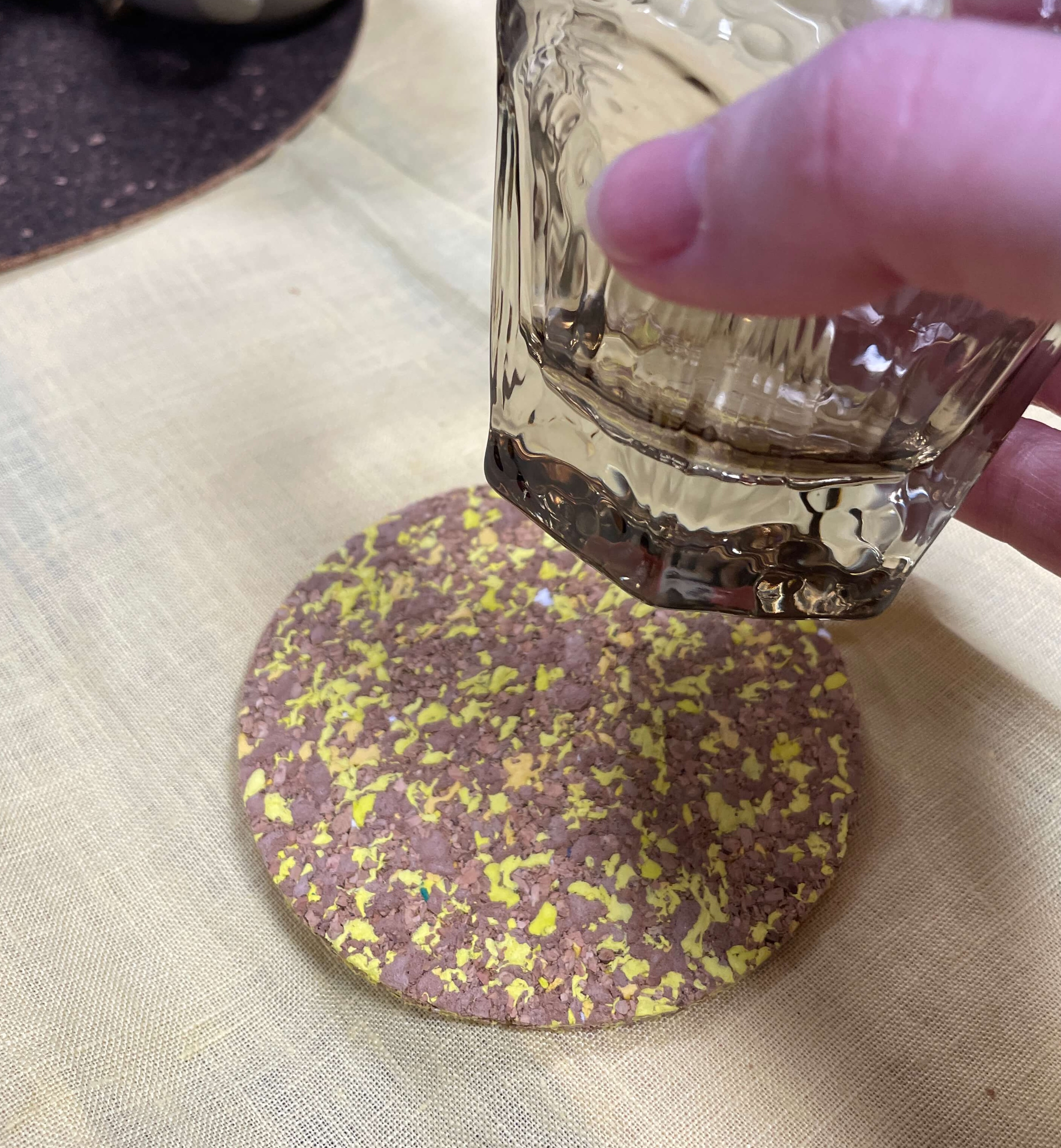 Rund glasbrik i kork i gul terrazzo - varme farver, hygge og omtanke til hverdagen ☕💛