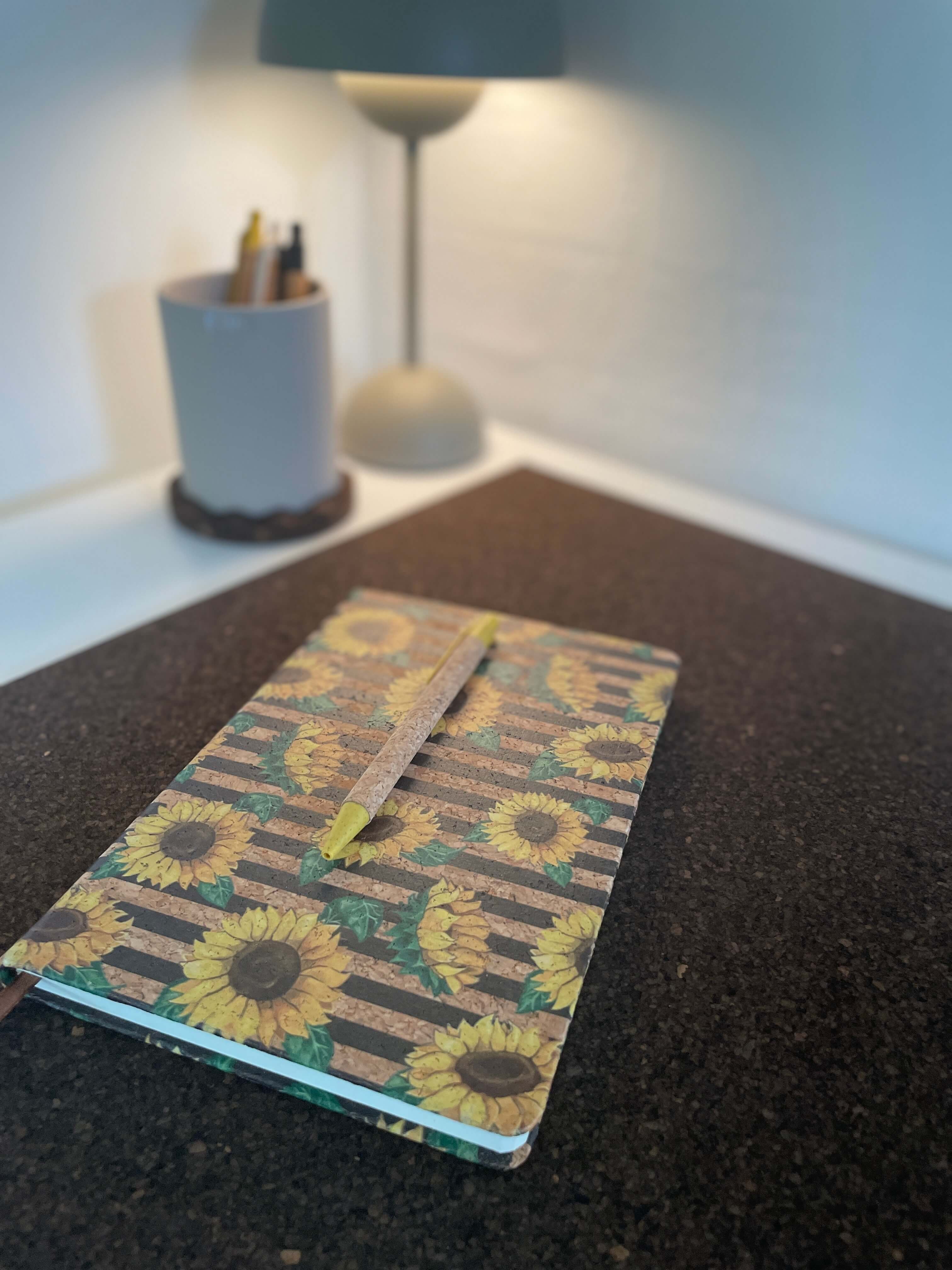 Leder du efter en smuk og personlig gave – eller måske en særlig notesbog til dig selv? Denne linjerede notesbog i kork med det fineste solsikkemønster emmer af varme, glæde og ro. Den indbyder til eftertænksomhed, taknemmelighed og kreativitet.