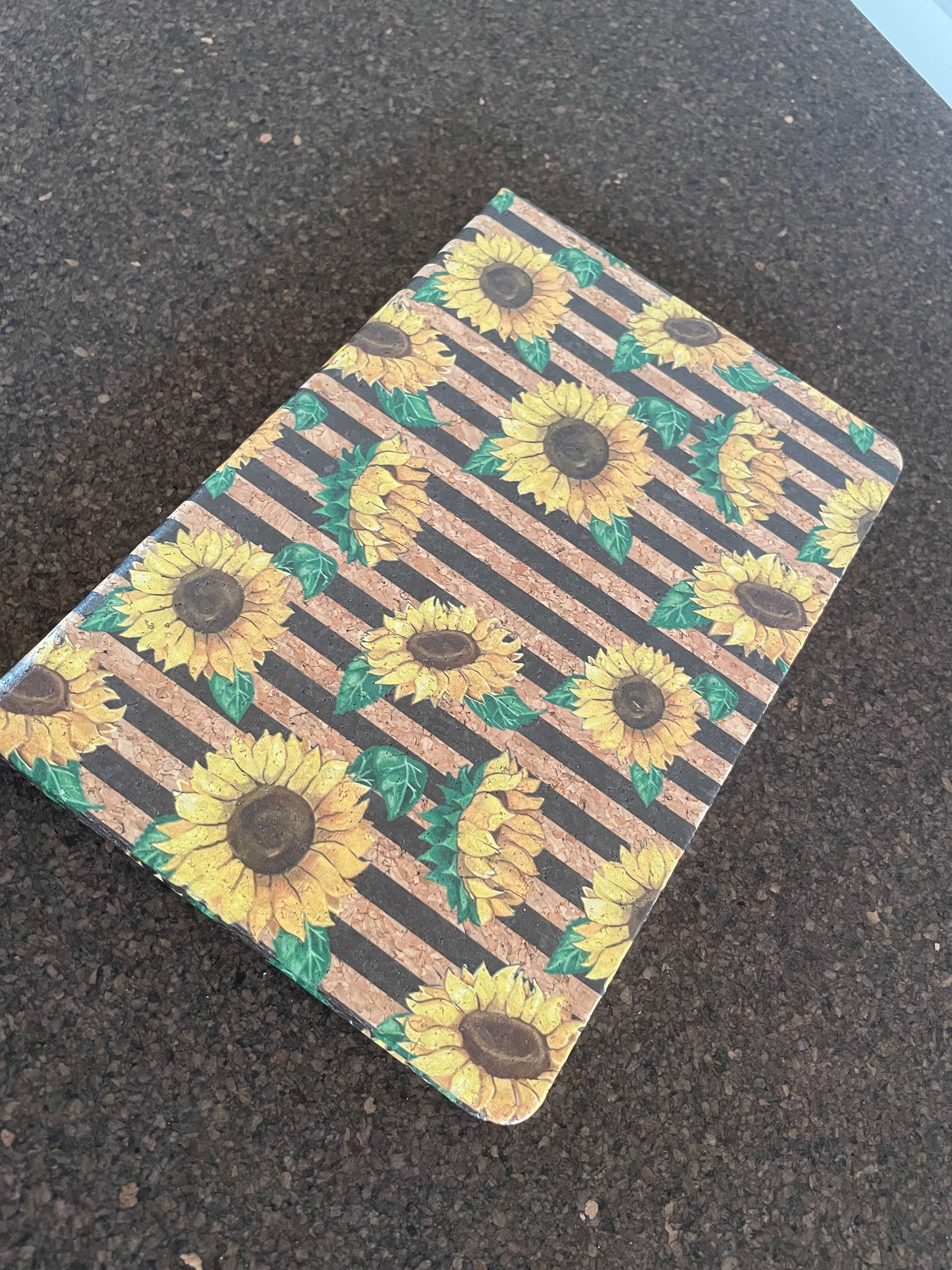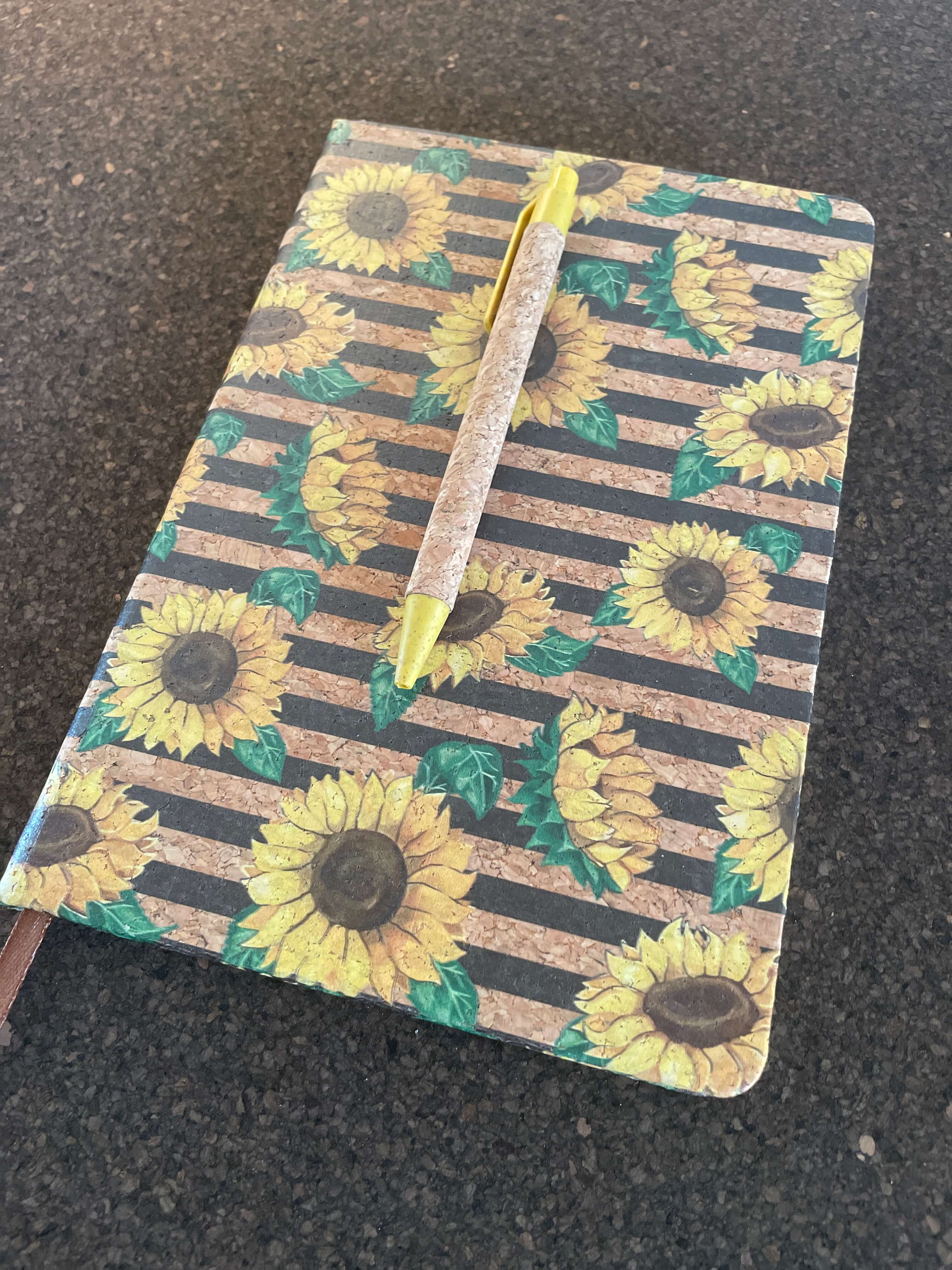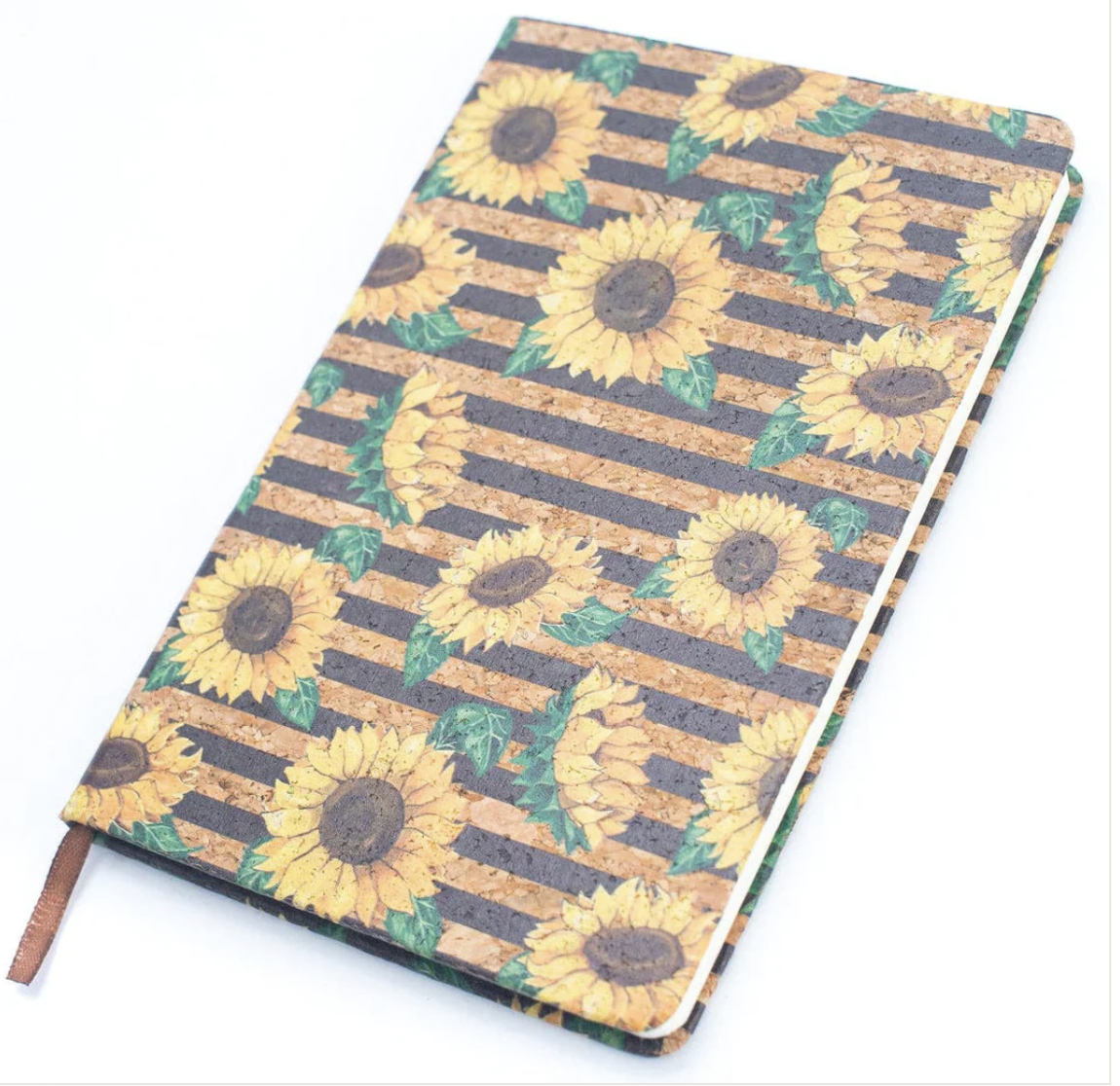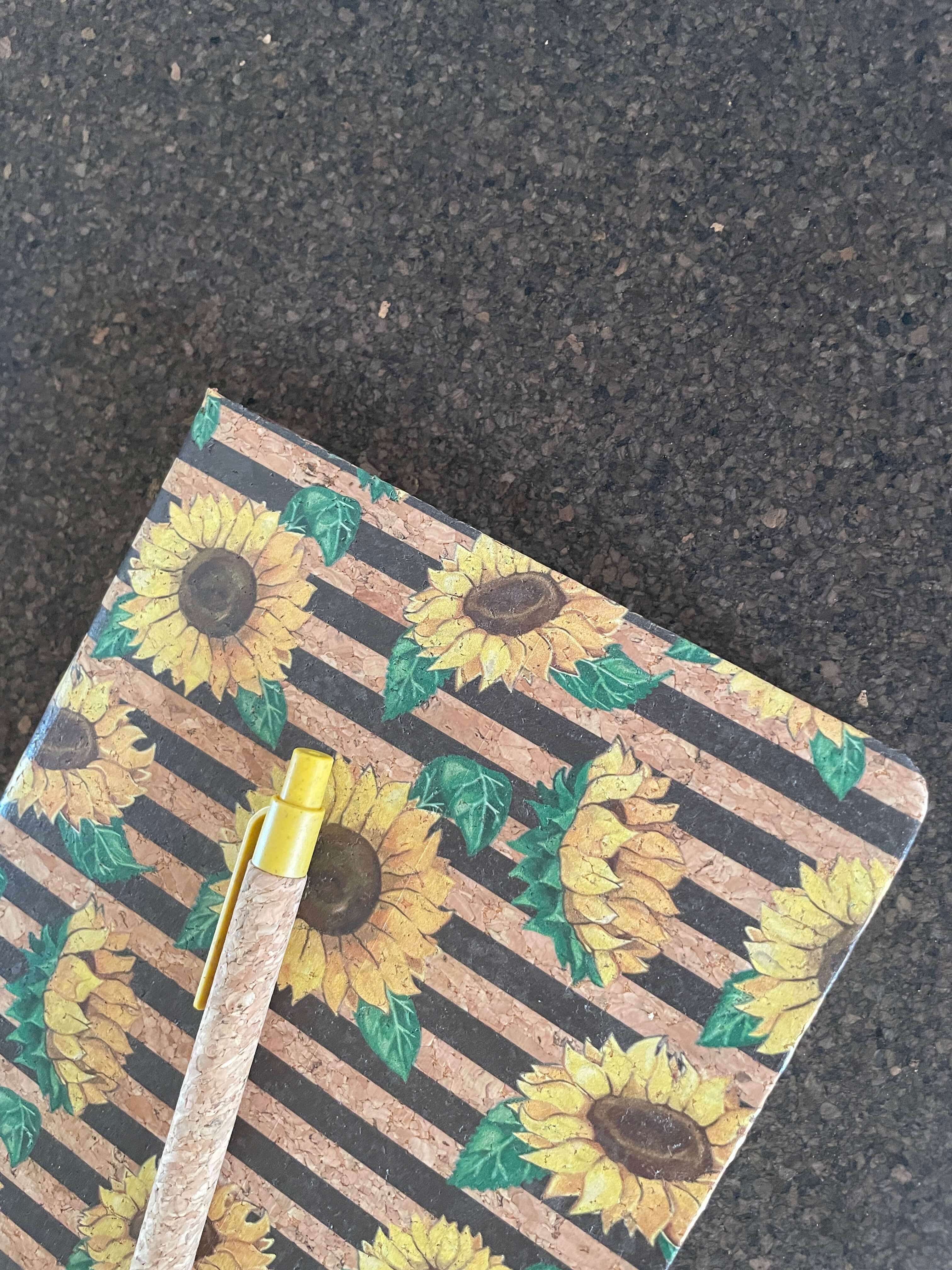 🌻 Notesbog i kork med mønster af solsikker – til tanker, hilsner og hverdagens små øjeblikke