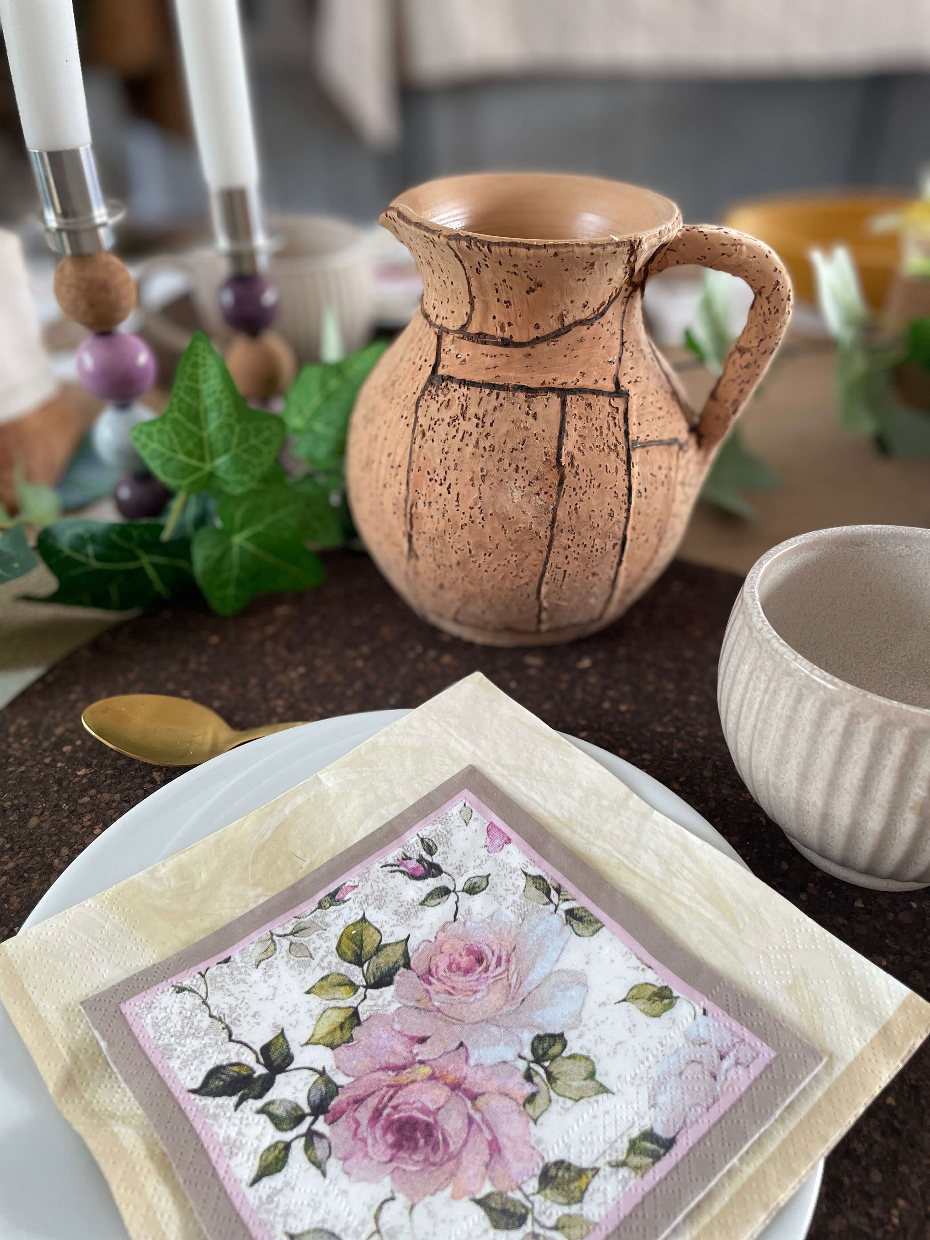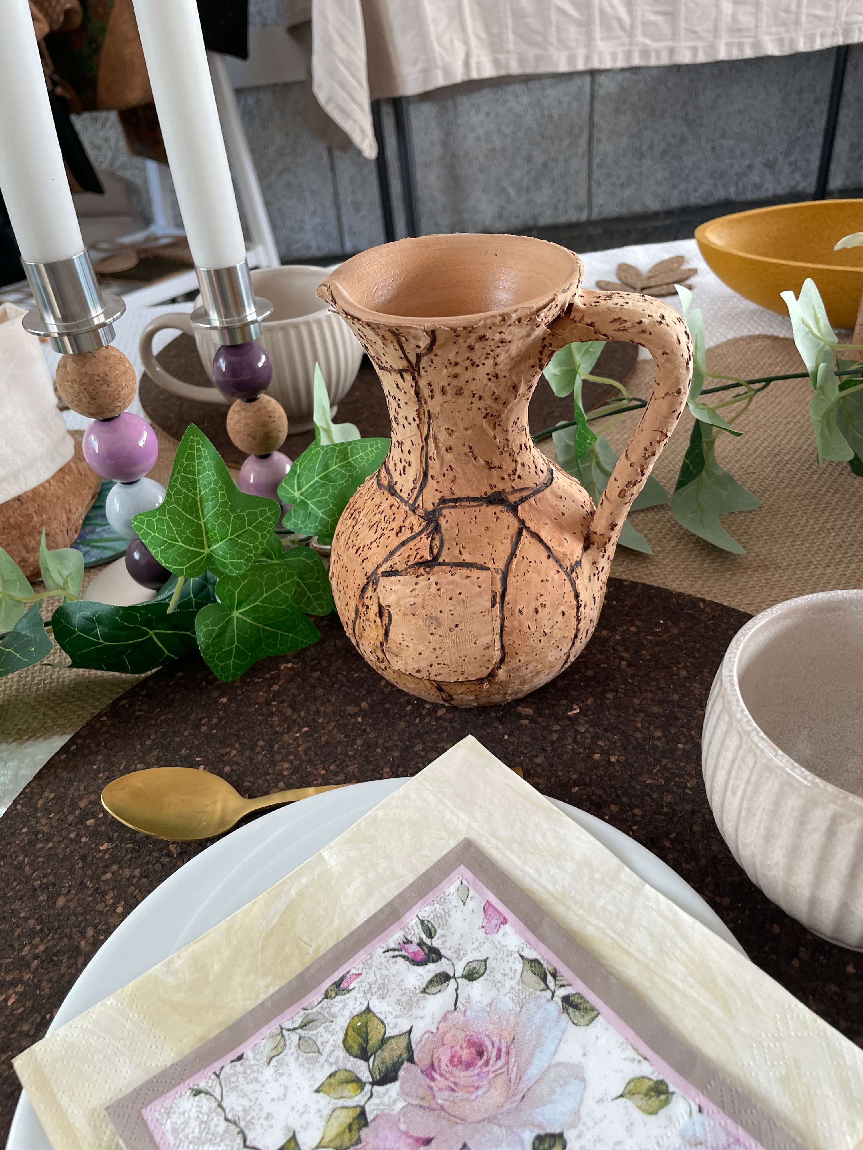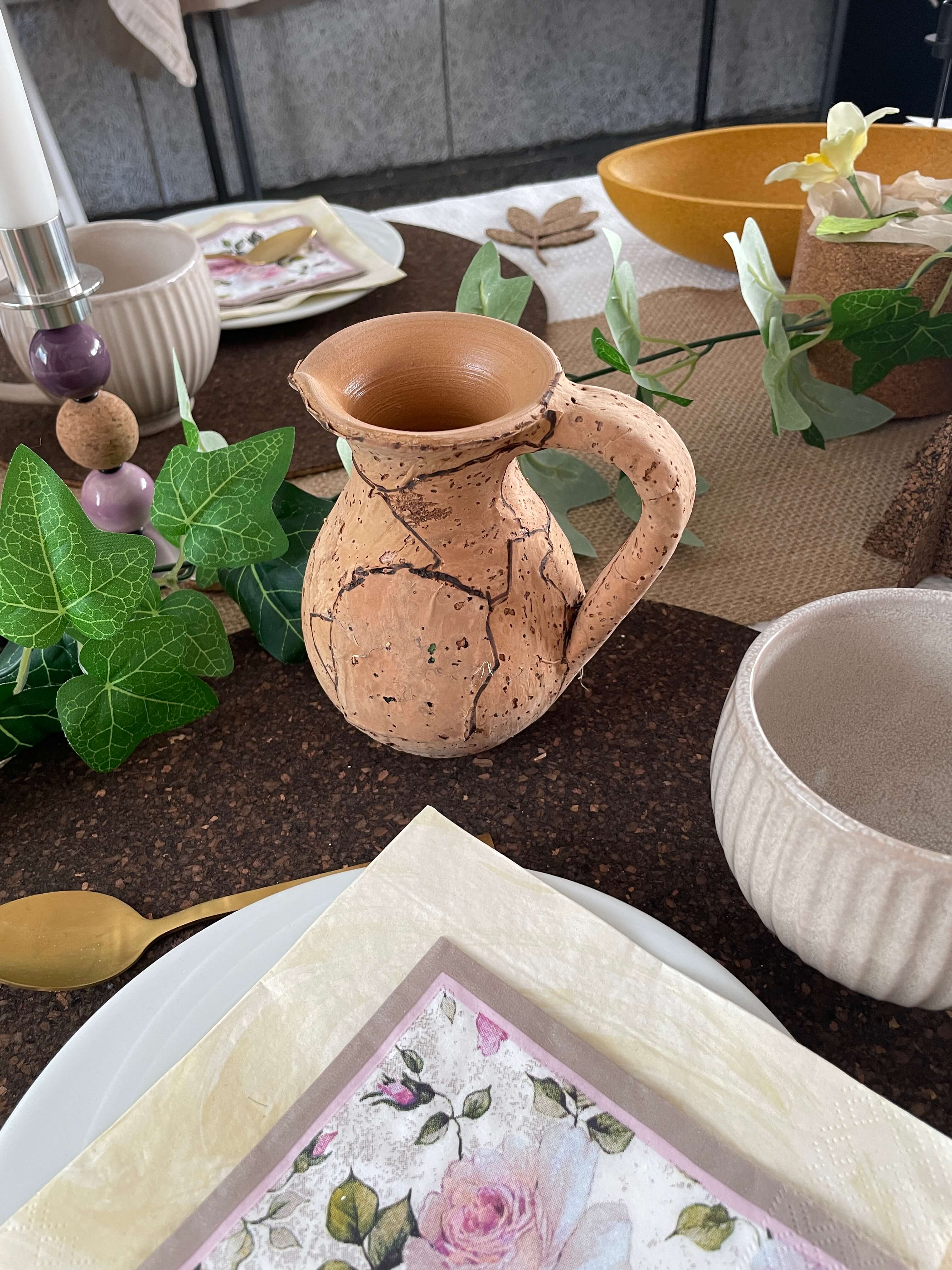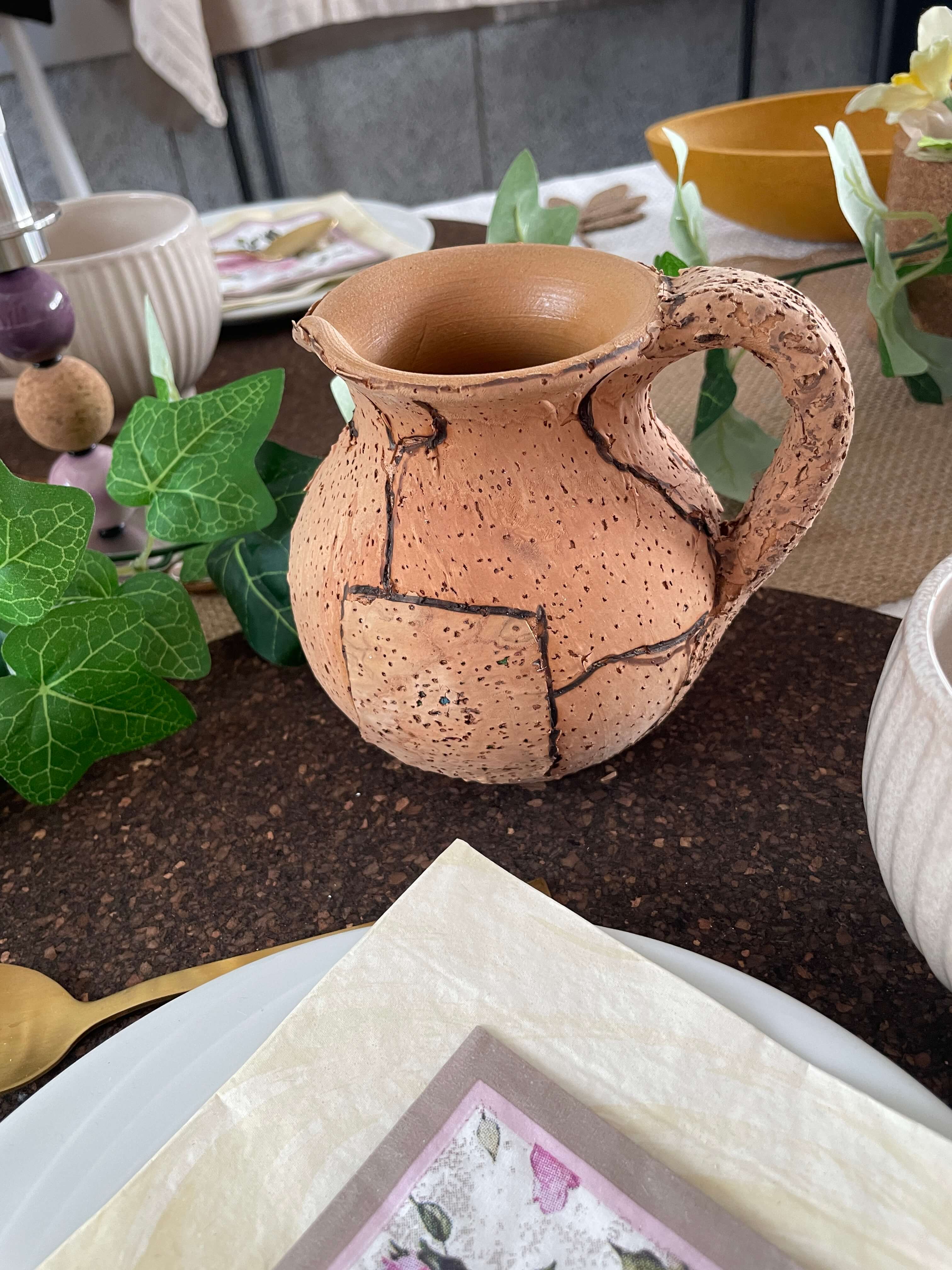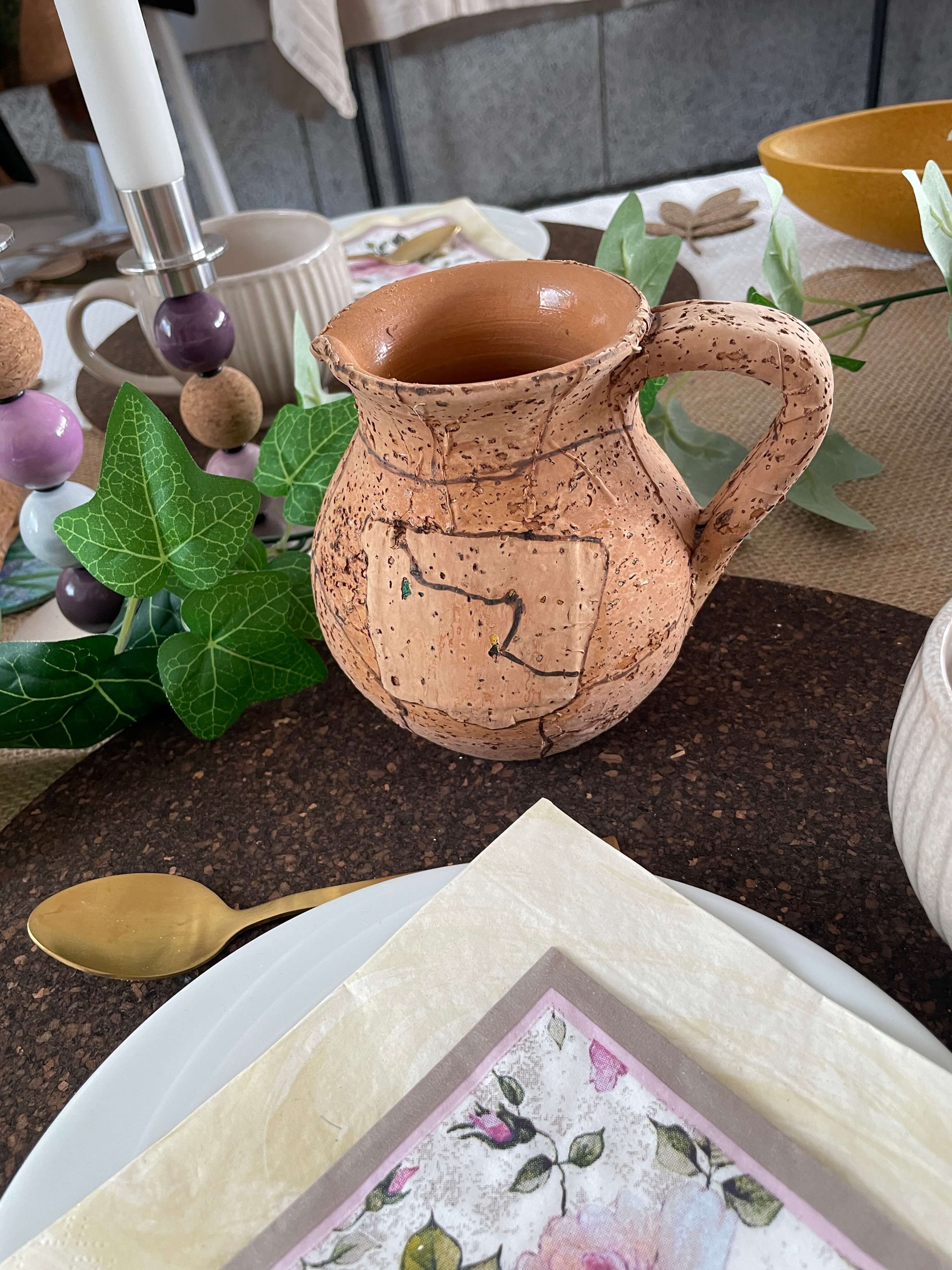 Denne lerkande er noget helt særligt. Håndlavet i Grækenland og smukt beklædt med kork, får du her et unikt stykke håndværk, der kombinerer tradition og charme. Korken giver ikke bare et varmt, naturligt udtryk – den gør også kanden behagelig at holde på, selv når indholdet er varmt.