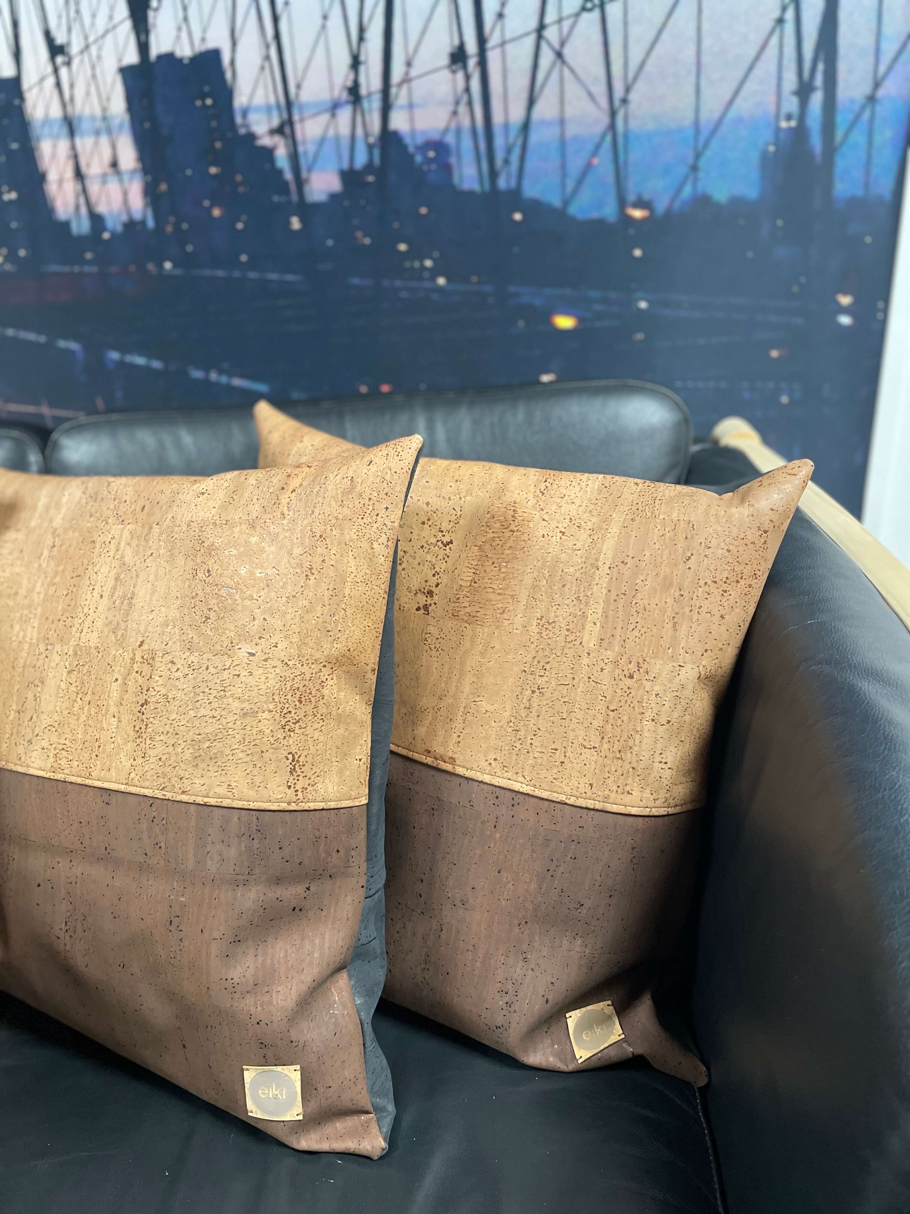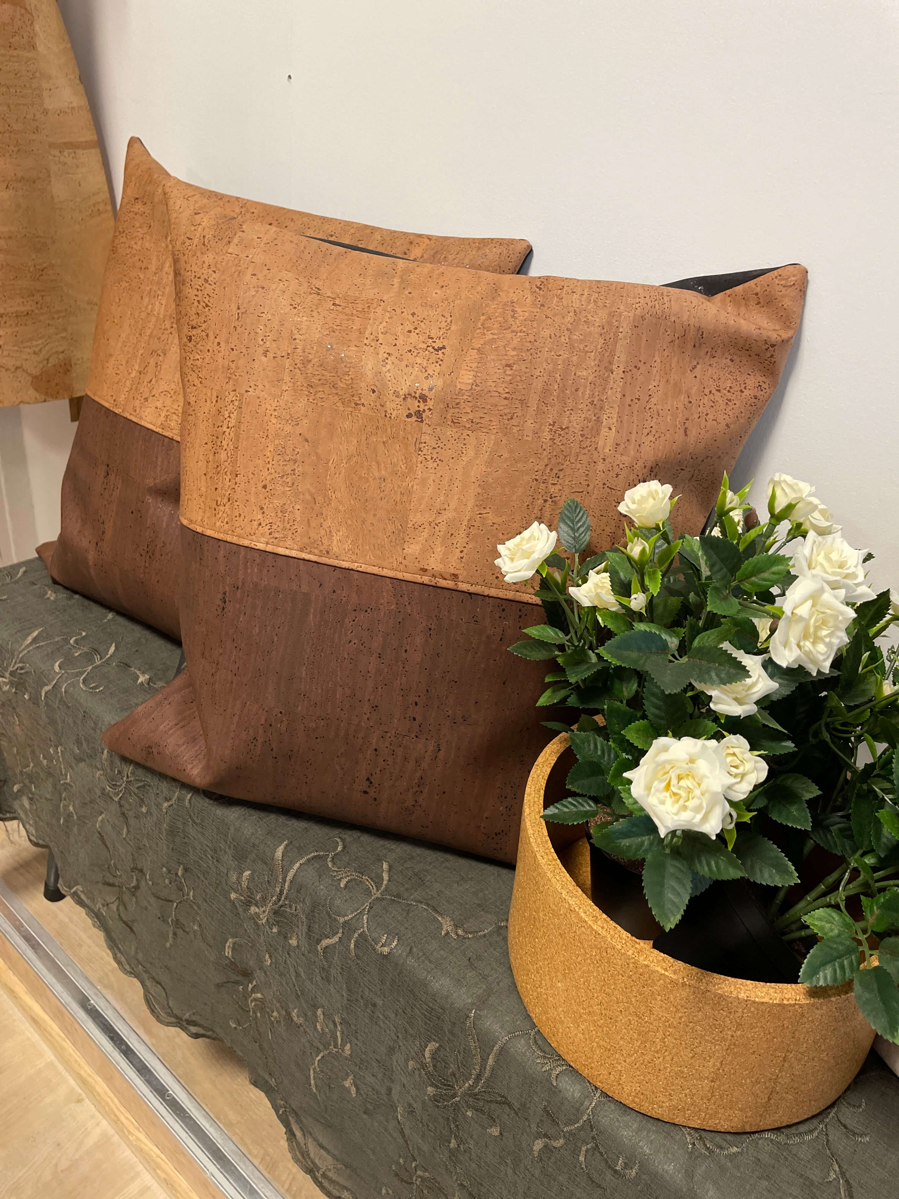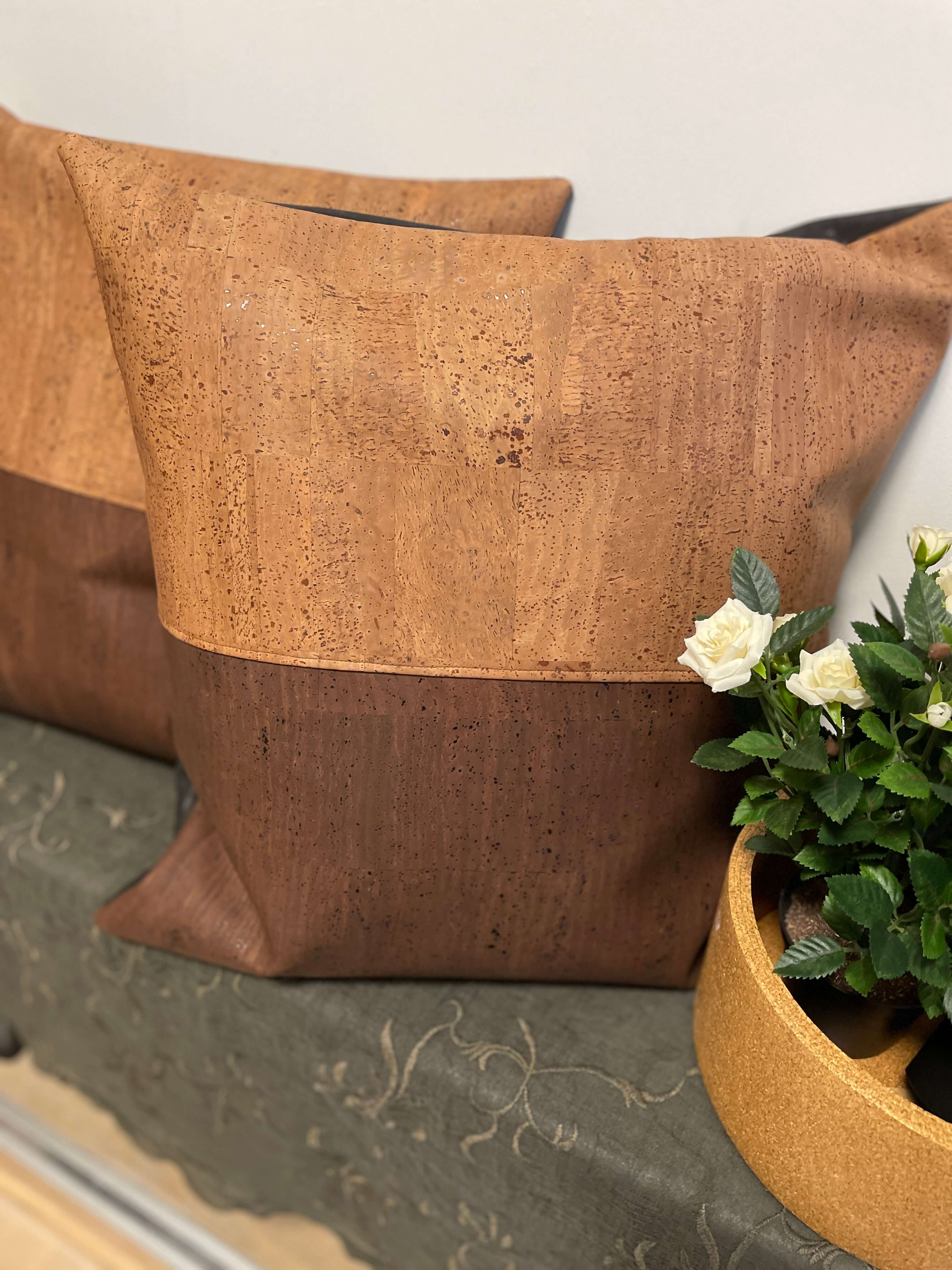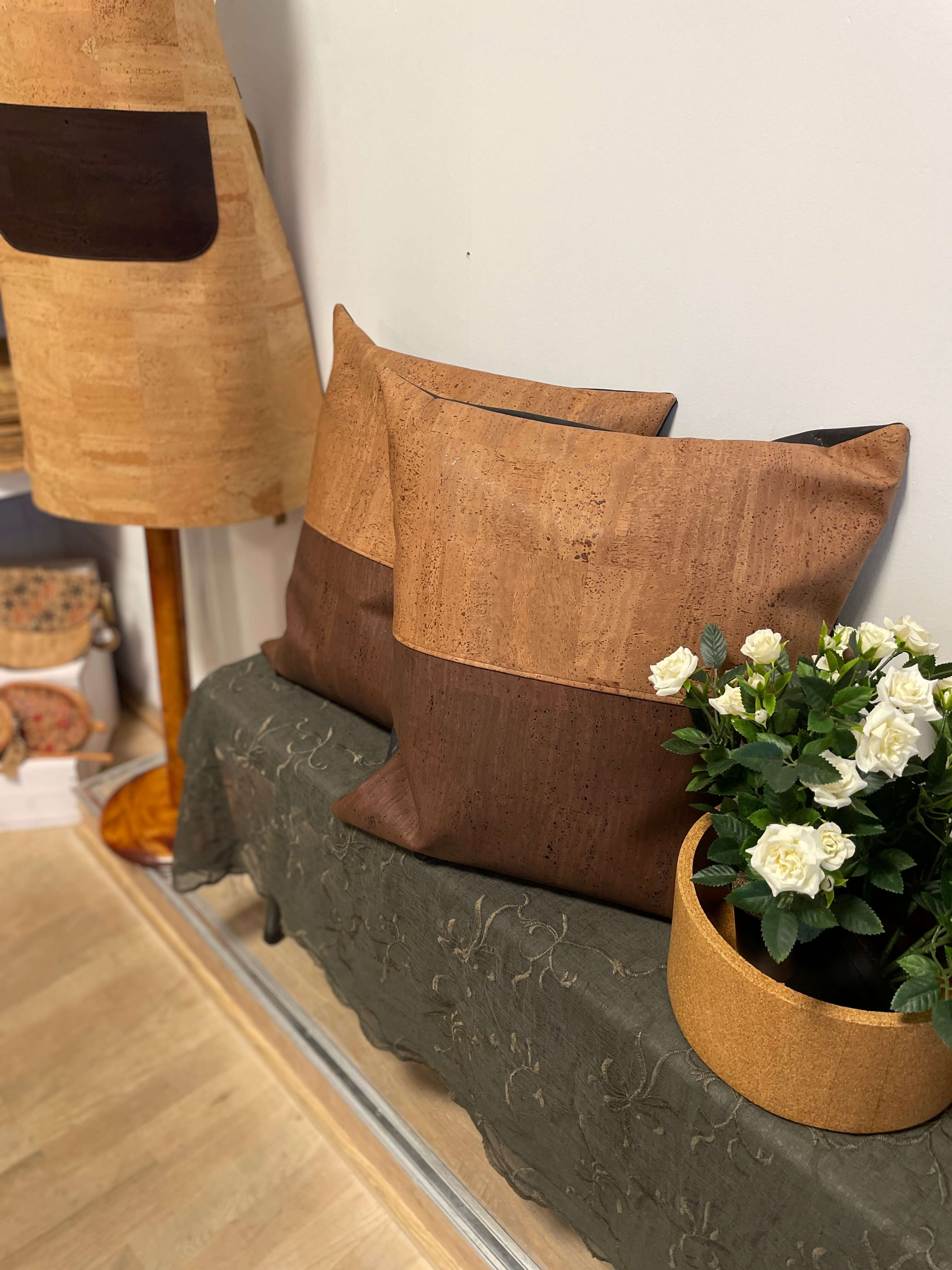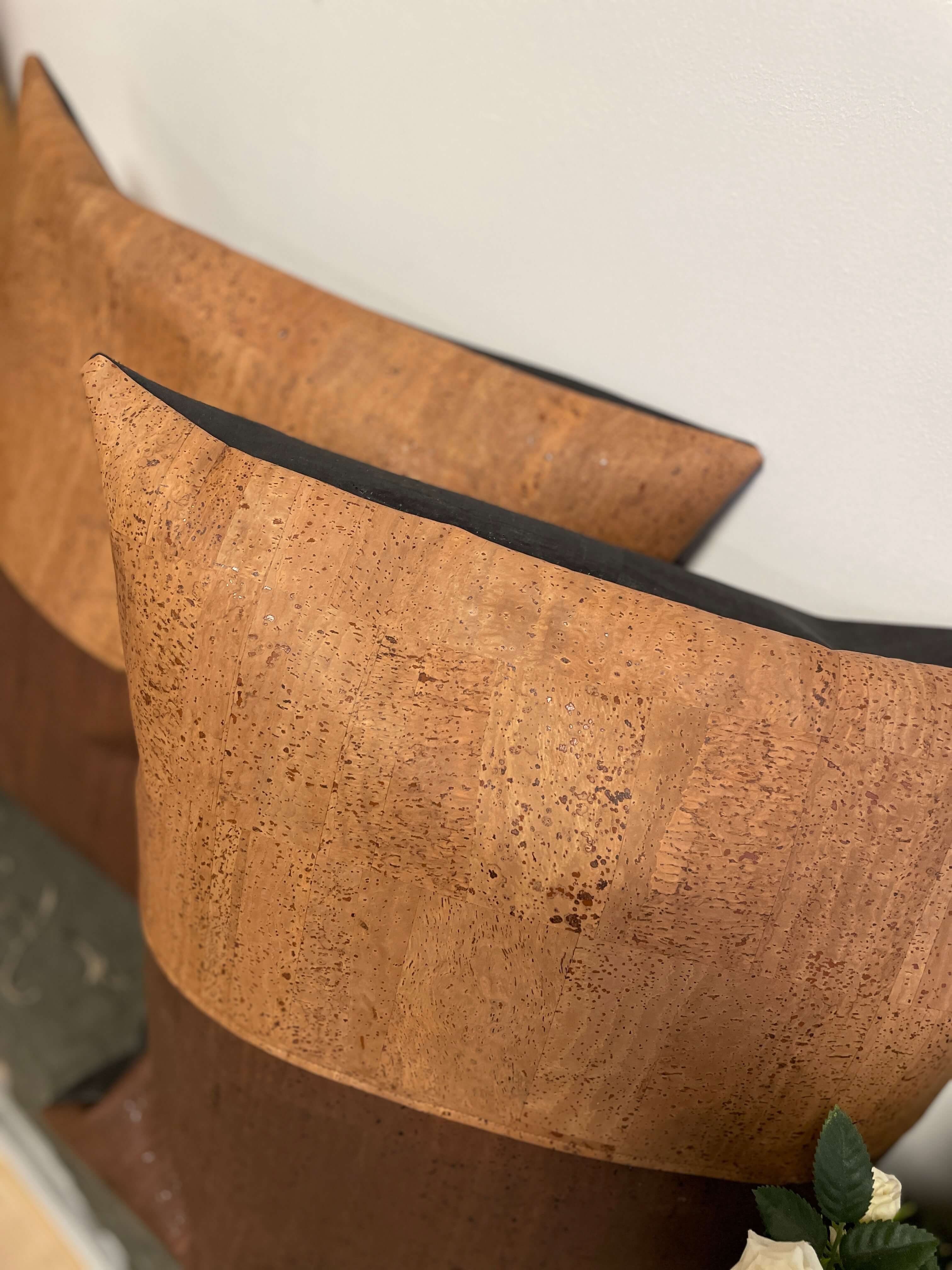 Korklæderet, som puden er syet i, stammer fra korkegens bark, der nænsomt høstes i Portugal. Træerne fældes ikke – de får lov at stå og vokse videre, mens de fortsat binder CO₂. Det er et materiale, der emmer af omsorg og omtanke – og som samtidig føles rart, varmt og blødt mod huden.