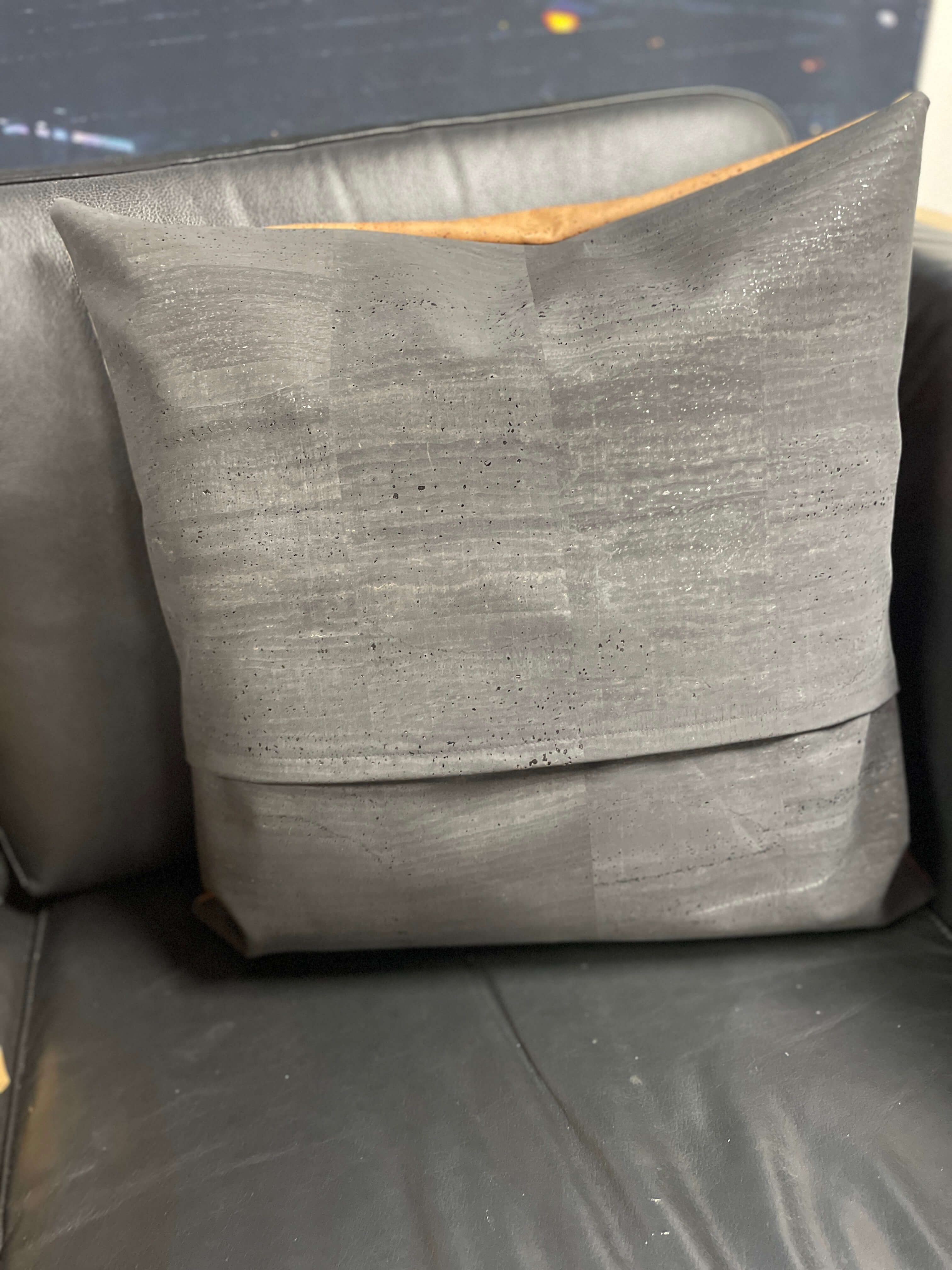 Bagsiden af pudebetrækket i sort kork er lavet med overlap, så det er nemt at tage af og på – helt uden lynlåse eller knapper. En lille detalje, der gør det let og enkelt.