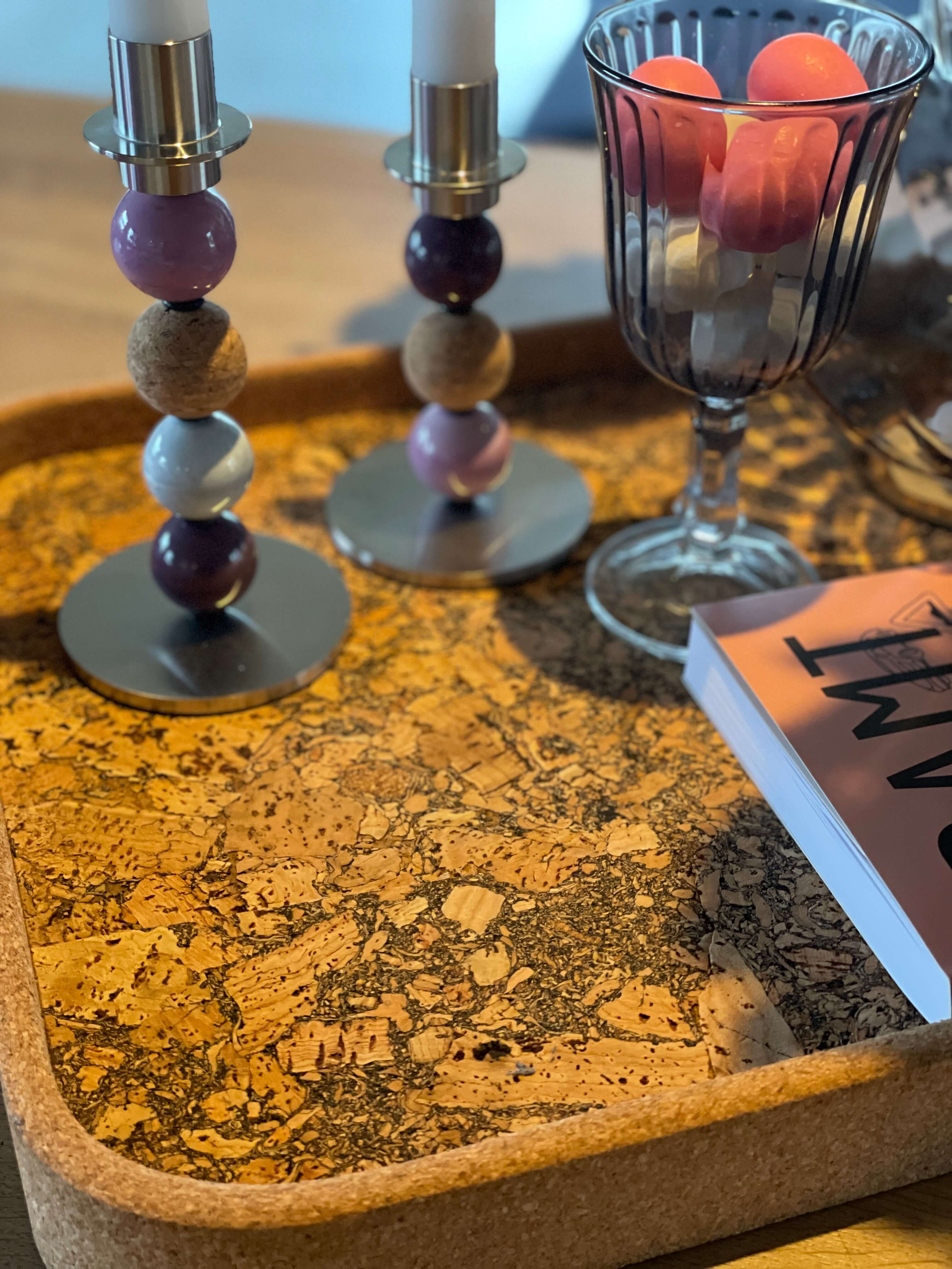 Kork føles varmt og behageligt i hænderne og dæmper både lyd og bevægelse, så serveringen bliver rolig og afslappet.
