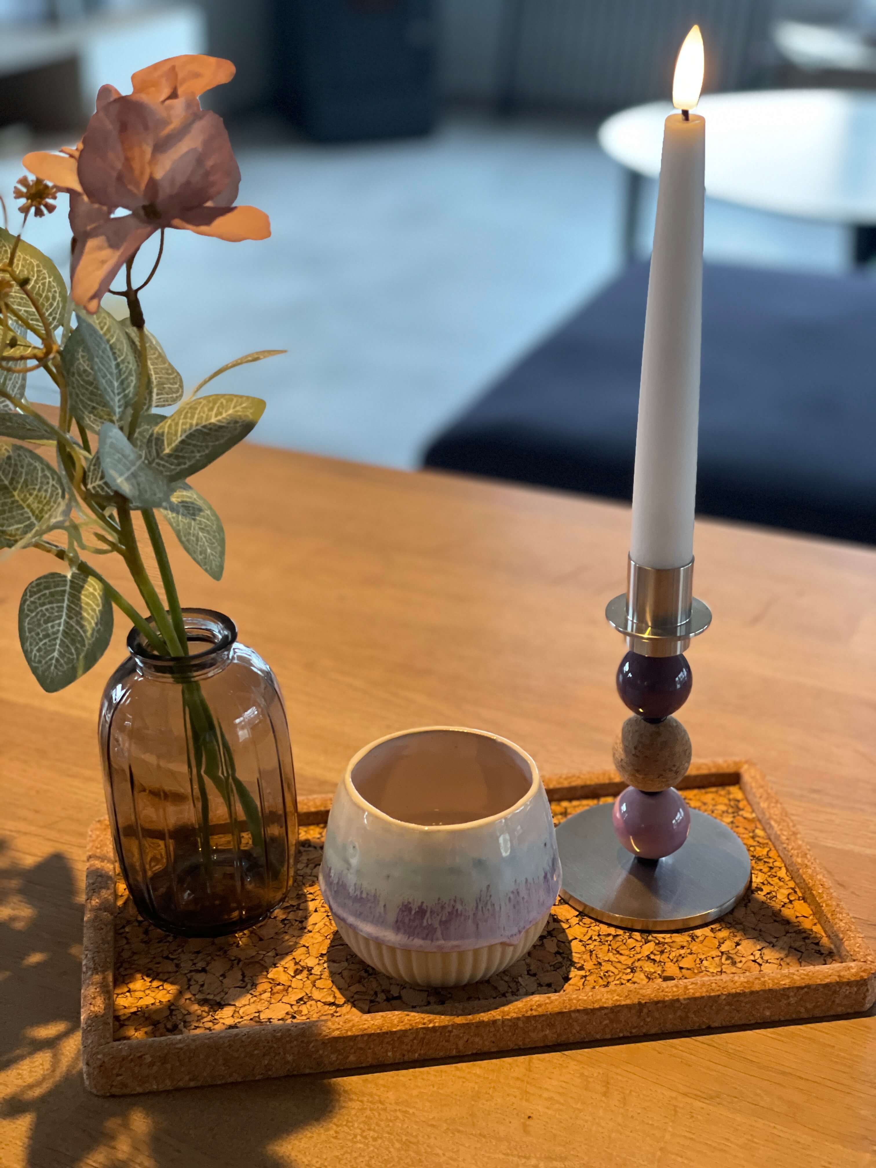 Korkens overflade føles behagelig og giver en let dæmpning, når du sætter kopper eller små skåle på.