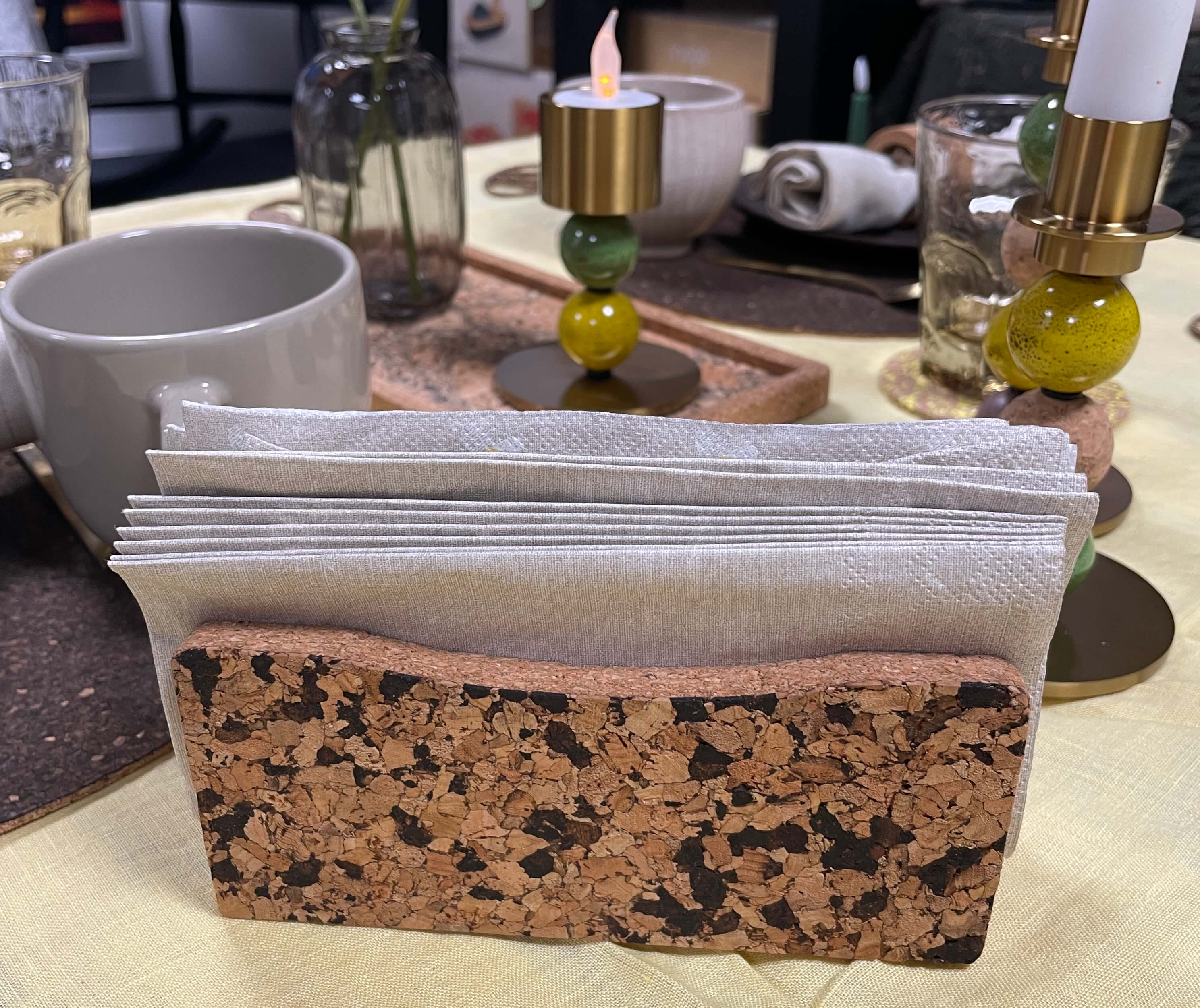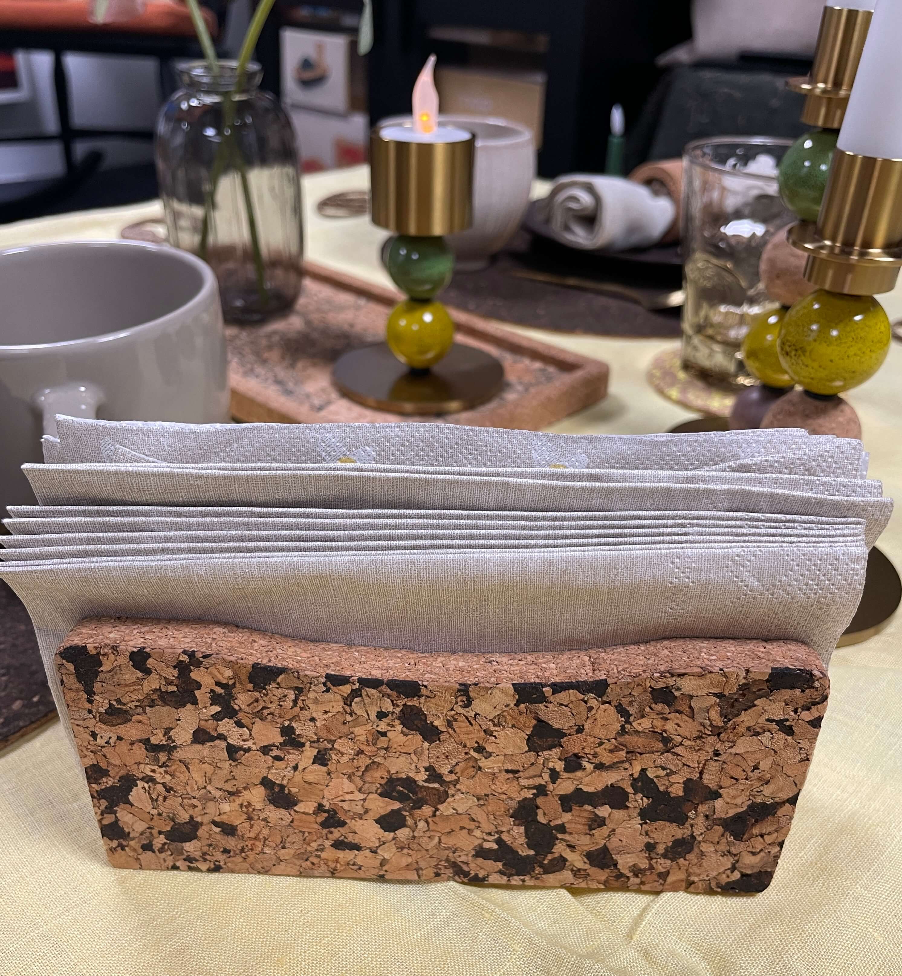 Korkens naturlige struktur hjælper med at holde servietterne rene og beskyttede – samtidig med at den ser smuk ud på bordet.