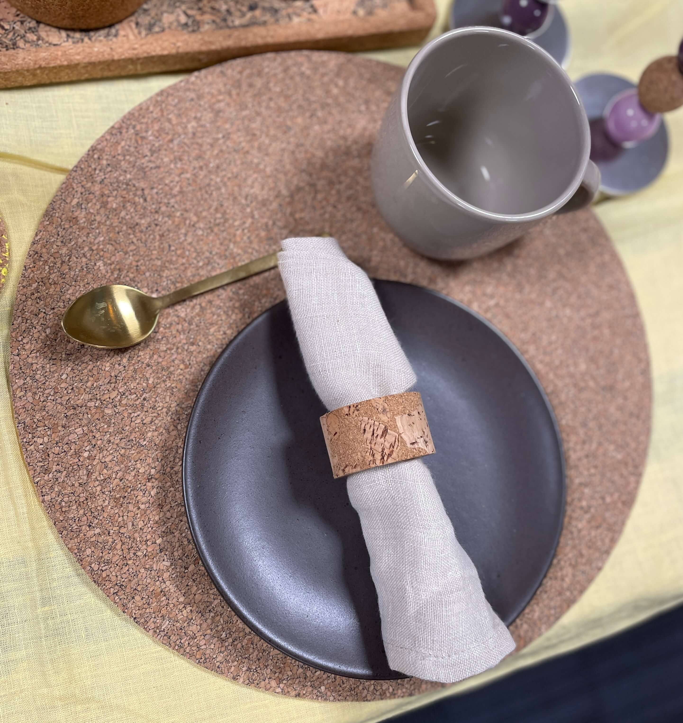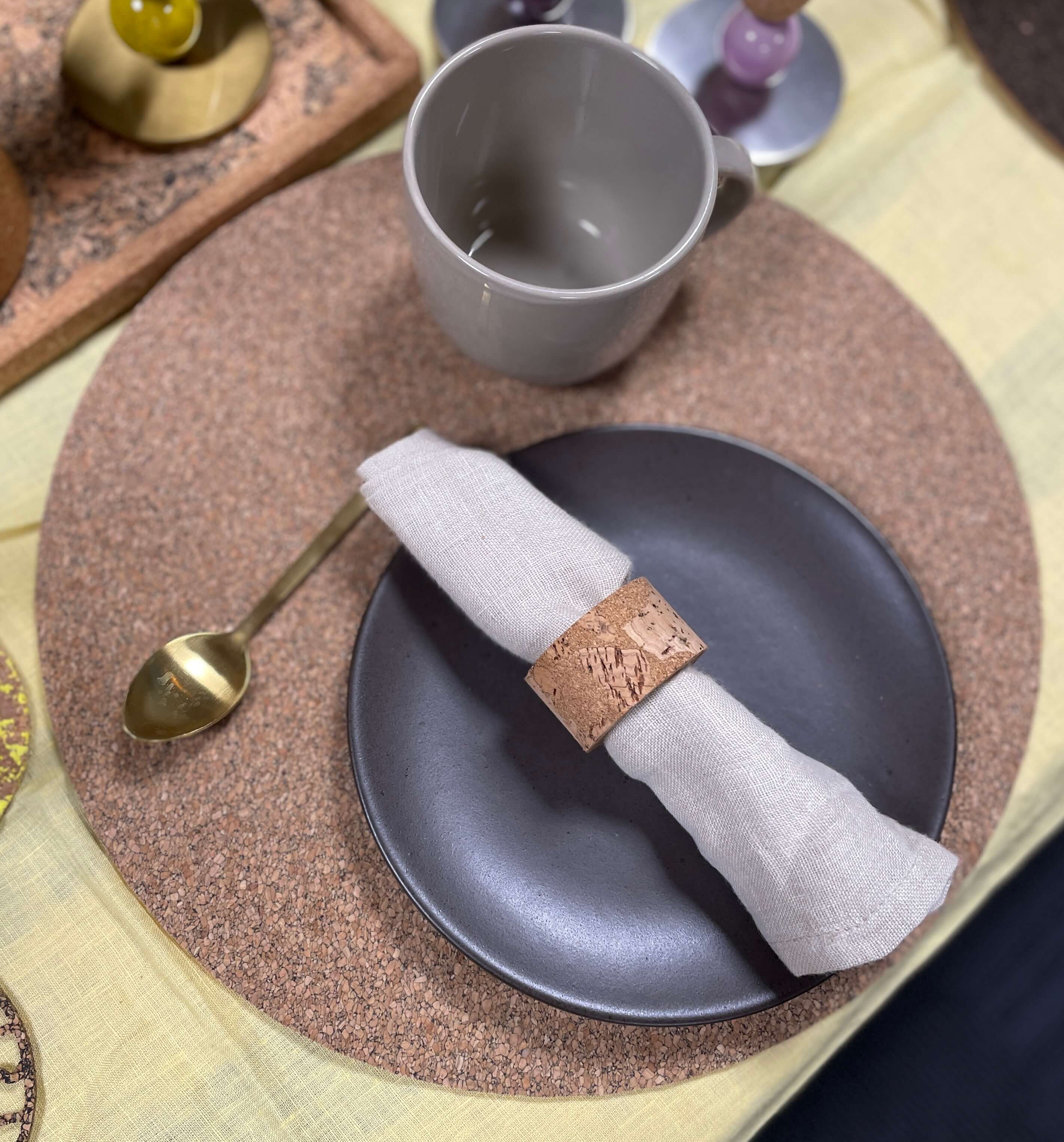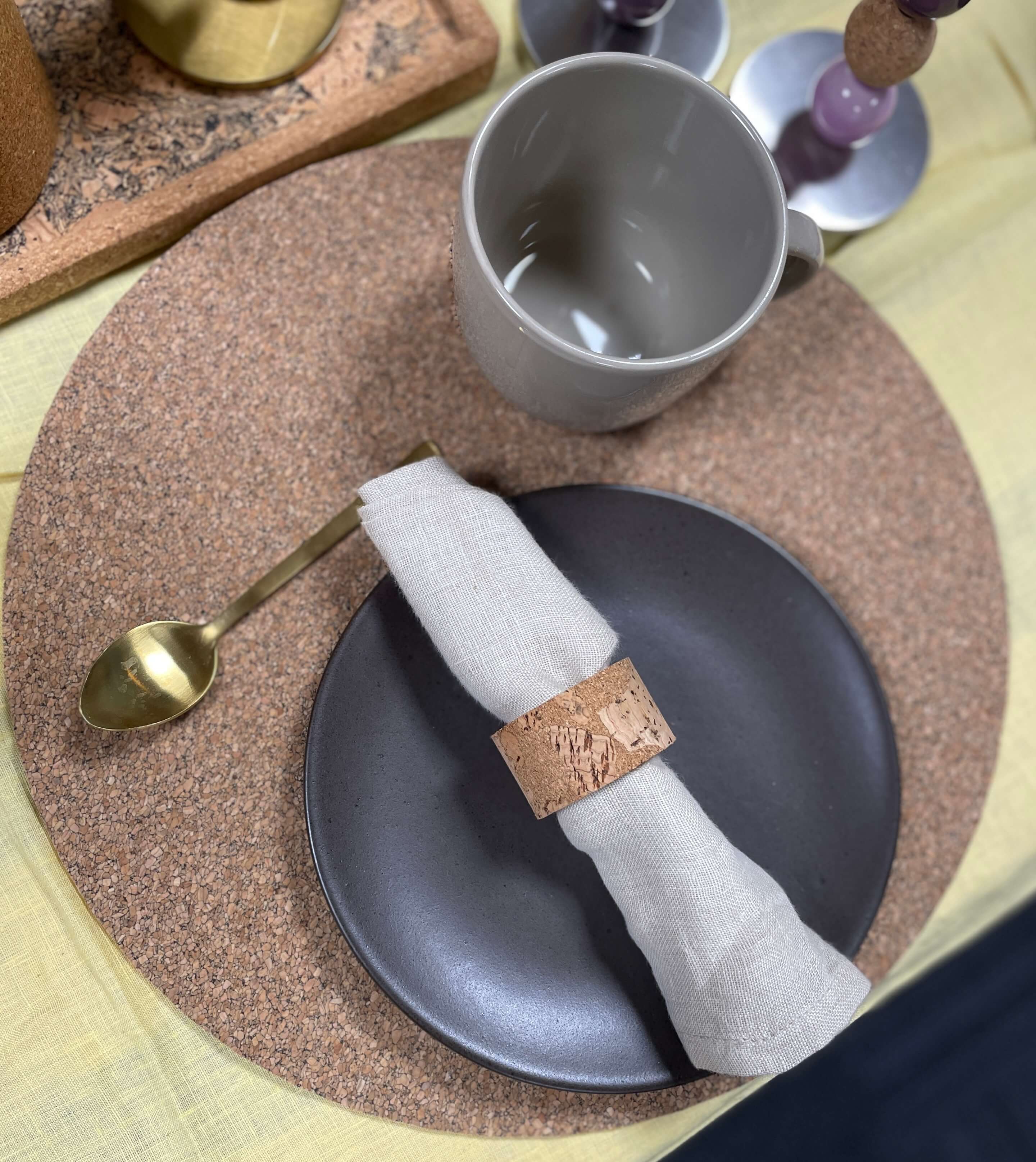 Dækkeservietten er produceret i Portugal, hvor korken høstes nænsomt fra korkegen – uden at træet fældes. Faktisk kan træet høstes igen og igen, og i hele sit liv optager det CO₂ fra luften. Det gør kork til et materiale med god energi og lang levetid.