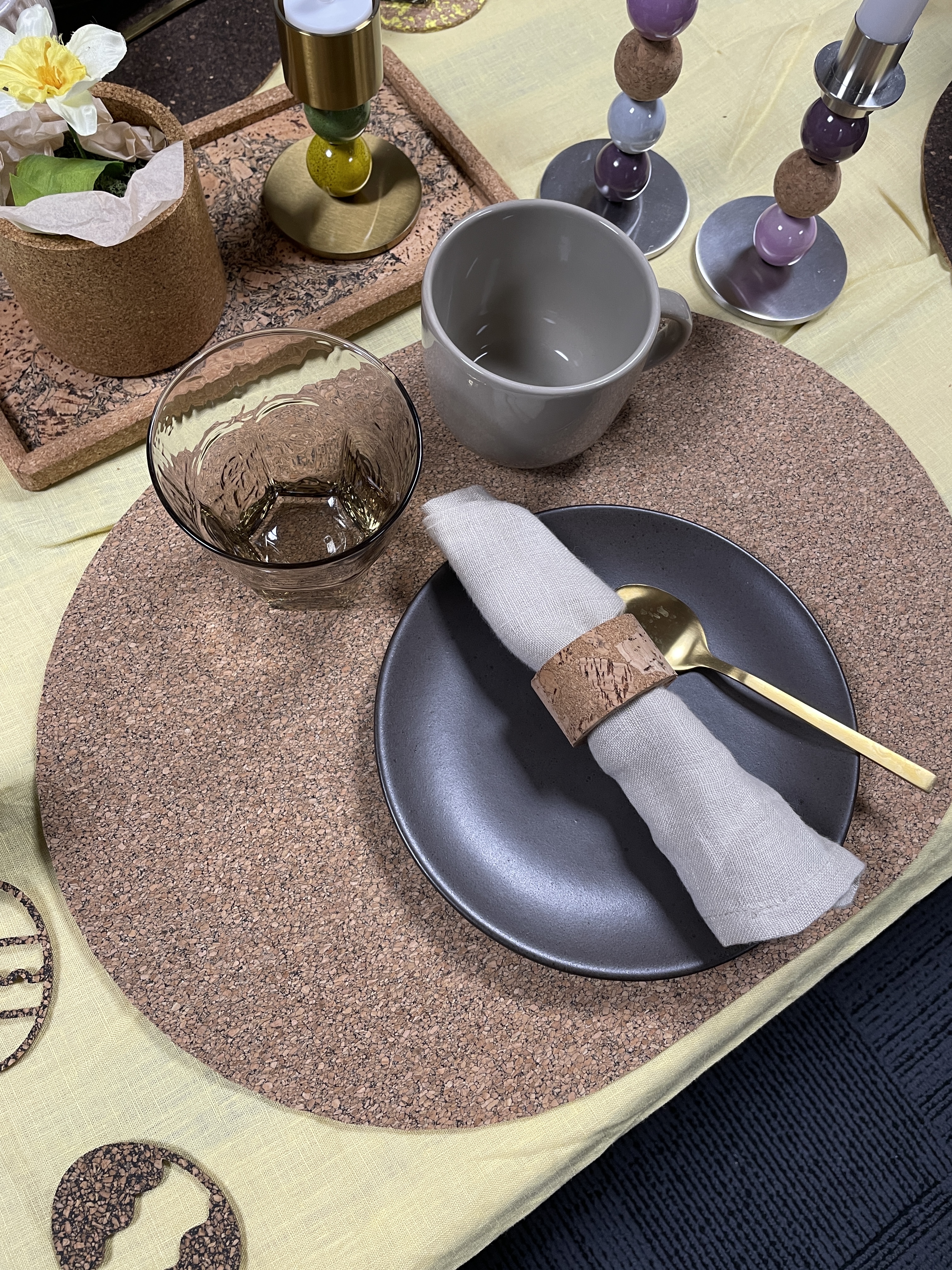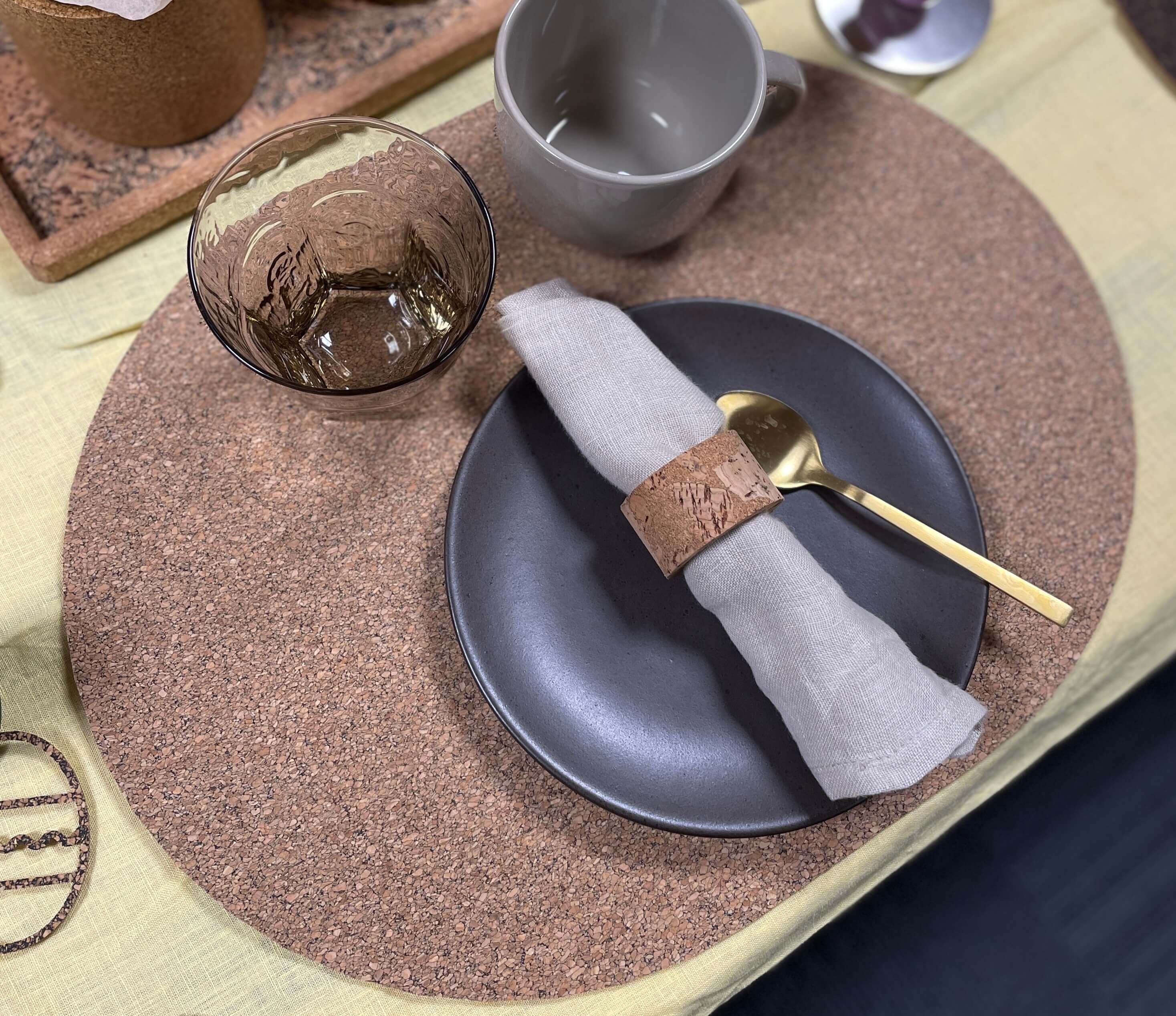 Dækkeservietten er produceret i Portugal, hvor korken høstes nænsomt fra korkegen – uden at træet fældes. Faktisk kan træet høstes igen og igen, og i hele sit liv optager det CO₂ fra luften. Det gør kork til et materiale med god energi og lang levetid.