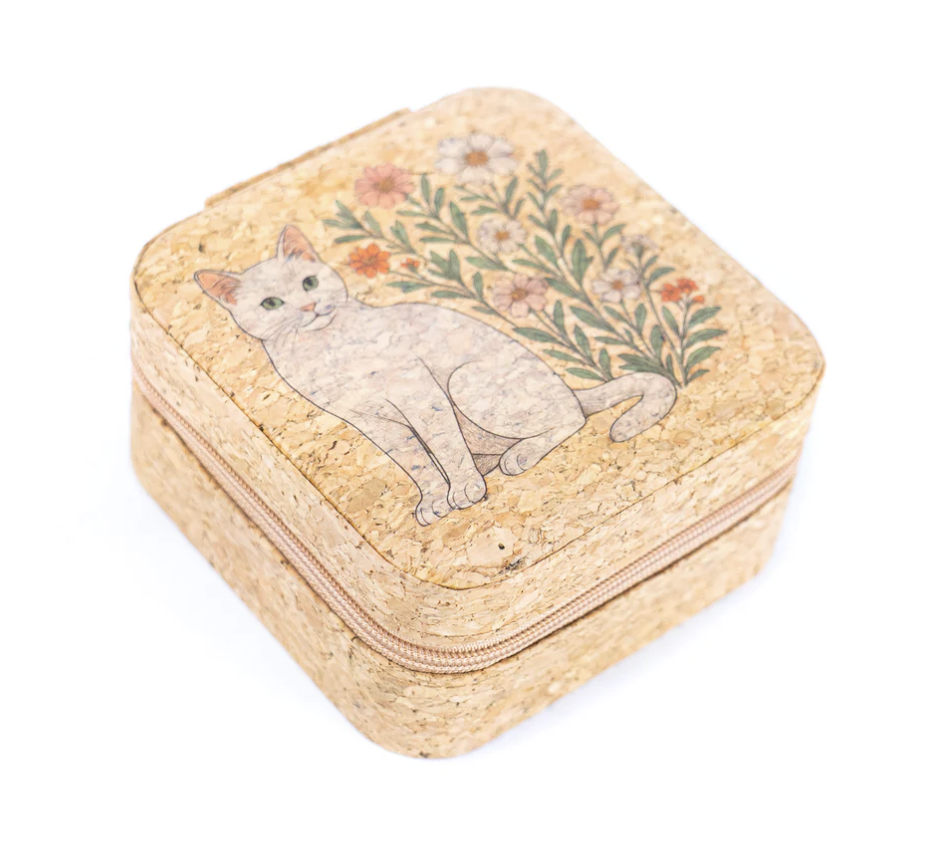 Dette smykkeskrin i ren naturkork og med kattemotiv er skabt til dig, der ønsker funktionalitet kombineret med et naturligt udtryk - og måske er du kattemenneske? Den enkle, firkantede form (9,5 x 9,5 x 5 cm) gør det perfekt til både natbordet, sminkebordet og som praktisk rejseopbevaring.