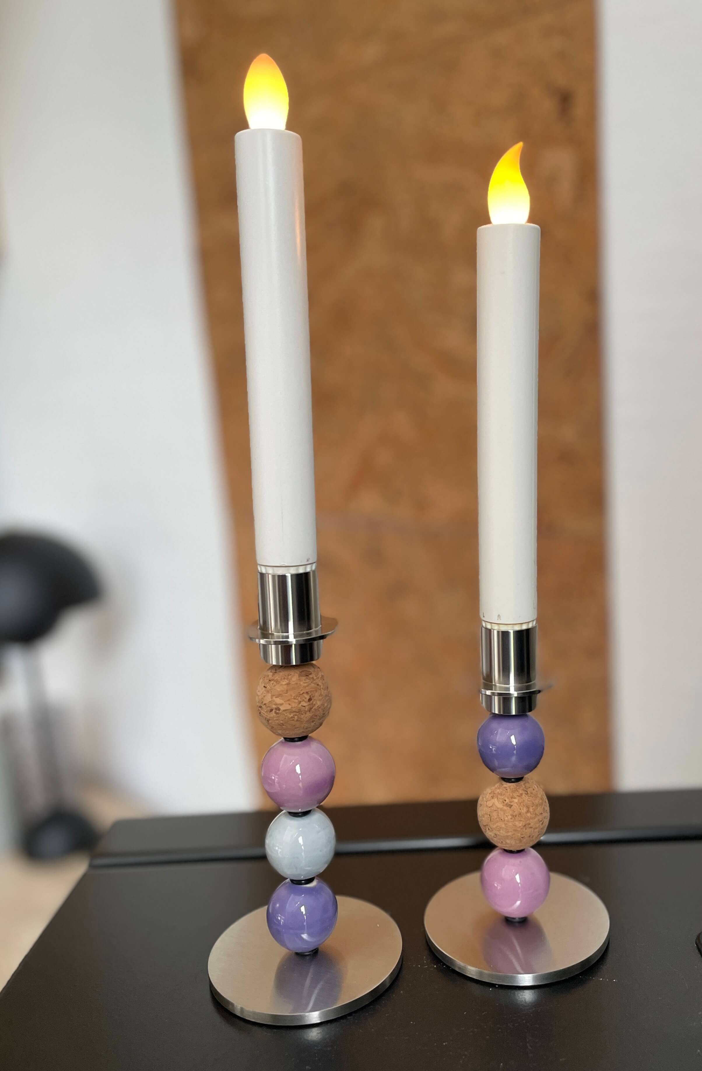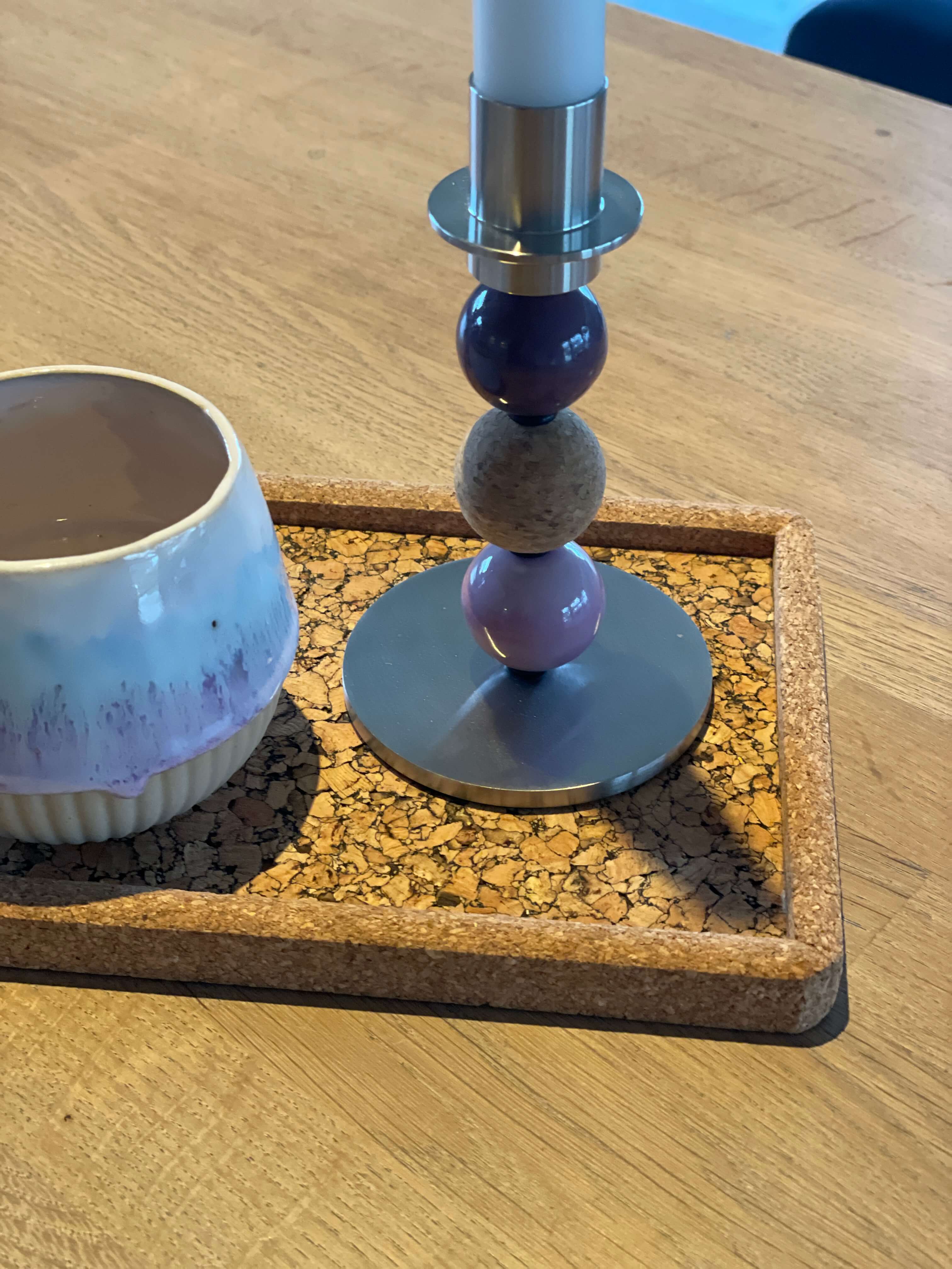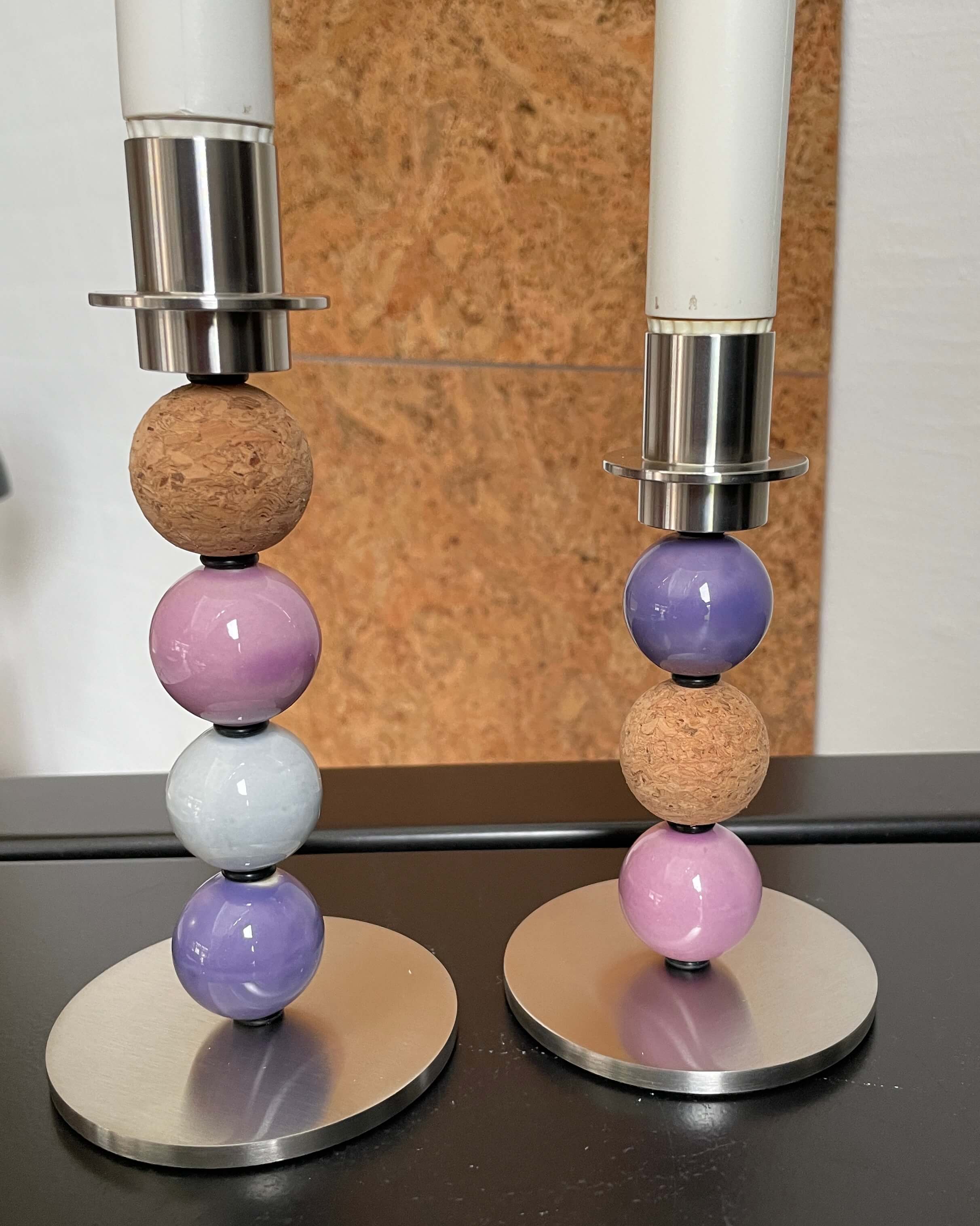 Begge stager er monteret på solide stager i stål, som giver et enkelt og stilrent udtryk, der fremhæver kuglernes farver og former. I dette sæt har jeg valgt lilla og lysegrå nuancer samt naturlig kork – de matcher så smukt sammen og skaber et roligt, harmonisk og hyggeligt udtryk. Farverne er inspireret af Gerdas kærlige sjæl – og korken, ja, den bringer det varme og naturlige ind.