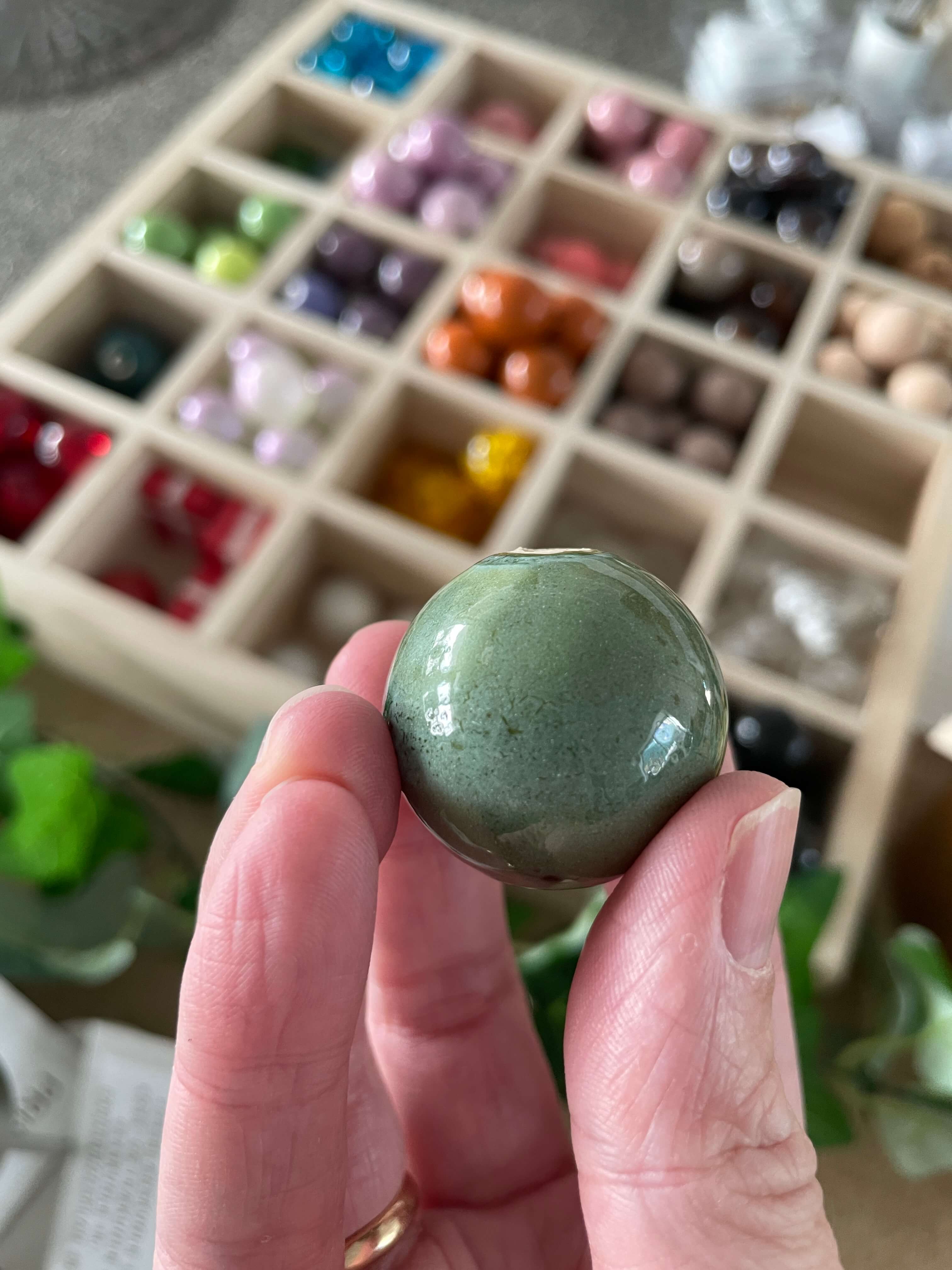 Farven er organisk og harmonisk – grøn på den afdæmpede, stilfulde måde. Den bringer varme, ro og jordforbindelse ind i hjemmet og passer smukt til både lyse, naturlige toner og dybere farvespil. En kugle, der kan følge dig året rundt: fra forårets lethed til efterårets fordybelse og julens hyggelige stunder.
