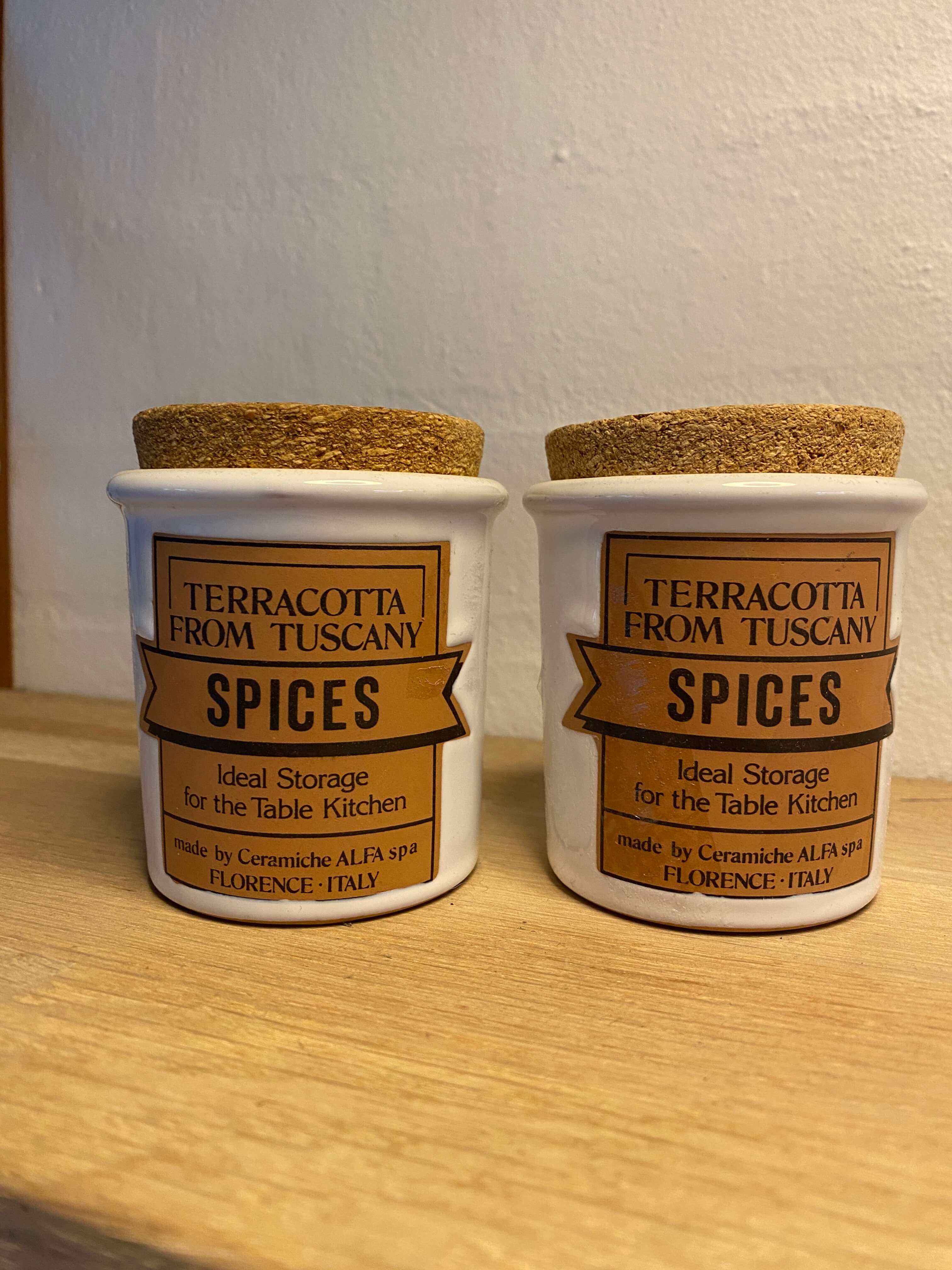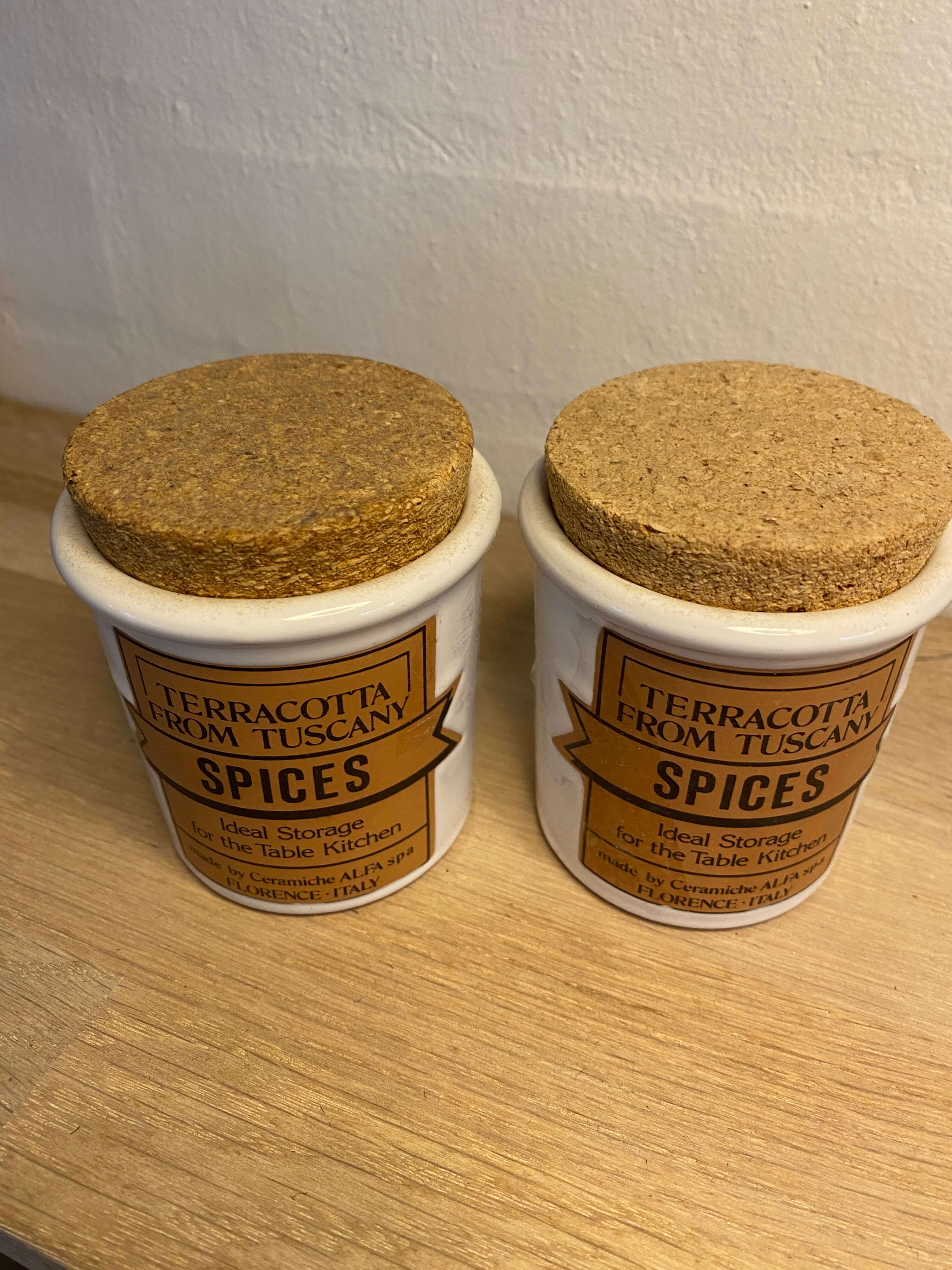 2 stk. Terracotta krydderikrukker fra Toscana med korkløg. De er meget velholdte og er rigtig flotte. De vil passe ind i et hvert køkken, og så er det dobbelt op på bæredygtighed, når krukkerne genbruges, da kork i sig selv er bæredygtigt.
