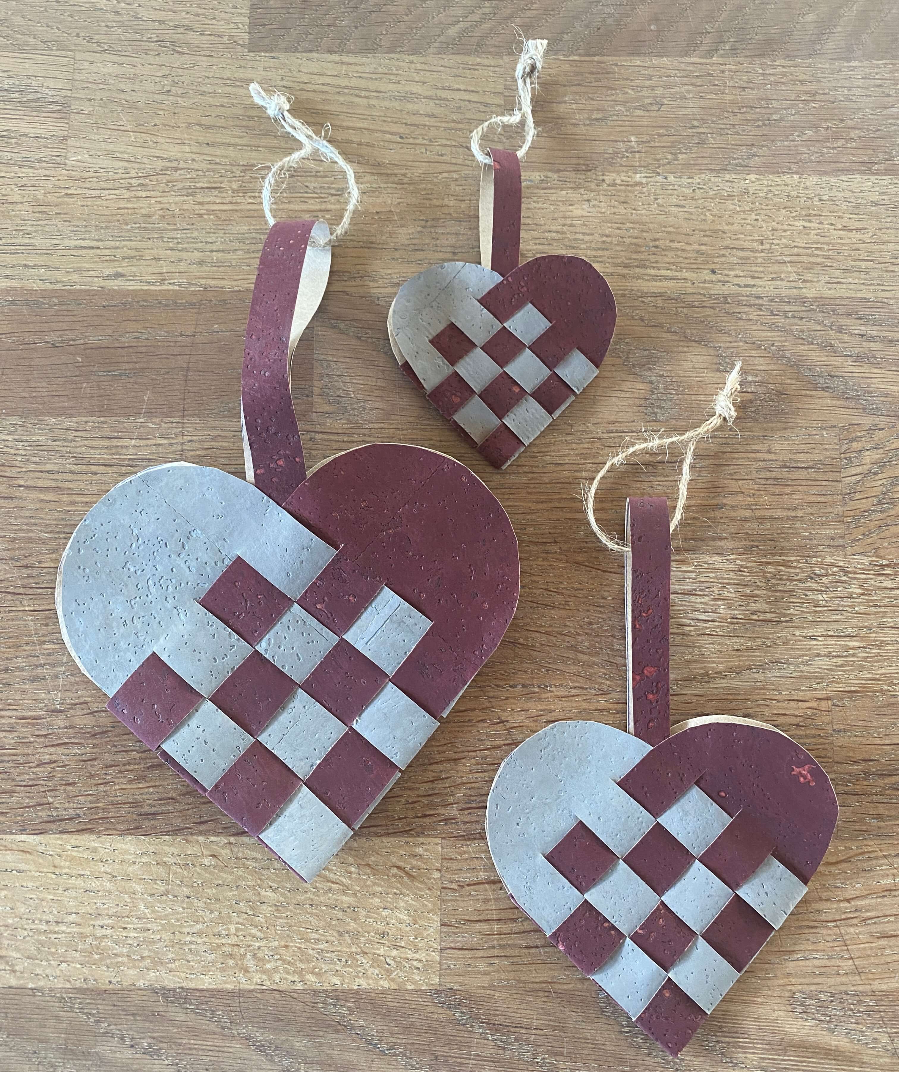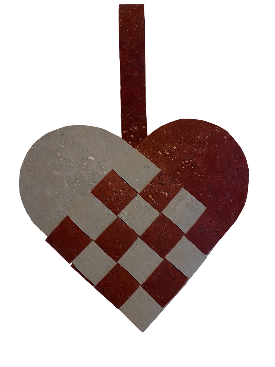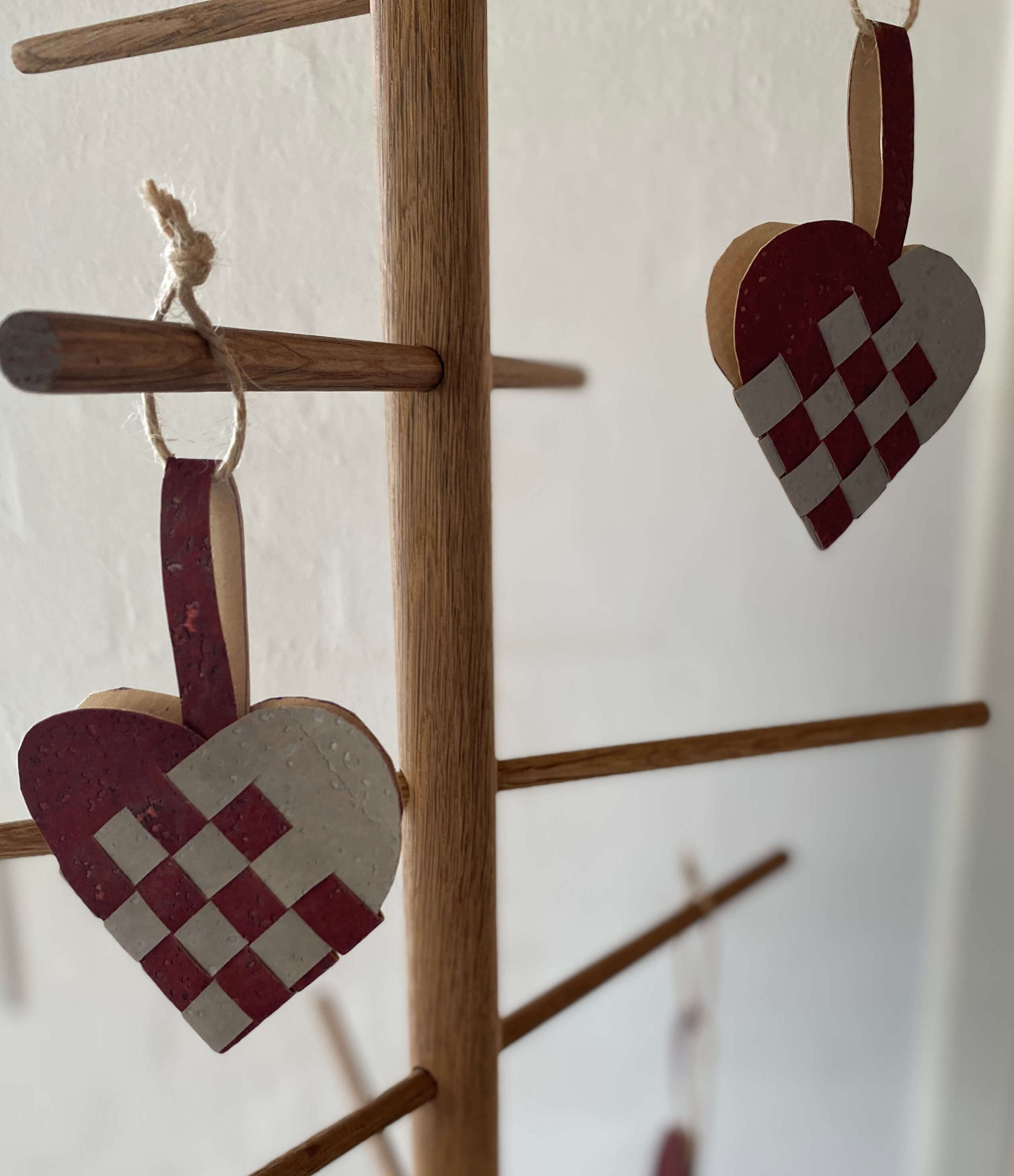 Korkpapiret, som bruges til disse julehjerter, er ikke almindeligt papir. Det er blødere, stærkere og har en stoflig struktur, der gør det oplagt til flettede hjerter. Papiret fremstilles i Portugal af barken fra korkegen – og når barken høstes, bliver træet stående og optager endnu mere CO₂. Det er en skånsom og respektfuld metode, som naturen selv har givet os.