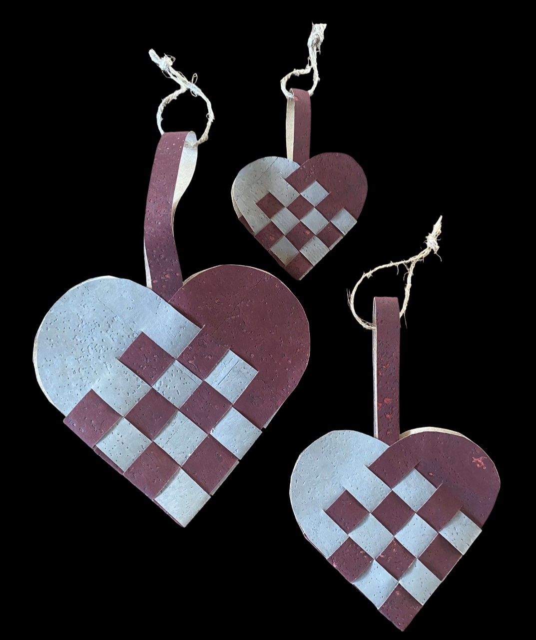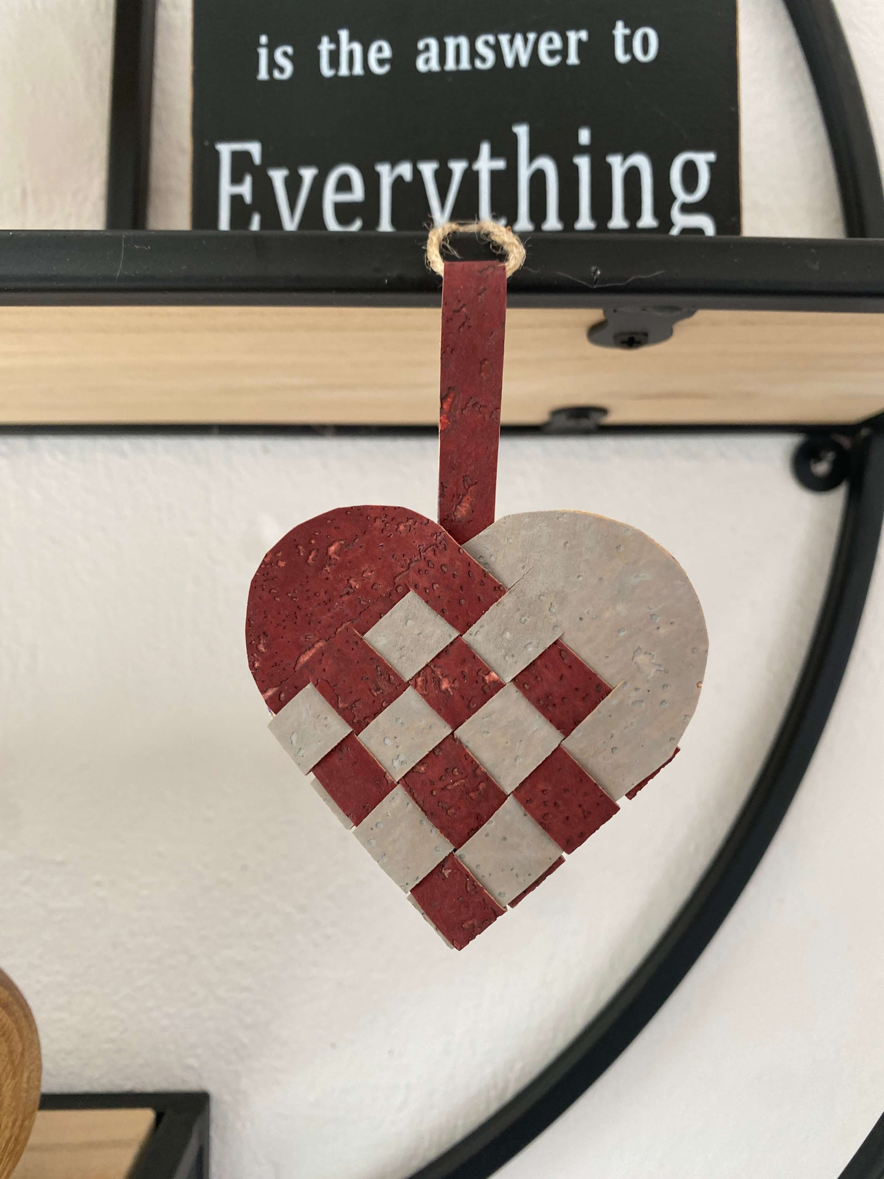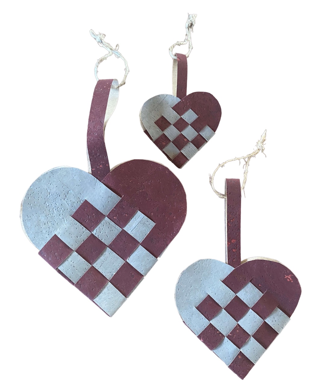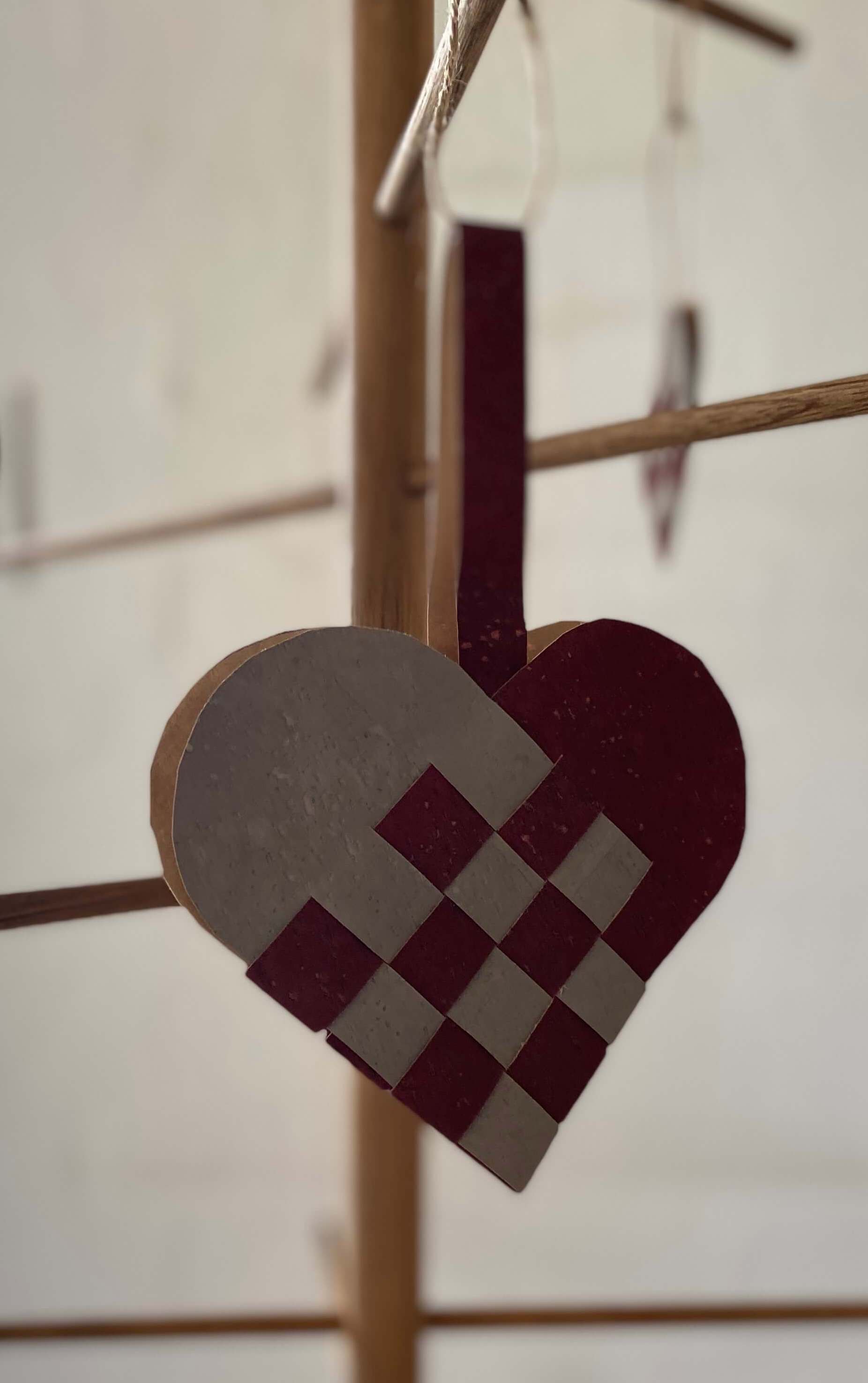 Korkpapiret, som bruges til disse julehjerter, er ikke almindeligt papir. Det er blødere, stærkere og har en stoflig struktur, der gør det oplagt til flettede hjerter. Papiret fremstilles i Portugal af barken fra korkegen – og når barken høstes, bliver træet stående og optager endnu mere CO₂. Det er en skånsom og respektfuld metode, som naturen selv har givet os.